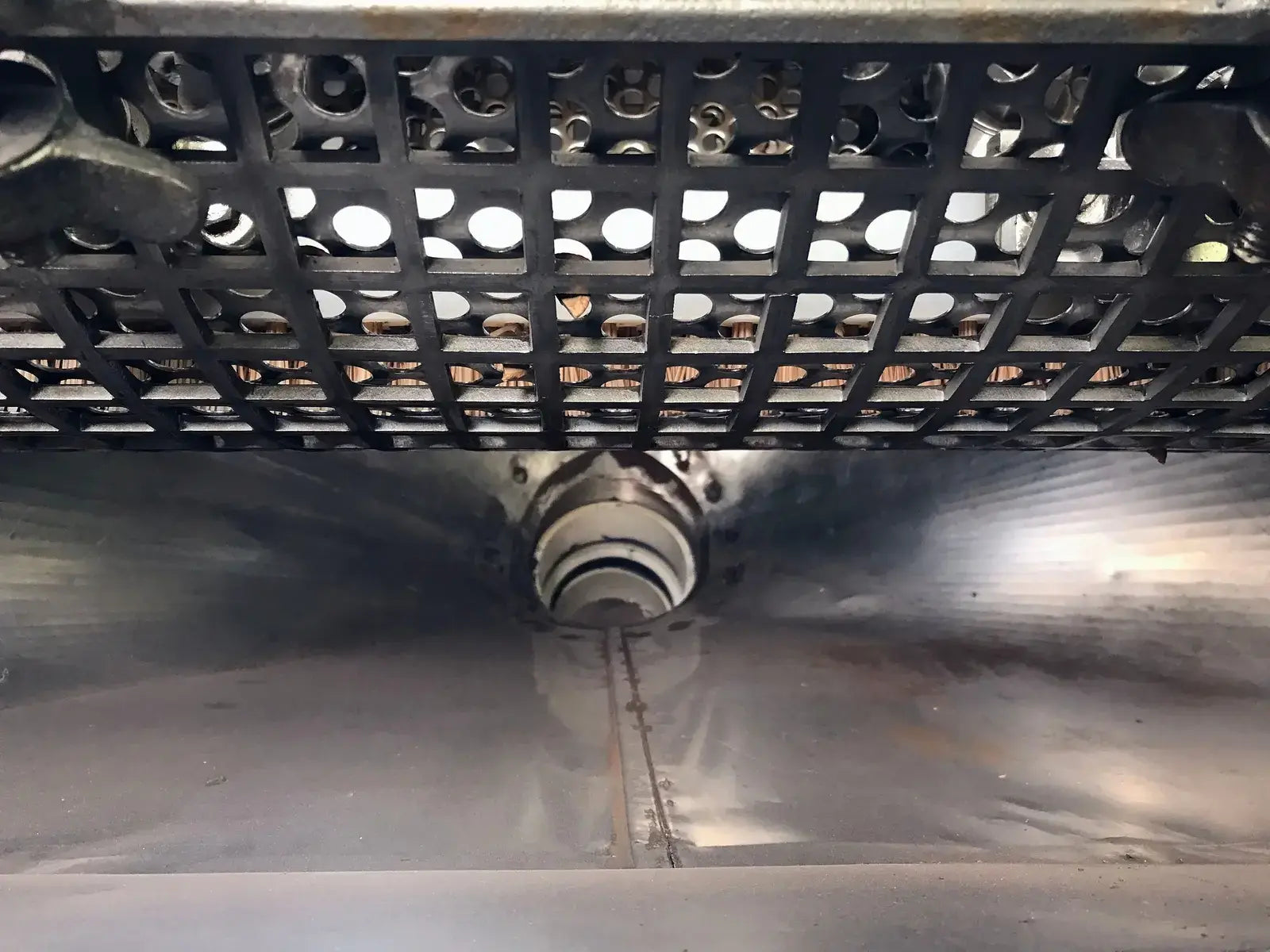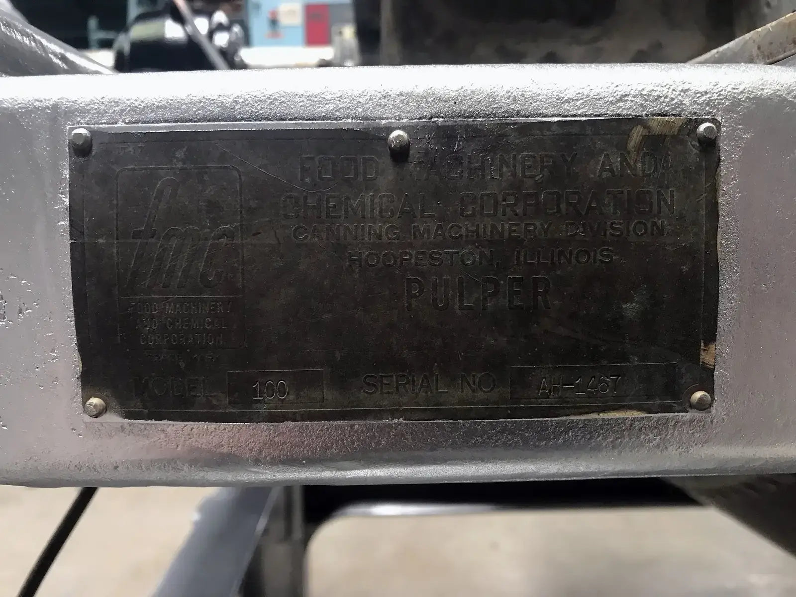 FMC Food Machinery Corp. Pulperadora / Acabadora. Modelo: 100. Serie AH-1467. Equipado con cuatro cepillos. Incluye una pantalla de 7/16 pulg. (instalada). Motor de accionamiento hidráulico. Puertos: roscados de 5 pulg. Dimensiones: 84 pulgadas de largo x 42 pulgadas de ancho x 45 pulgadas de alto.