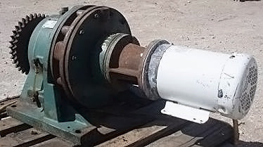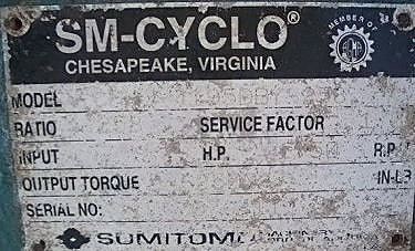 Accionamiento en línea Sumitomo SM-Cyclo. Modelo: CHHJ-1195DBY-258. Número de serie: VA0076411. Entrada: 7,9 hp/1730 rpm, torsión de salida: 62500 in-lb. Relación: 258. Diámetro del eje: 3-9/16 pulg. Número de piñones: 2. Diámetro de piñón: 1 pie. Número de dientes: 36. Paso: 1 pulg. Motor eléctrico Baldor, 5 hp, 1750 rpm, 208-230 /460 V, 13,8-13,4/6,7 amperios, 60 Hz, trifásico. Dimensiones totales: 3 pies 8 pulgadas de largo x 1 pie 8-1/2 pulgadas de ancho x 1 pie 5-1/2 pulgadas de alto