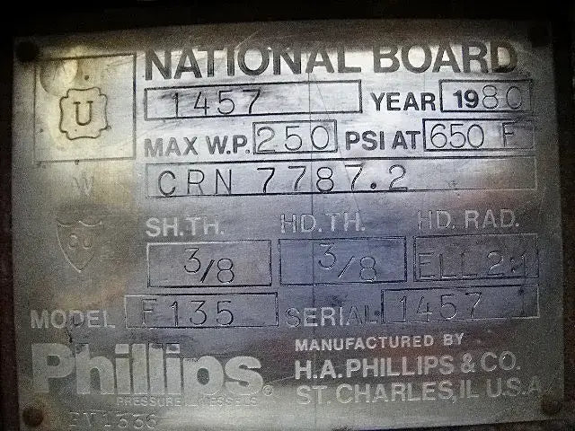 Acumulador de amoniaco. Número de Junta Nacional: 1457, Año 1980, WP Máx.: 250PSI a 650ºF, CRN 7787.2, SH.TH 3/8, HD.TH 3/8, HD.RAD ELL 2:1. Modelo: F135. Serie 1457.