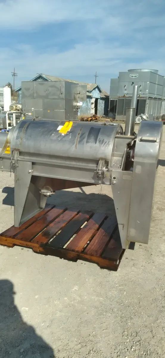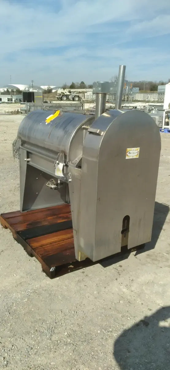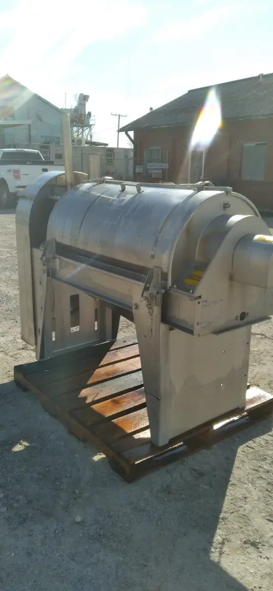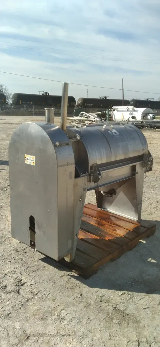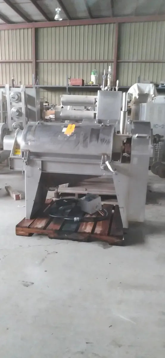 Acabador de acero inoxidable marrón 202 - S/N 204-BAAA-239 Pantallas: interior de 0,094” y respaldo de 5/8” Cuchillas: paletas desplazadas de 1-1/4” x 3 Motor: 30 HP, 60 Hz, 230/460 V, 1750 Unidad de subchasis externo RPM, impulsada a 893 RPM. Esta acabadora de paletas también se puede utilizar para despulpar, separar, extraer, deshidratar, clasificar, raspar y reacondicionar. La máquina está impulsada por un motor trifásico Premium Efficiency de 30 HP. Modelo: 202, Número de serie: 204BAAA-238, Dimensiones 72L x 32w x 61H. ¿Cómo funciona? El producto picado se recoge y se empuja hacia arriba hasta llegar a una pantalla. Al llegar a la criba, un brazo de paleta hace circular el producto picado y lo presiona a través de la criba. El material que atraviesa la pantalla se convierte en un puré espeso con alto contenido de sólidos. El material sobrante que no pasa, como semillas, defectos y “material duro”, se empuja hacia el borde de la pantalla como desperdicio de baja humedad.