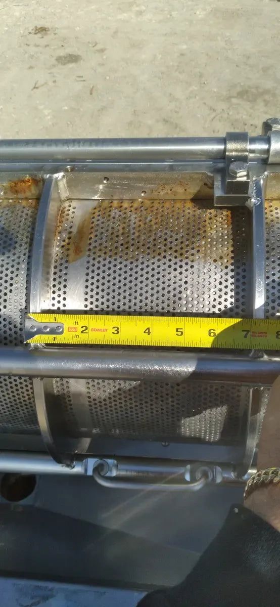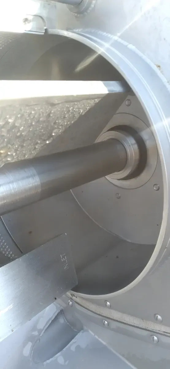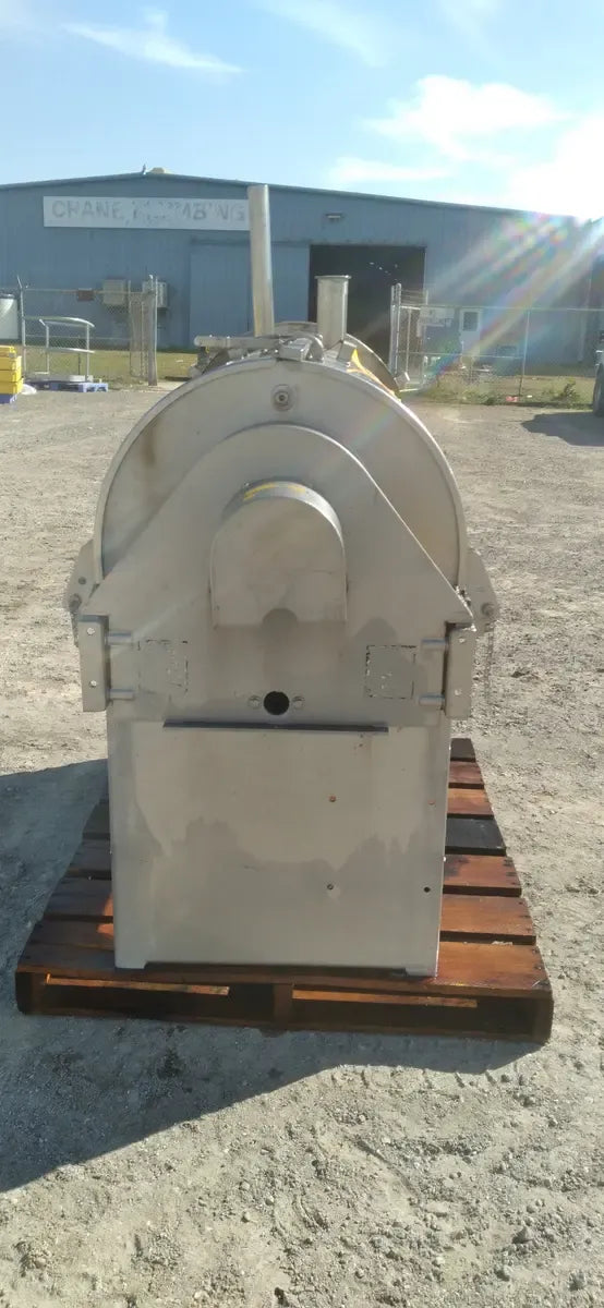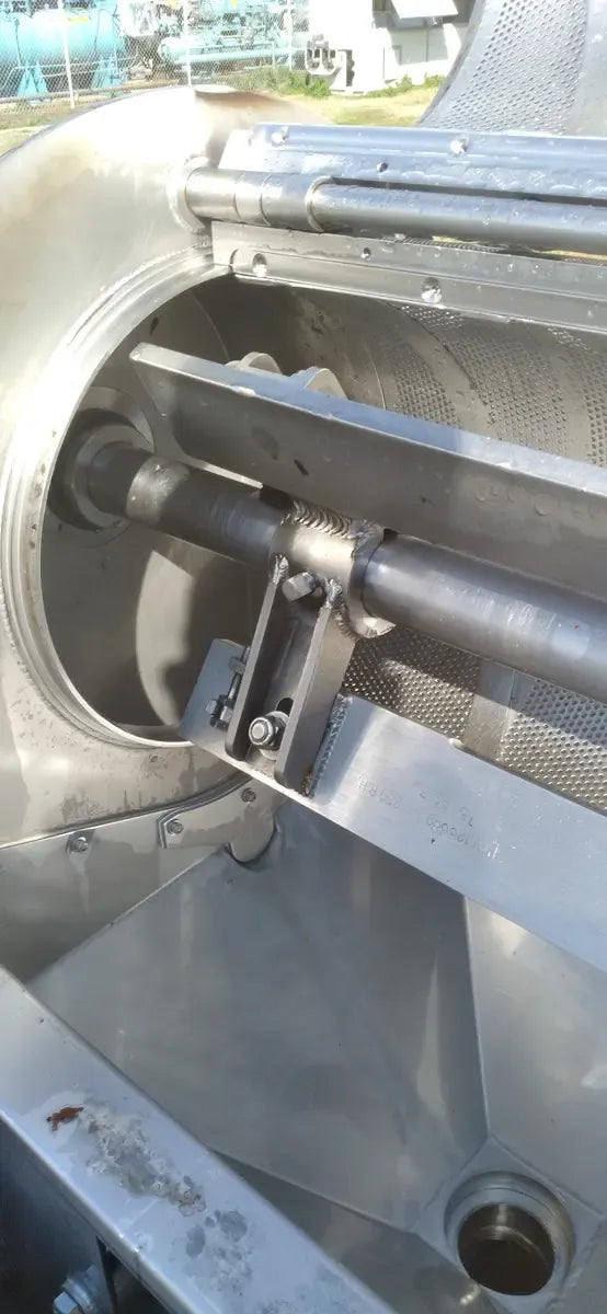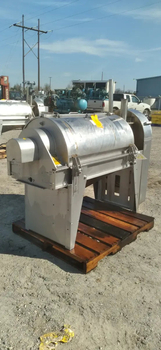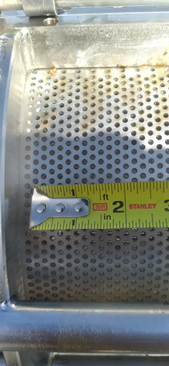 Acabador de acero inoxidable marrón 202 - S/N 204-BAAA-239 Pantallas: interior de 0,094” y respaldo de 5/8” Cuchillas: paletas desplazadas de 1-1/4” x 3 Motor: 30 HP, 60 Hz, 230/460 V, 1750 Unidad de subchasis externo RPM, impulsada a 893 RPM. Esta acabadora de paletas también se puede utilizar para despulpar, separar, extraer, deshidratar, clasificar, raspar y reacondicionar. La máquina está impulsada por un motor trifásico Premium Efficiency de 30 HP. Modelo: 202, Número de serie: 204BAAA-238, Dimensiones 72L x 32w x 61H. ¿Cómo funciona? El producto picado se recoge y se empuja hacia arriba hasta llegar a una pantalla. Al llegar a la criba, un brazo de paleta hace circular el producto picado y lo presiona a través de la criba. El material que atraviesa la pantalla se convierte en un puré espeso con alto contenido de sólidos. El material sobrante que no pasa, como semillas, defectos y “material duro”, se empuja hacia el borde de la pantalla como desperdicio de baja humedad.