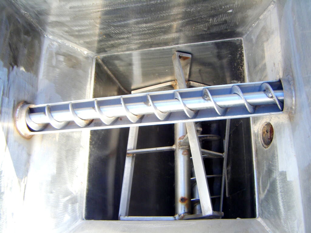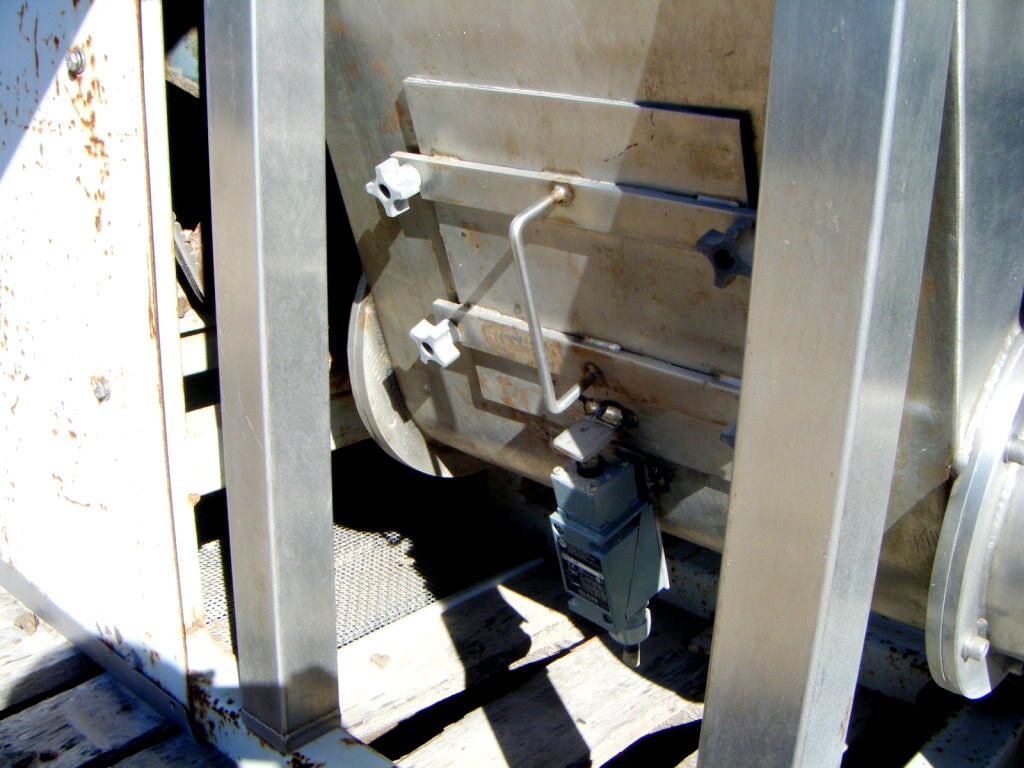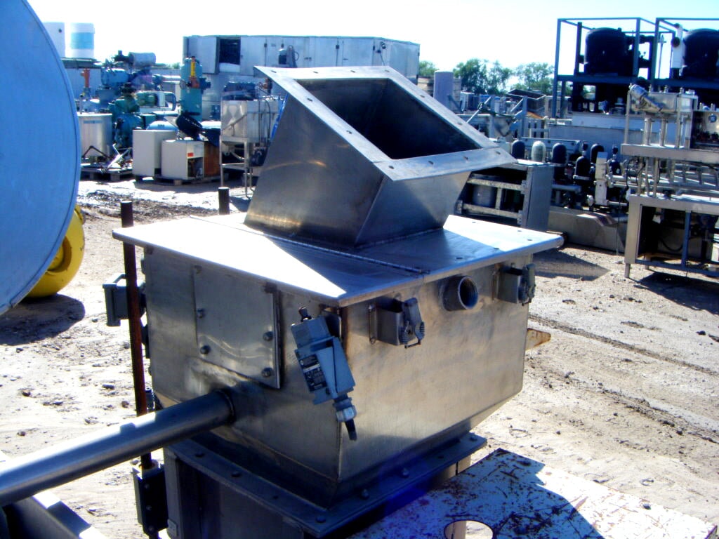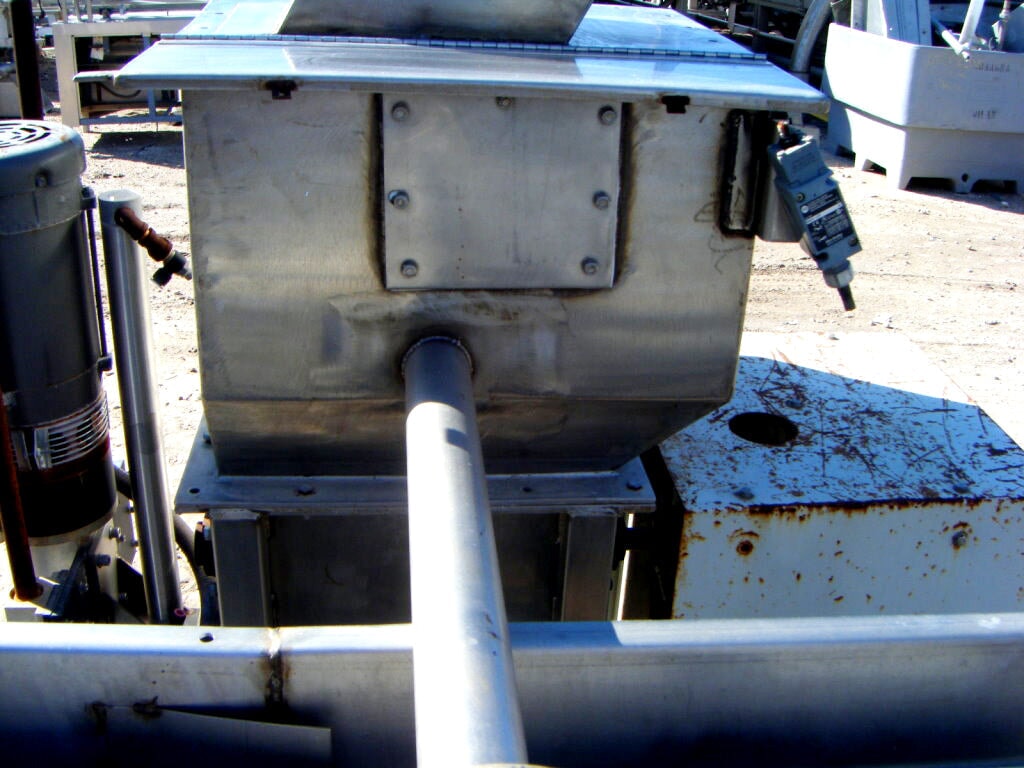 Alimentador de tornillo volumétrico. (2) Tornillos sin fin. (1) Batidora de cinta. Sinfín de tornillo inferior: 2 pulg. de diámetro. x 18-1/2 pulg. L. Motor Underwriter Laboratories, 1-1/2 hp, 1725 rpm, 575 V, 2 amperios. Sinfín de tornillo superior: 7 pulg. de diámetro. x 16 pulg. L. Motor WEG, 5 hp, 1740 rpm, 575 V, 5.6 amperios, 60 Hz. Dodge Gear Drive, relación 15,55, 112 rpm (final). Licuadora de cinta: 14 pulg. de diámetro. x 16 pulg. L. Entradas: (1) alimentación de 10 pulg. x 10 pulg. con (12) orificios para pernos de 1/4 pulg. Salidas: (1) Conexión NPT de 2 pulg. Dimensiones totales: 67 pulgadas de largo x 65 pulgadas de ancho x 61 pulgadas de alto (H14).