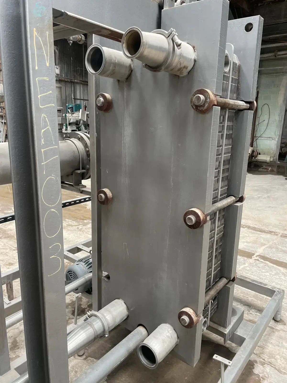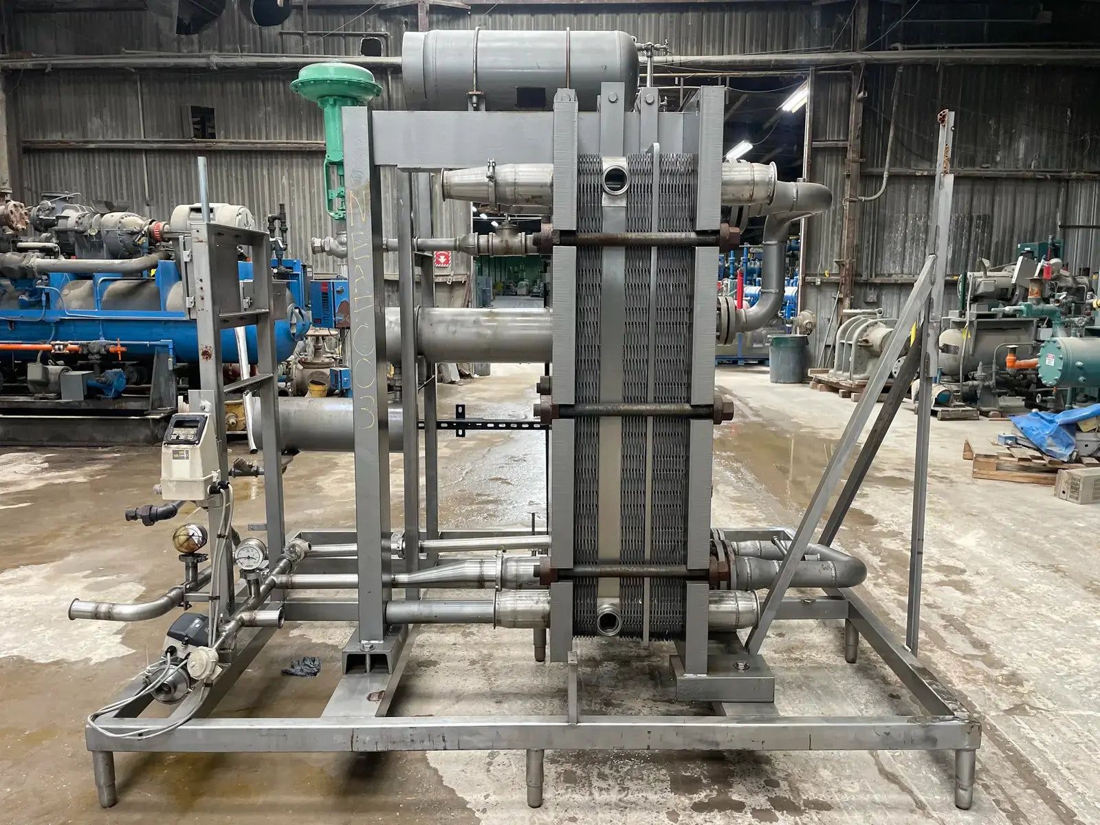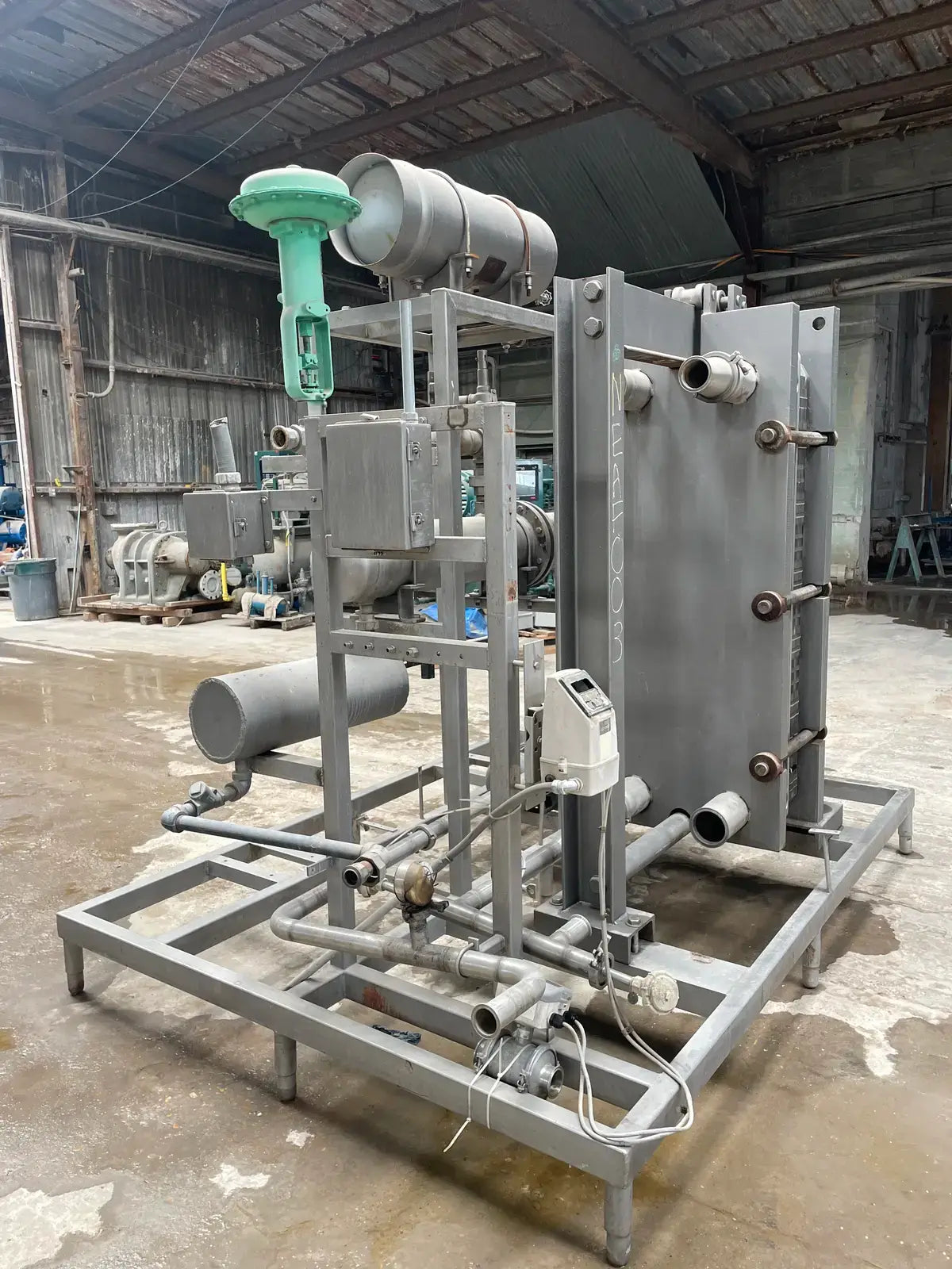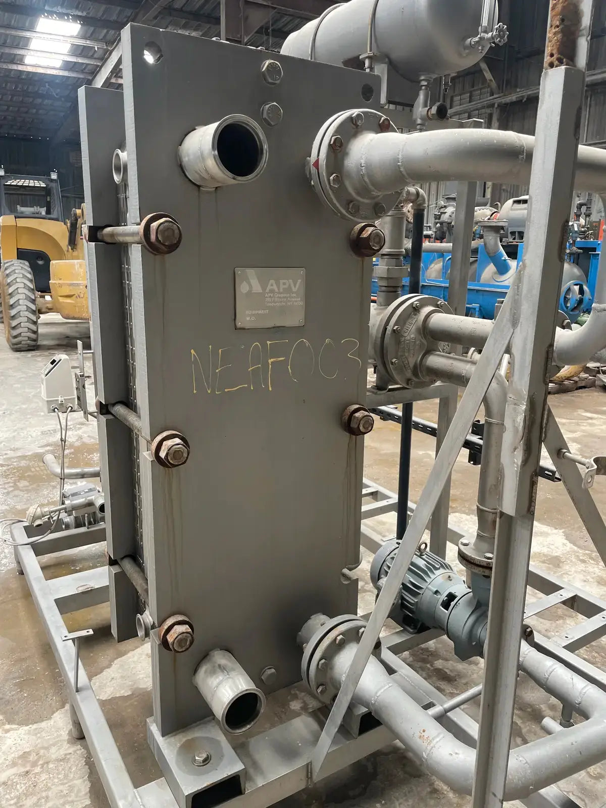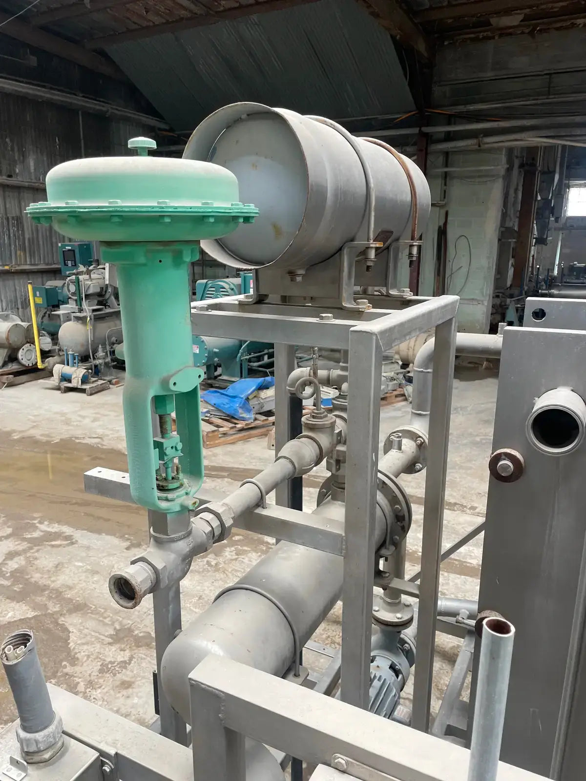 APV SR6 HTST. Modelo: SR6GLM. S/N: 25059. Número de placas: 51. Superficie de transferencia de calor: aprox. 325.125 pies cuadrados. Bomba centrífuga de agua caliente con motor. Sistema de caudalímetro Danfoss Magflo, Modelo: MAG1100 Food, S/N: 141702T280, tamaño DN: 50, temperatura del fluido: -20 a 150 °C, revestimiento: ceRam Industriesic, fuente de alimentación: 115/230 Vac, 50-60 Hz. Actuador de válvula Fisher, tipo: 667, S/N: CN 841808, tamaño: 34, recorrido: 3/4 pulg., rango de operación: 3-15 psi, clasificación: 250/100 °F, tapón: 316SS, vástago: 316SS , asiento: 316SS, carrocería: bronce. 1990 Tanque de presión Wessels Co.: 10 galones, MAWP: 150 psi a 450 °F, MDMT: -20 °F a 150 psi. Entradas: (1) 1-1/2 pulg. de diámetro. NPT, (2) 2-1/2 pulg. de diámetro. Línea S, (1) 4 pulg. de diámetro. Línea S. Salidas: (1) 1-1/4 pulg. de diámetro. bisel con hexágono, (3) 2-1/2 pulg. de diámetro. Línea S, (1) 3 pulg. de diámetro. Línea S, (1) 4 pulg. de diámetro. Línea S. Dimensiones totales: 98 pulgadas de largo x 72 pulgadas de ancho x 95 pulgadas de alto.