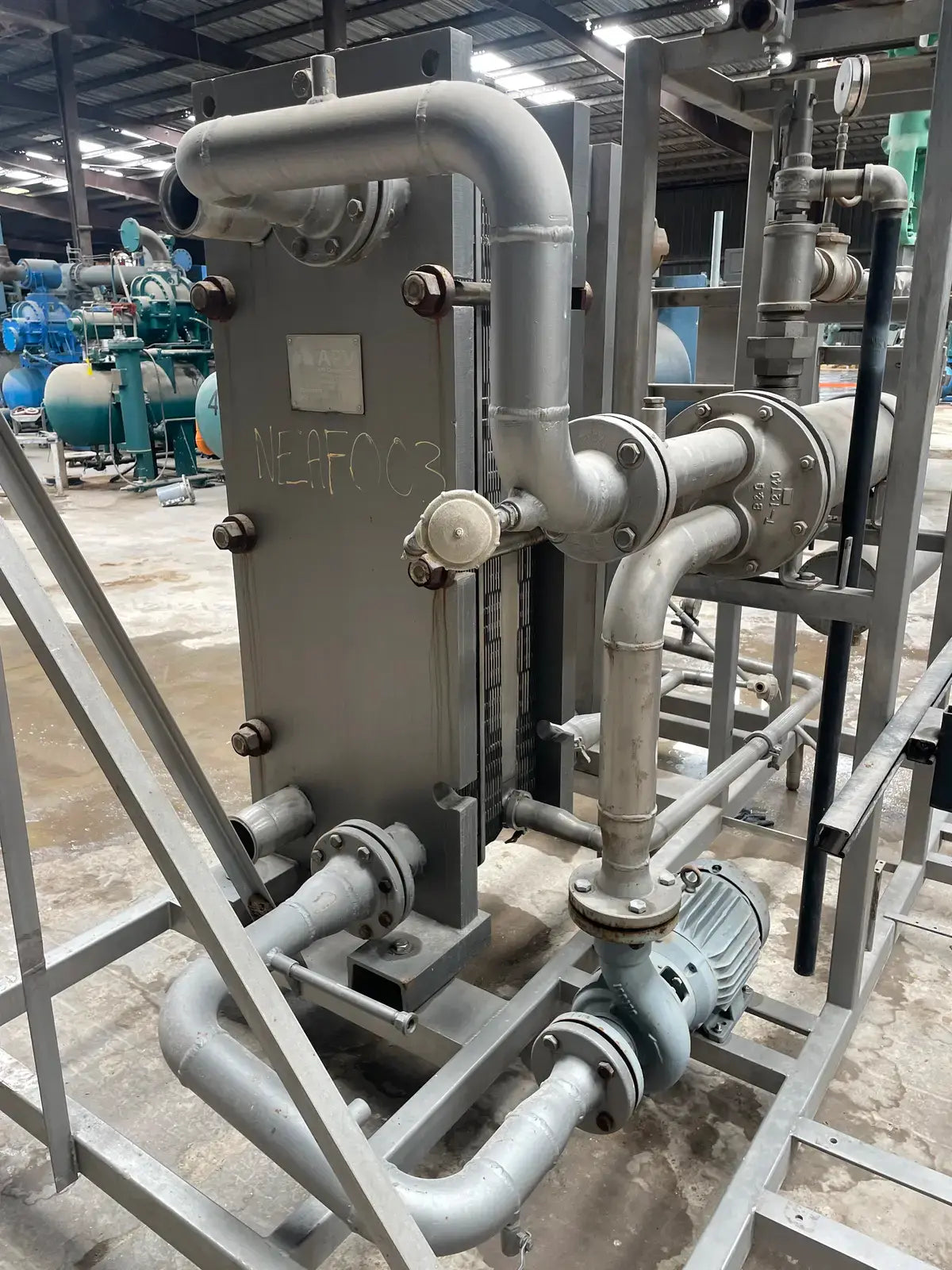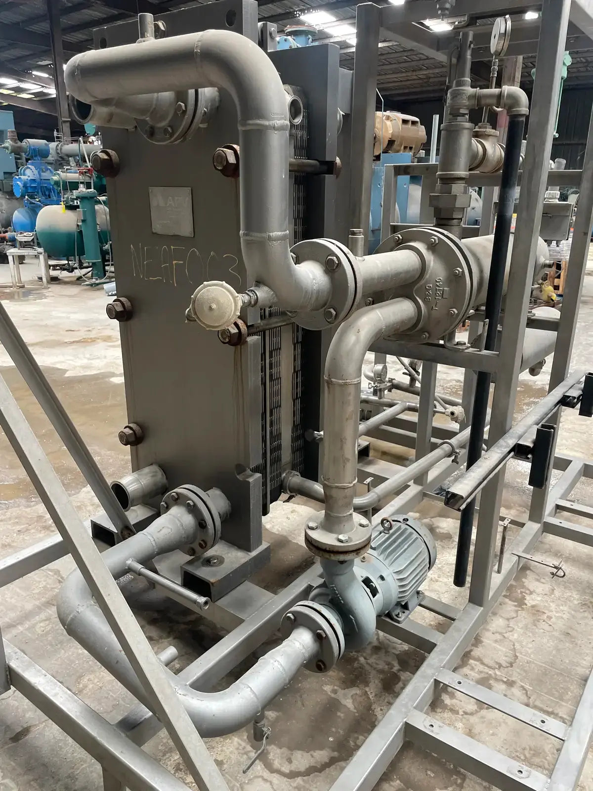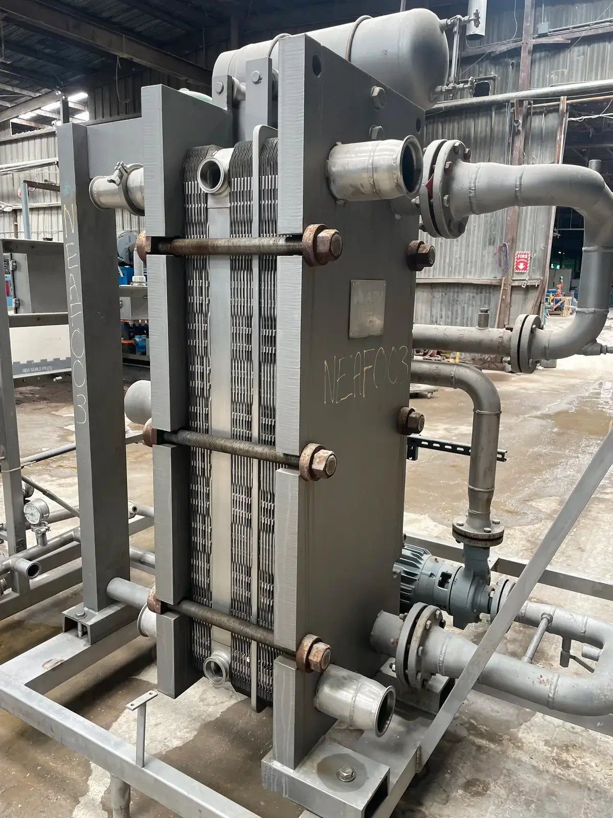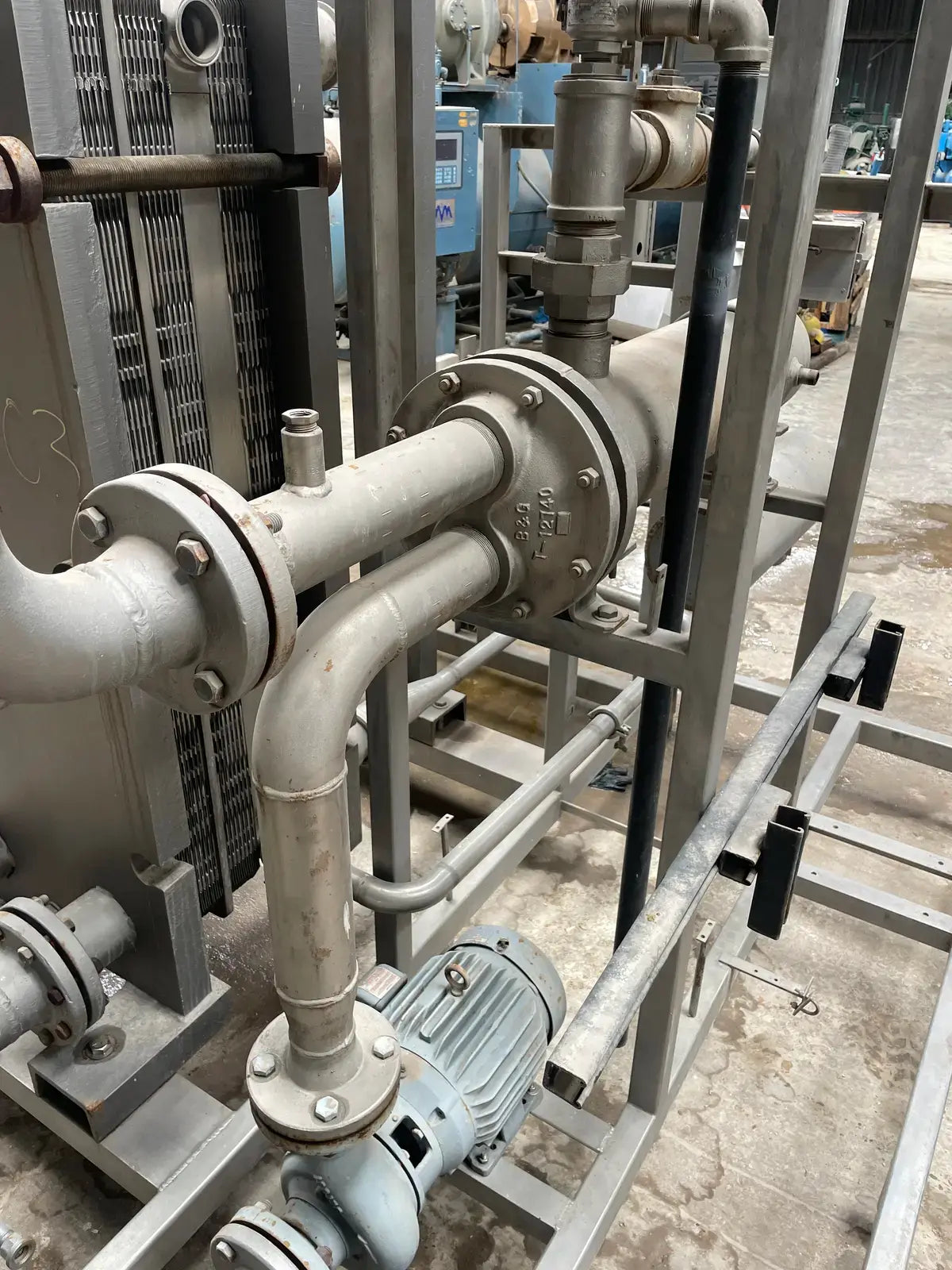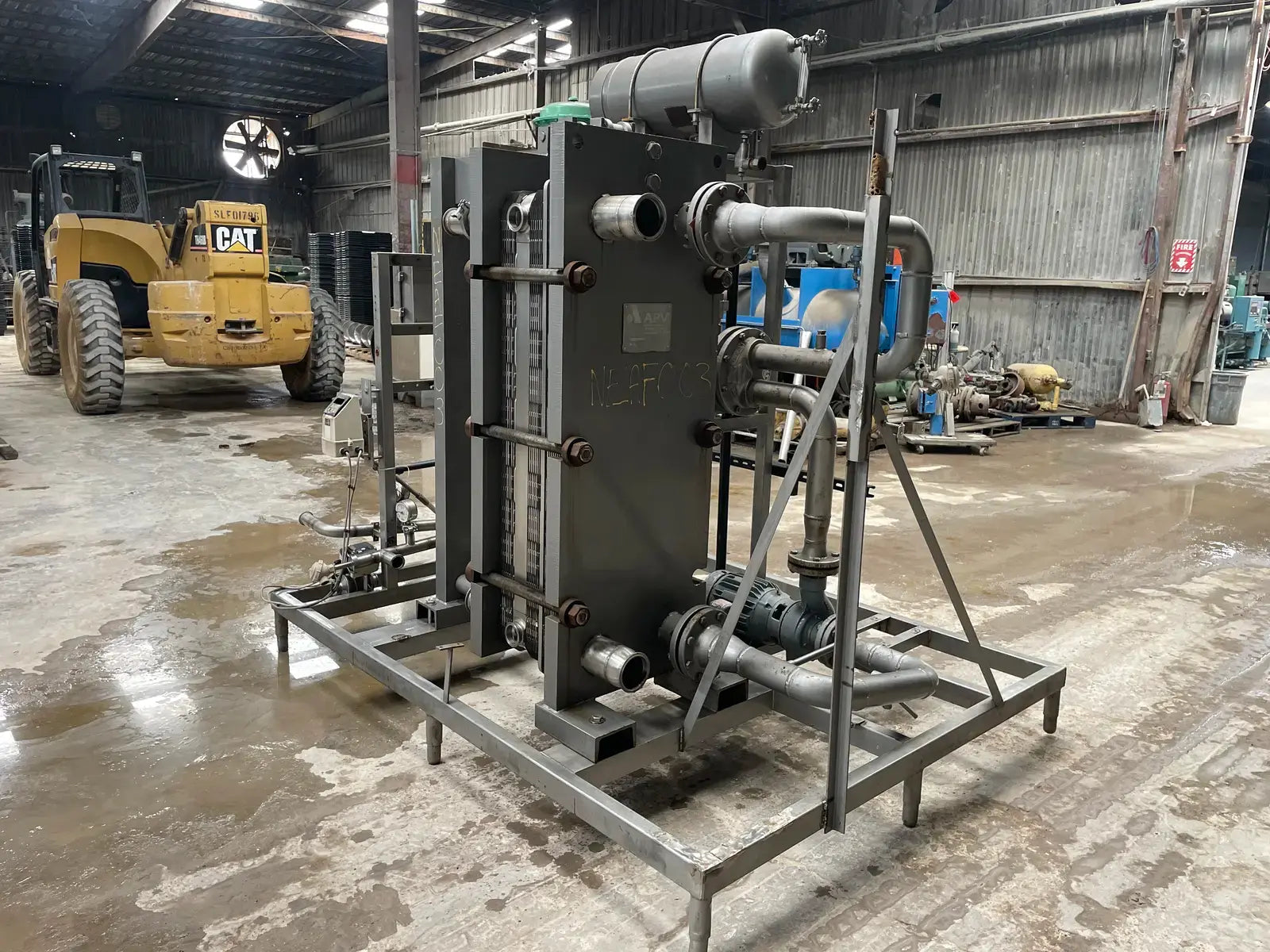 APV SR6 HTST. Modelo: SR6GLM. S/N: 25059. Número de placas: 51. Superficie de transferencia de calor: aprox. 325.125 pies cuadrados. Bomba centrífuga de agua caliente con motor. Sistema de caudalímetro Danfoss Magflo, Modelo: MAG1100 Food, S/N: 141702T280, tamaño DN: 50, temperatura del fluido: -20 a 150 °C, revestimiento: ceRam Industriesic, fuente de alimentación: 115/230 Vac, 50-60 Hz. Actuador de válvula Fisher, tipo: 667, S/N: CN 841808, tamaño: 34, recorrido: 3/4 pulg., rango de operación: 3-15 psi, clasificación: 250/100 °F, tapón: 316SS, vástago: 316SS , asiento: 316SS, carrocería: bronce. 1990 Tanque de presión Wessels Co.: 10 galones, MAWP: 150 psi a 450 °F, MDMT: -20 °F a 150 psi. Entradas: (1) 1-1/2 pulg. de diámetro. NPT, (2) 2-1/2 pulg. de diámetro. Línea S, (1) 4 pulg. de diámetro. Línea S. Salidas: (1) 1-1/4 pulg. de diámetro. bisel con hexágono, (3) 2-1/2 pulg. de diámetro. Línea S, (1) 3 pulg. de diámetro. Línea S, (1) 4 pulg. de diámetro. Línea S. Dimensiones totales: 98 pulgadas de largo x 72 pulgadas de ancho x 95 pulgadas de alto.