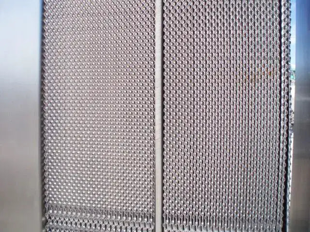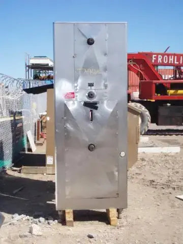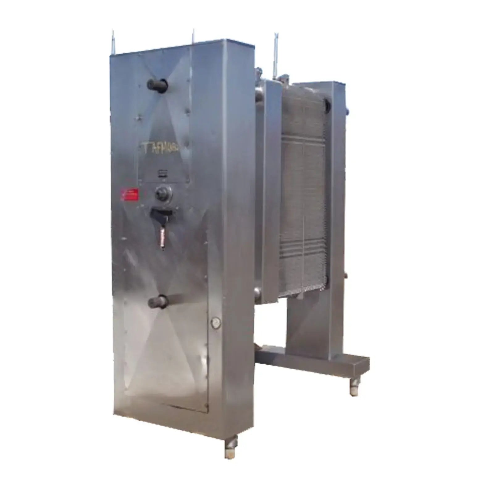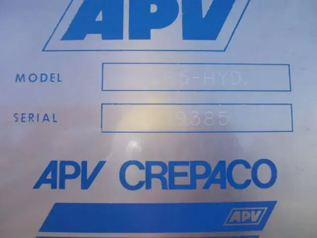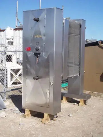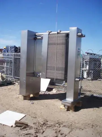 Intercambiador de calor de placas de acero inoxidable APV. Modelo: CR5-HYD. S/N: 19385. Número de placas: 84. Los materiales de construcción incluyen acero inoxidable 316. Área de superficie aproximada de transferencia de calor: 470 pies cuadrados. Dimensiones del paquete de placas: 4 pies 10 pulgadas de largo x 1 pie 2 pulgadas de ancho. Presión máxima de funcionamiento: 225 psi. Volumen del producto: 29,5 galones. El uso anterior implicó la reducción de temperatura de 8000 lbs. por hora de un puré de calabaza utilizando agua y glicol. Entradas/salidas: (8) 3 pulg. de diámetro. triple abrazadera. Dimensiones totales: 7 pies de largo x 3 pies 1 pulgada de ancho x 8 pies 5 pulgadas de alto (ACN922-87).