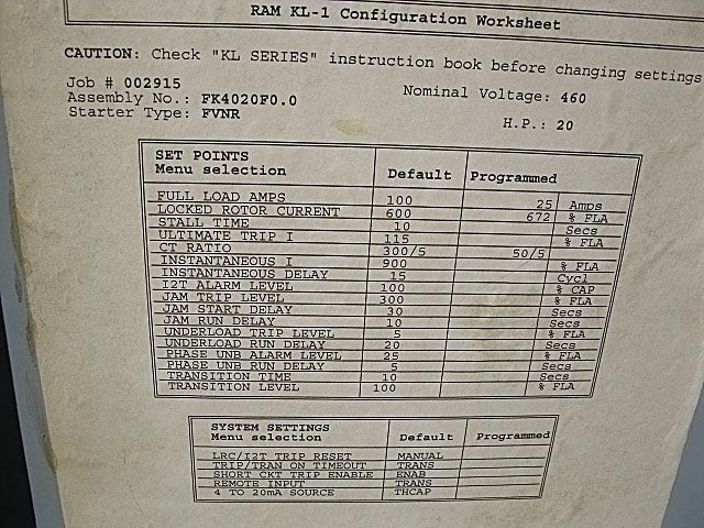 - Problemas o problemas conocidos: Note: Currently missing the Ram controller. The Calco Manufacturing KL-1 motor protection module has been removed and sold separately.