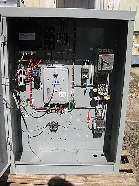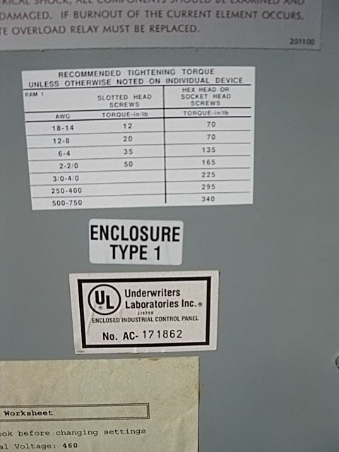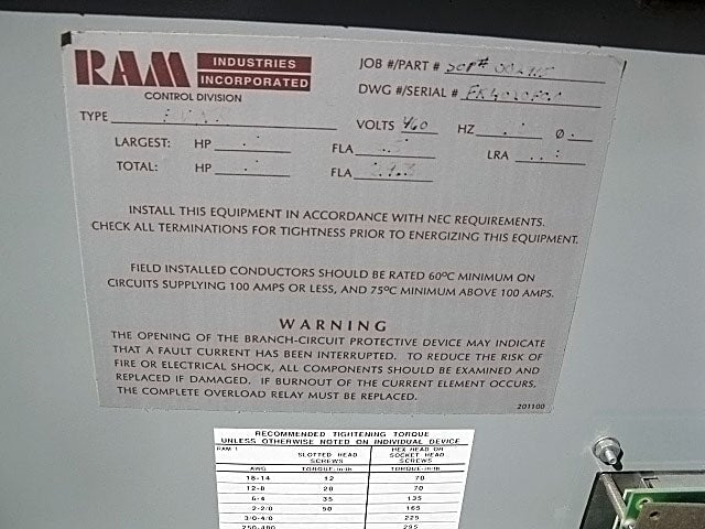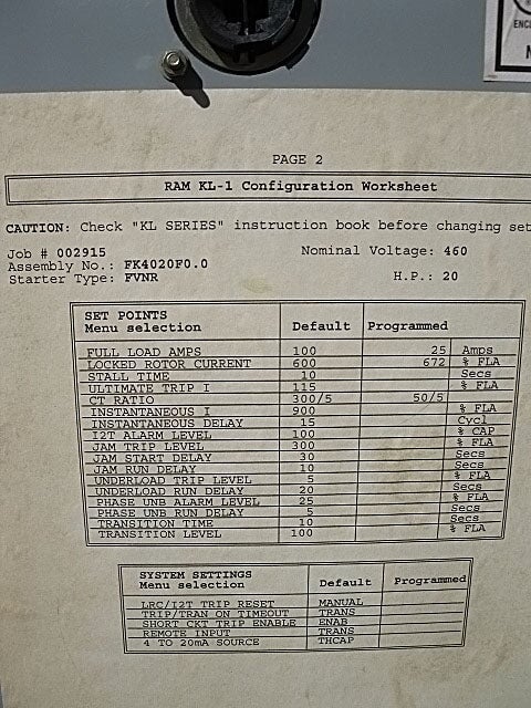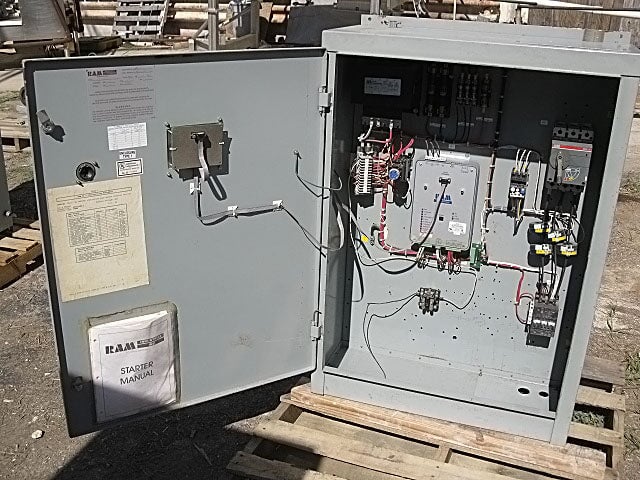 Arrancador de compresor FVNR de Ram Industries Incorporated. SO no: 002915, PO no: p112178, orden de venta no: 267276-03. Tipo de envolvente: NEMA 1. Voltaje nominal: 460 V, 20 HP. Tipo de desconexión principal: disyuntor, 600 V, 50 amperios. *Nota: el módulo de protección del motor KL-1 de Calco Manufacturing se ha retirado y se vende por separado. Dimensiones totales: 2 pies 6 pulgadas de largo x 1 pie 5 pulgadas de ancho x 3 pies 7-1/2 pulgadas de alto (H11).