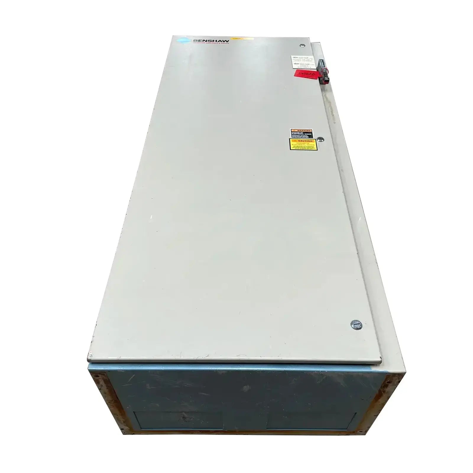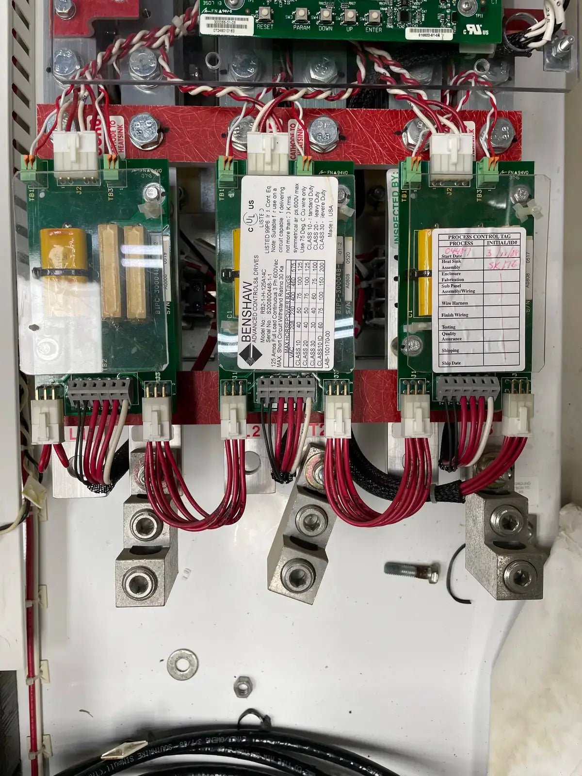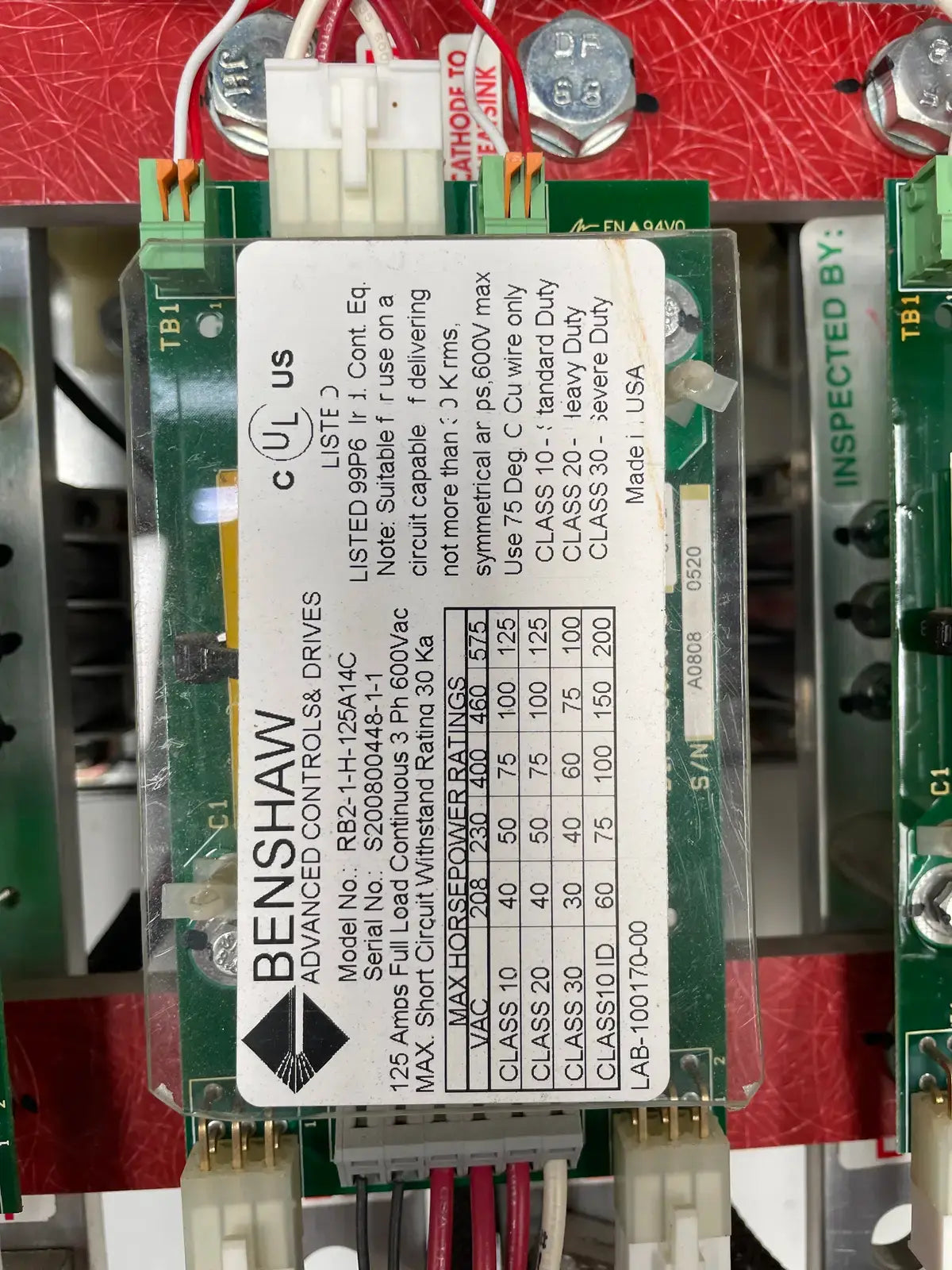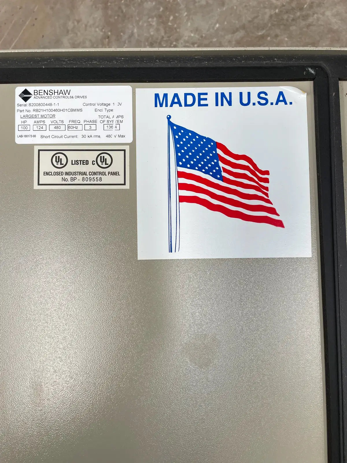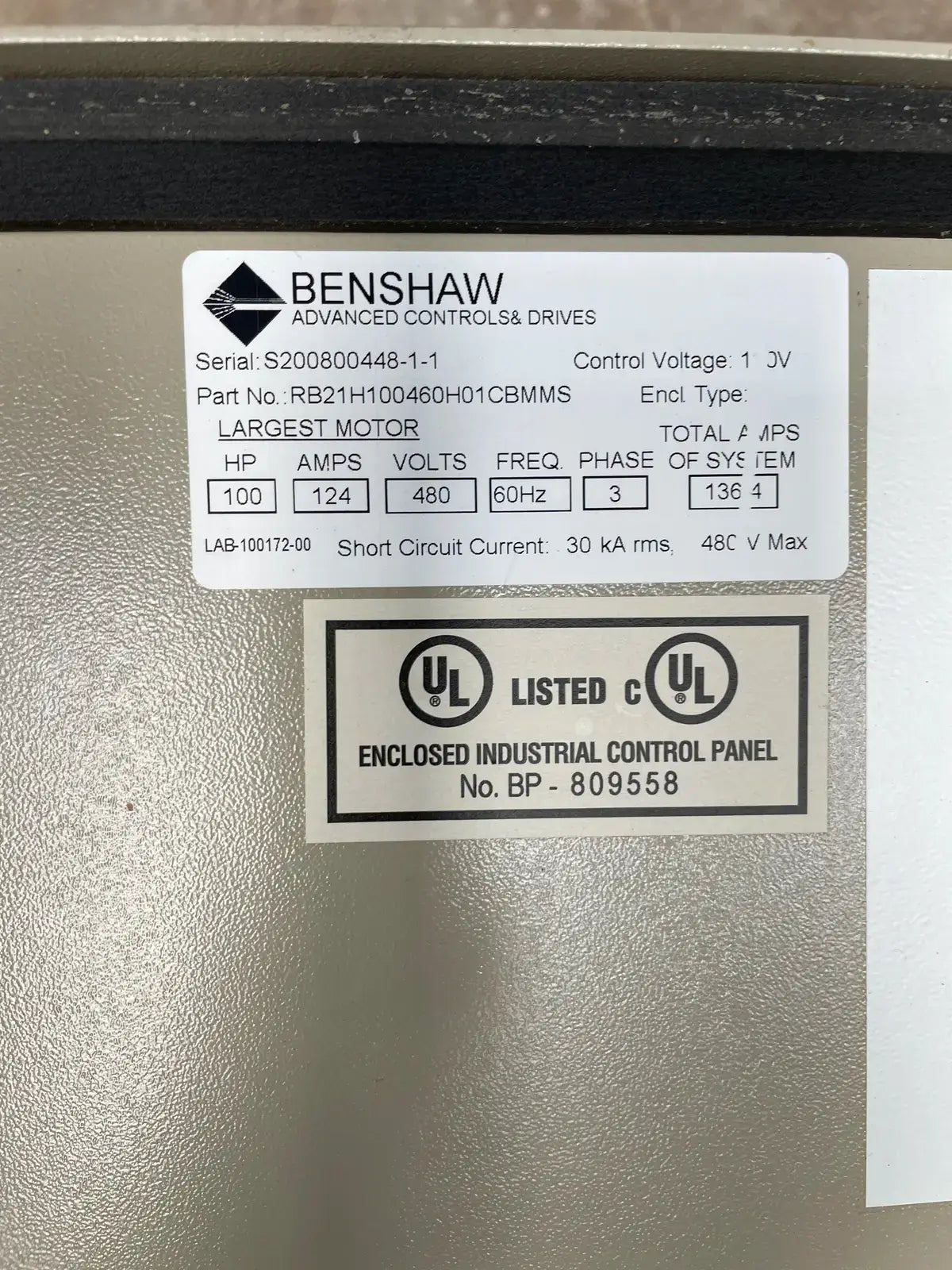 Arrancador de motor de compresor de tornillo con controles y accionamientos avanzados de Benshaw. Número de serie: S200800448-1-1. Número de pieza: RB21H100460H01CBMMS. Voltaje de control: 100 V. Fuente de alimentación - Motor más grande: HP: 100, AMPS: 124, Voltios: 480, Hz: 60, Ph: 3. Amperios totales del sistema: 136,4