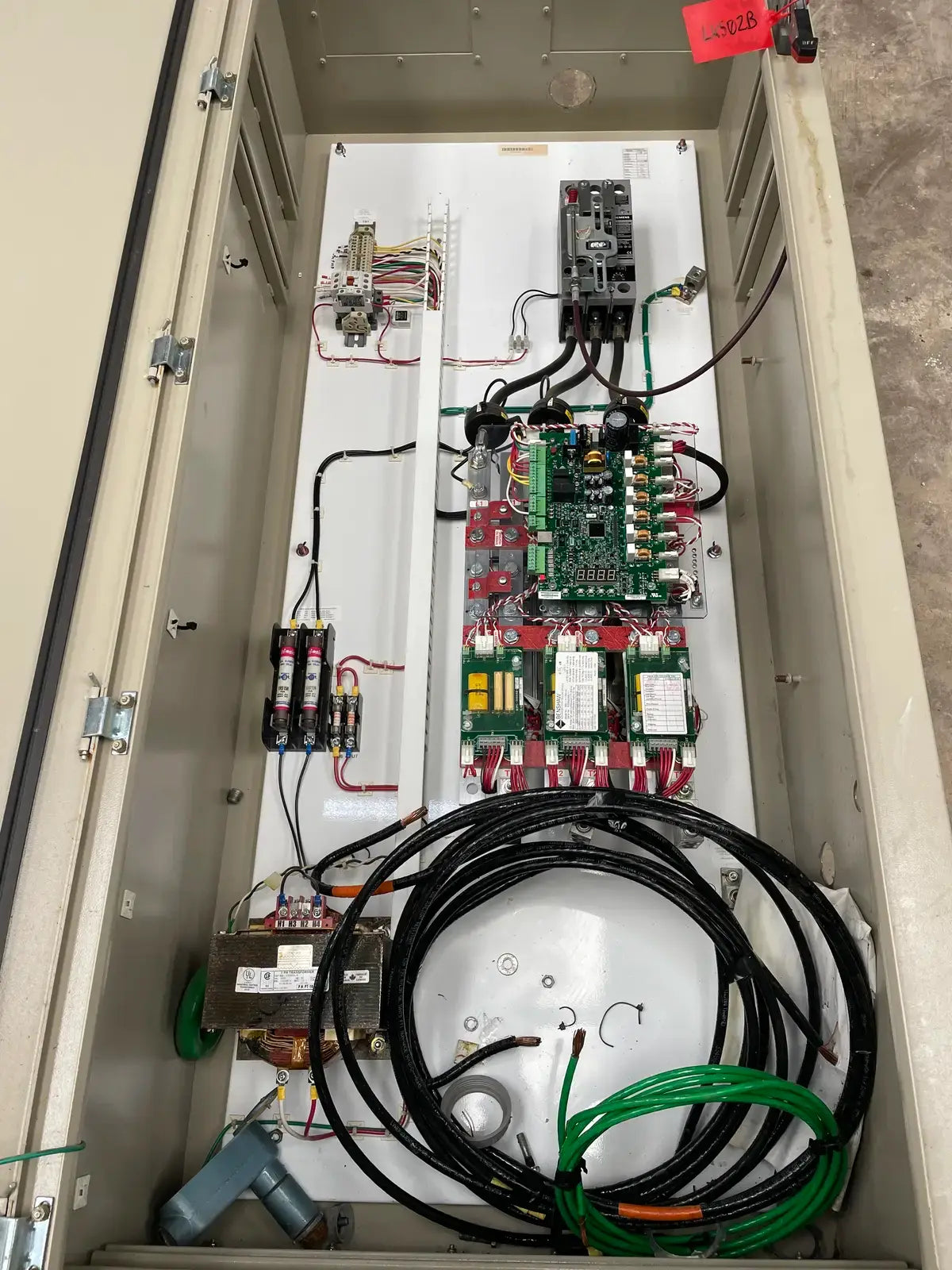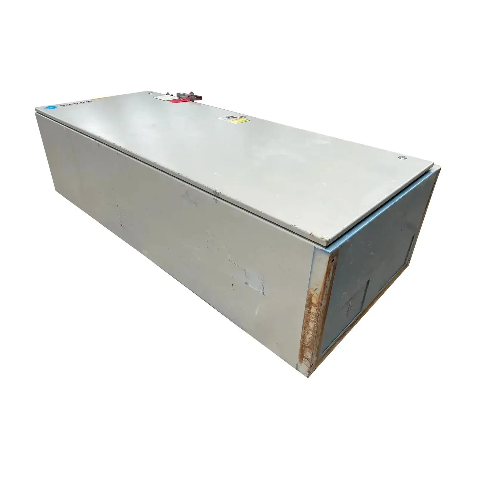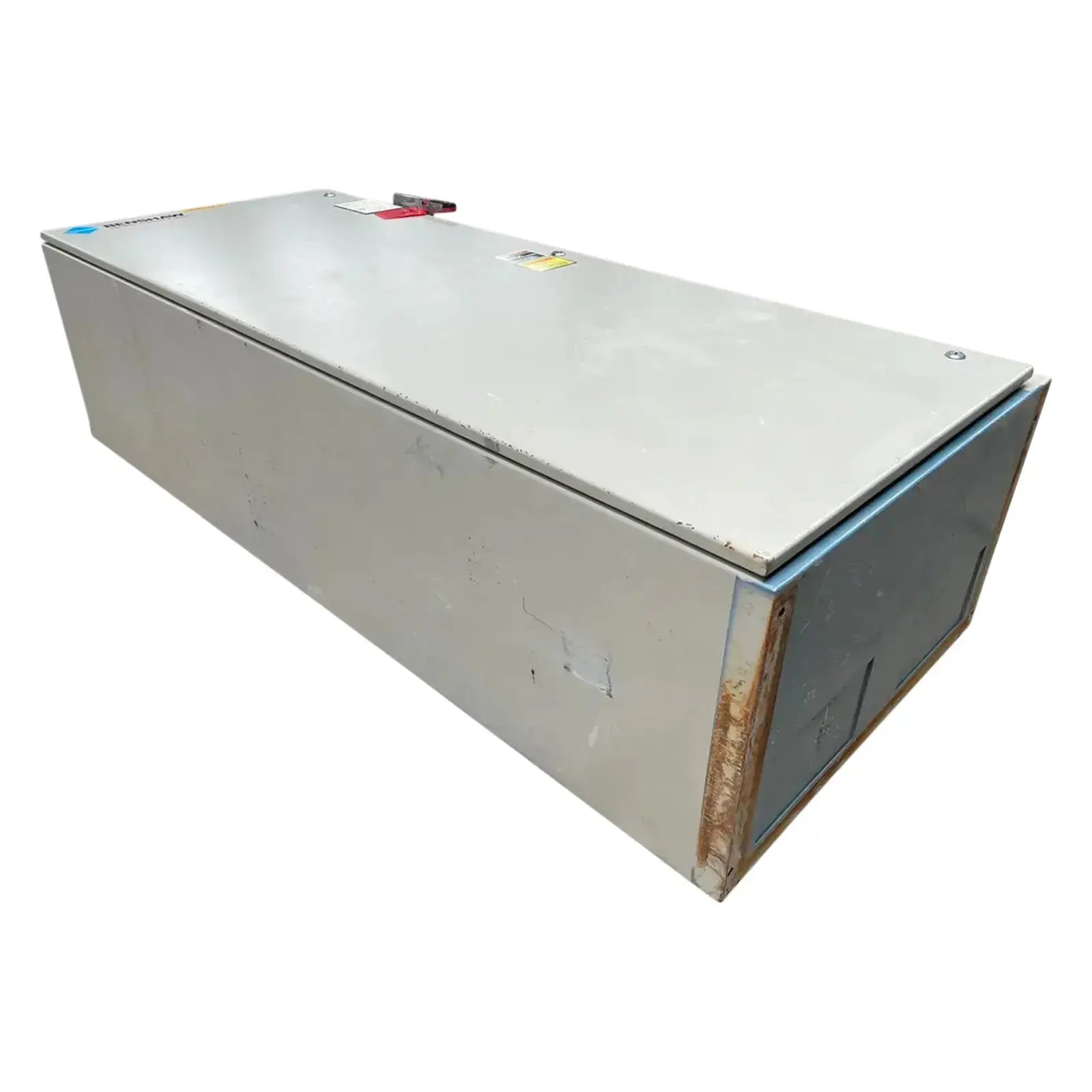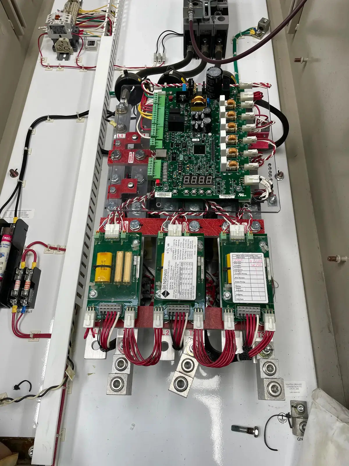 Arrancador de motor de compresor de tornillo con controles y accionamientos avanzados de Benshaw. Número de serie: S200800448-1-1. Número de pieza: RB21H100460H01CBMMS. Voltaje de control: 100 V. Fuente de alimentación - Motor más grande: HP: 100, AMPS: 124, Voltios: 480, Hz: 60, Ph: 3. Amperios totales del sistema: 136,4