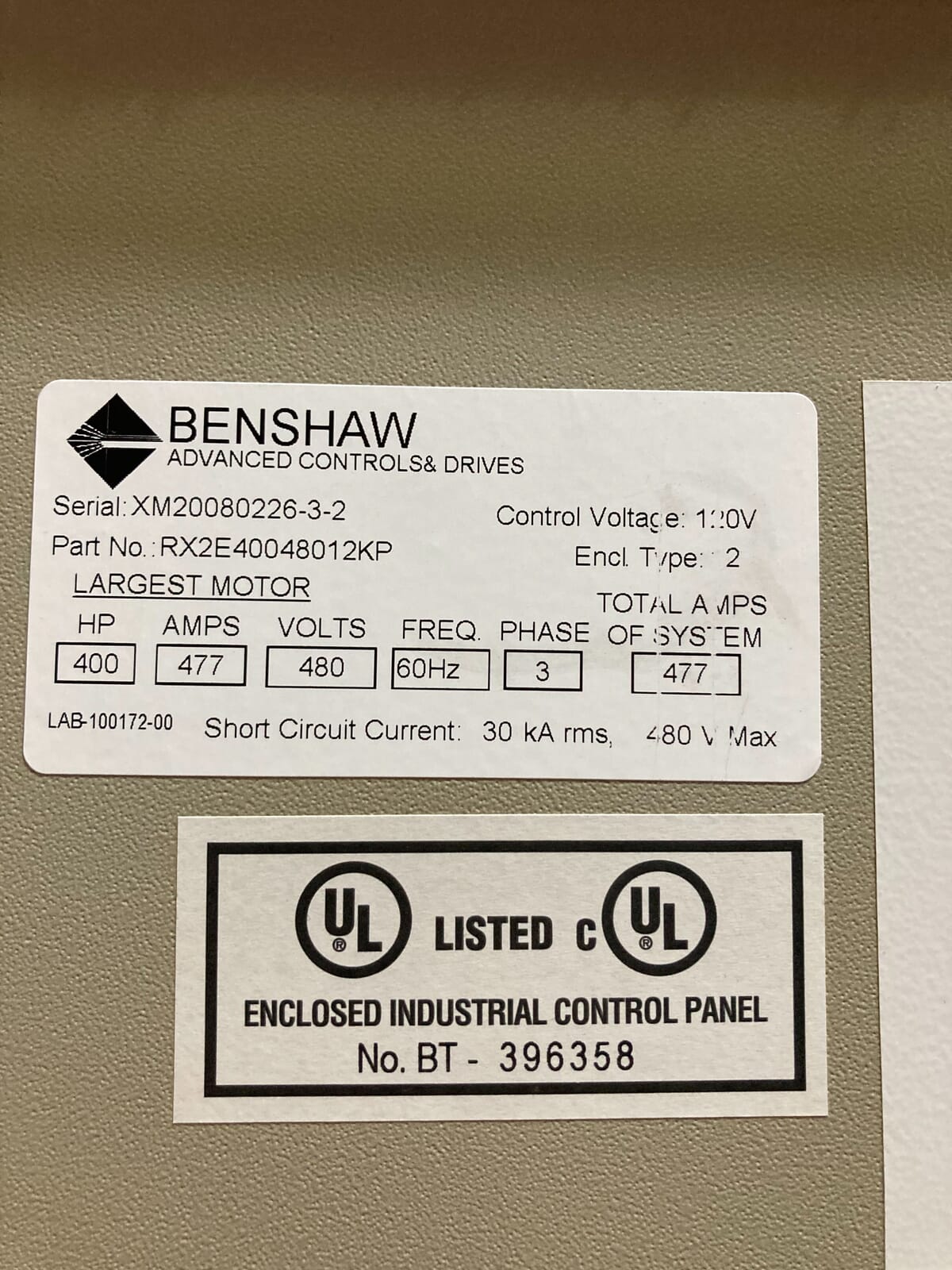 Controles y variadores avanzados Benshaw - Número de serie: XM20080226-3-2, Número de pieza: RX2E40048012KP, Voltaje de control: 120 V, Número de pieza: RX2E40048012KP. Motor más grande: HP: 400, Amperios: 477, Voltios: 480, Frecuencia: 60 Hz, Ph: 3. Amperios totales máximos: 480 V.
