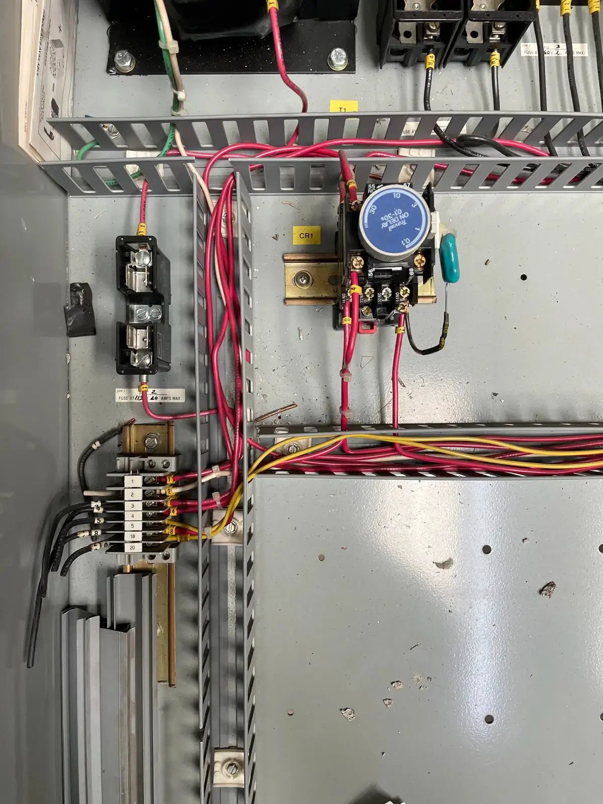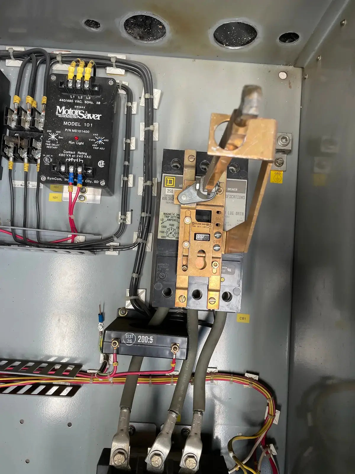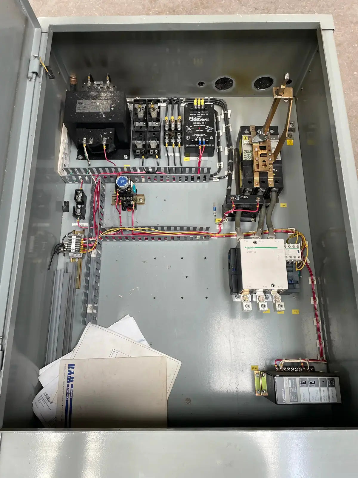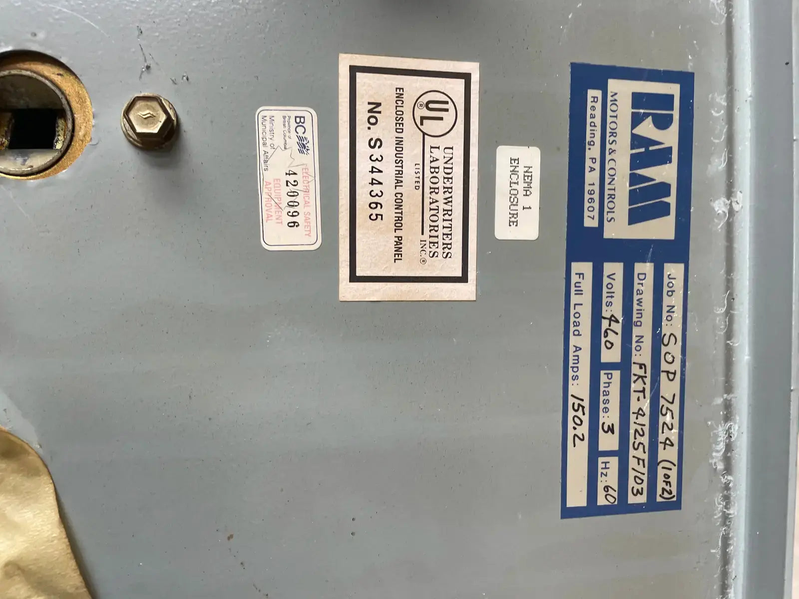 Arrancador de motor de Ram Industries. Número de trabajo: SOP7524. Número de dibujo: FKT-4125F103. Fuente de alimentación: Voltios: 460, Ph: 3, Hz: 60. Amperios a carga completa: 150,2. Potencia máxima del motor: 125 HP.