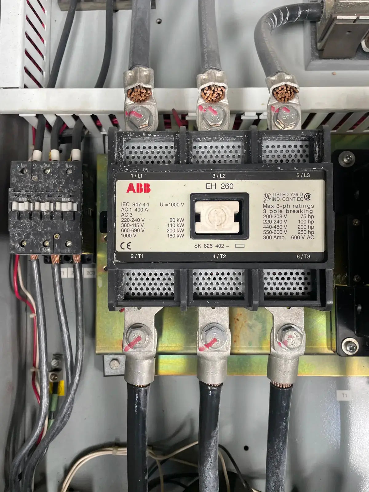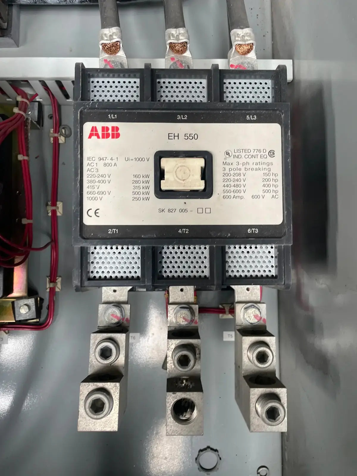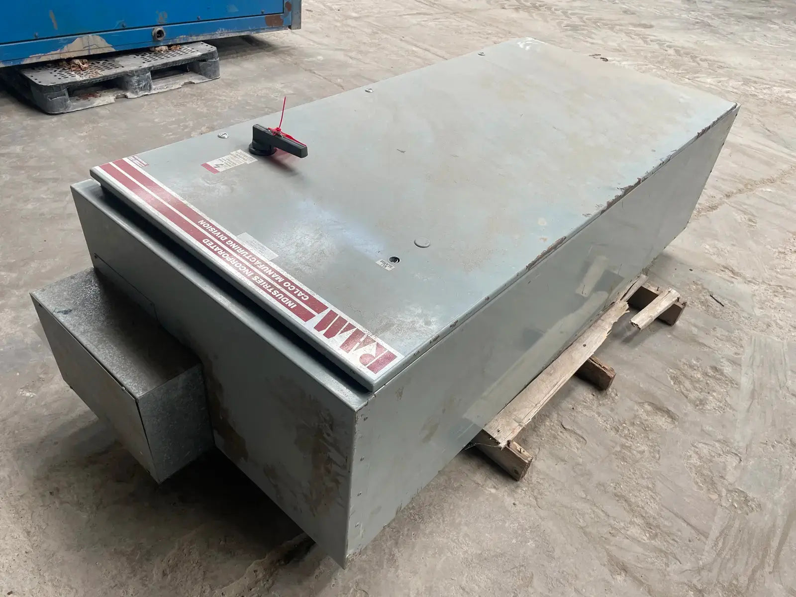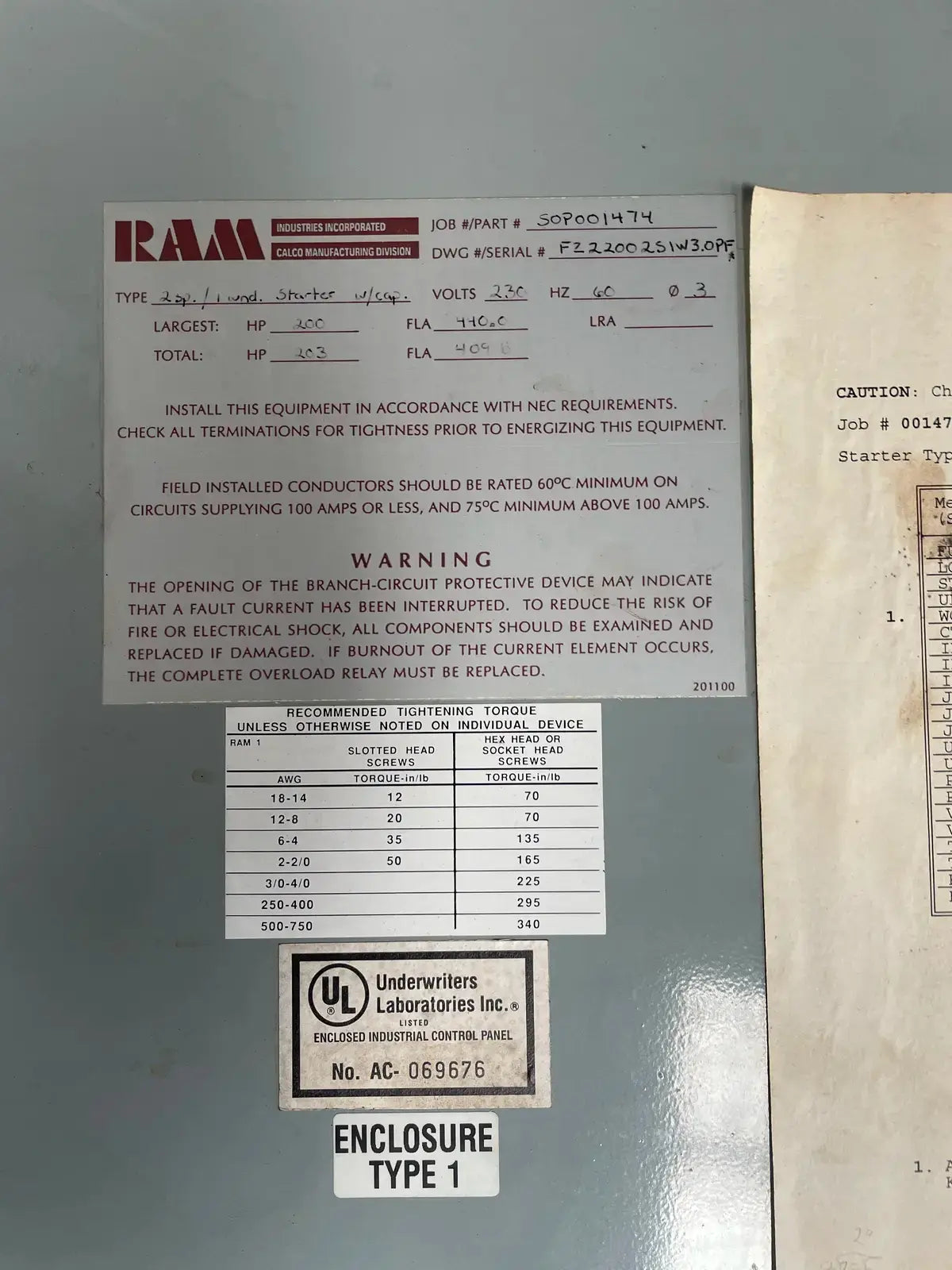 Arrancador de motor de compresor de tornillo Ram Industries. Número de trabajo/pieza: SOP001474. Número de dibujo/serie: FZ2200251W3.OPF. Tipo: 23P. Yo viento. Arrancador con tapa. Voltios: 230, Hz: 60, Ph: 3. Fuente de alimentación máxima del motor - HP: 200, FLA: 440,0. Total - HP: 203, FLA: 409,8.