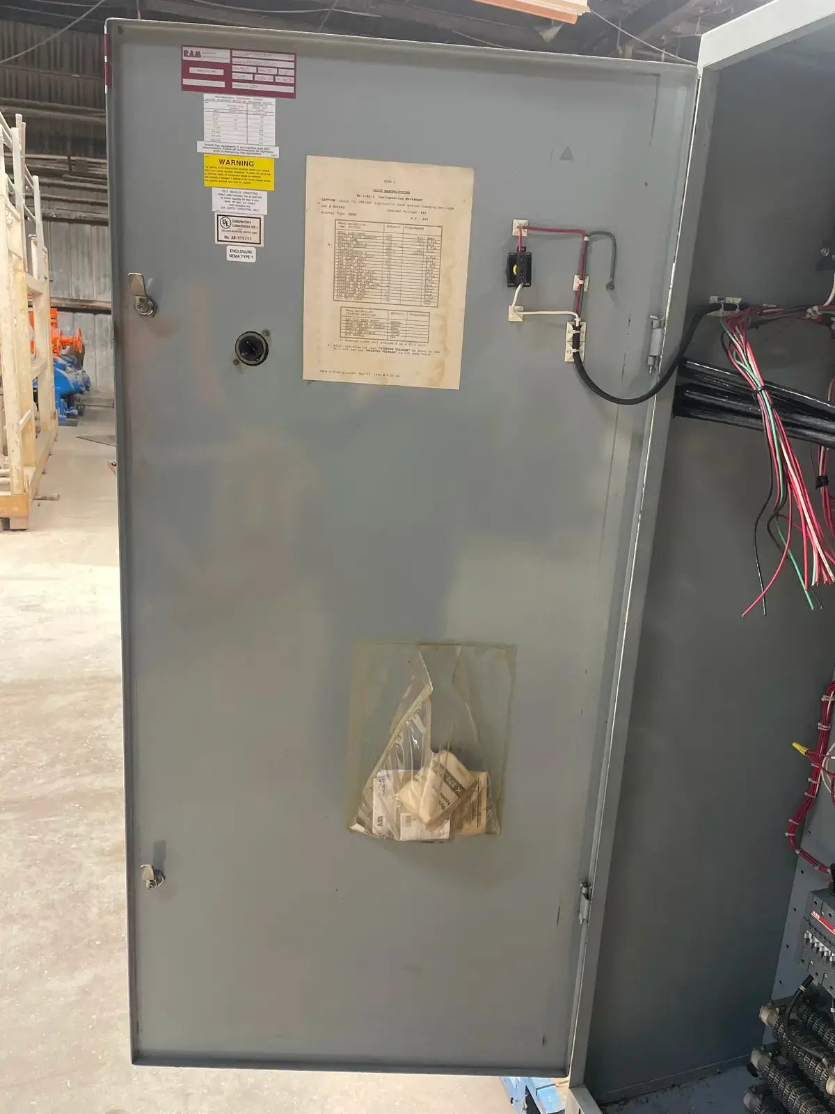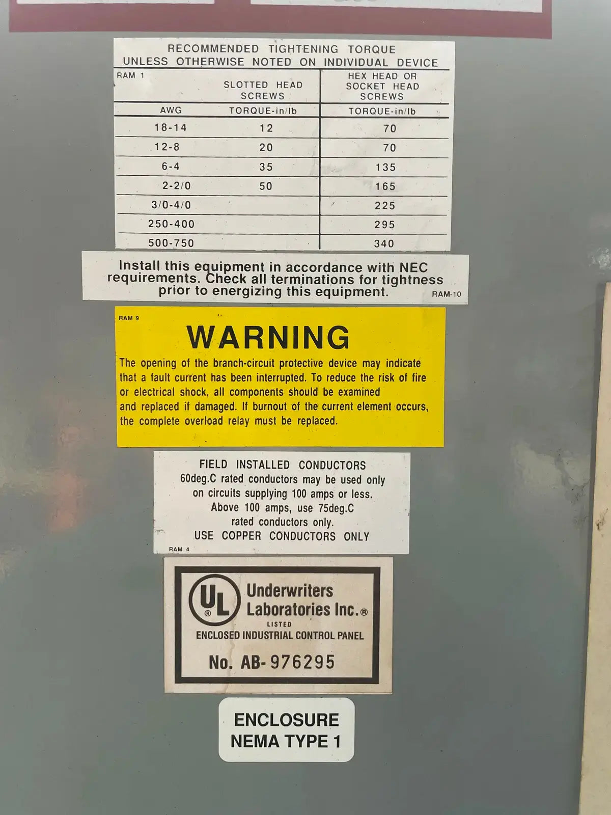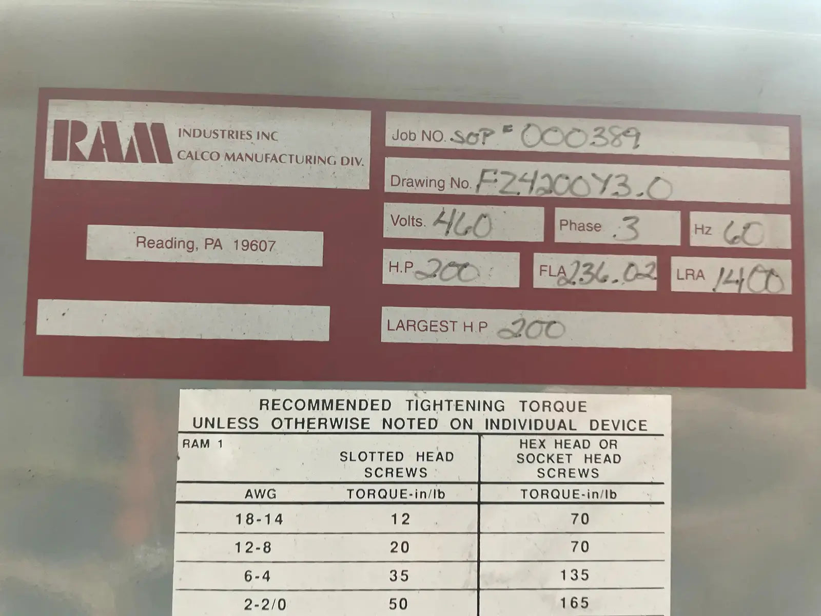 Arrancador de motor de compresor de tornillo Ram Industries. Número de trabajo: SOP000389. Número de dibujo: FZ420043.0. Fuente de alimentación: Voltios: 460, Ph: 3, Hz: 60, Hp: 200, FLA: 236.02, LRA: 1400. HP máximo del motor: 200 HP.