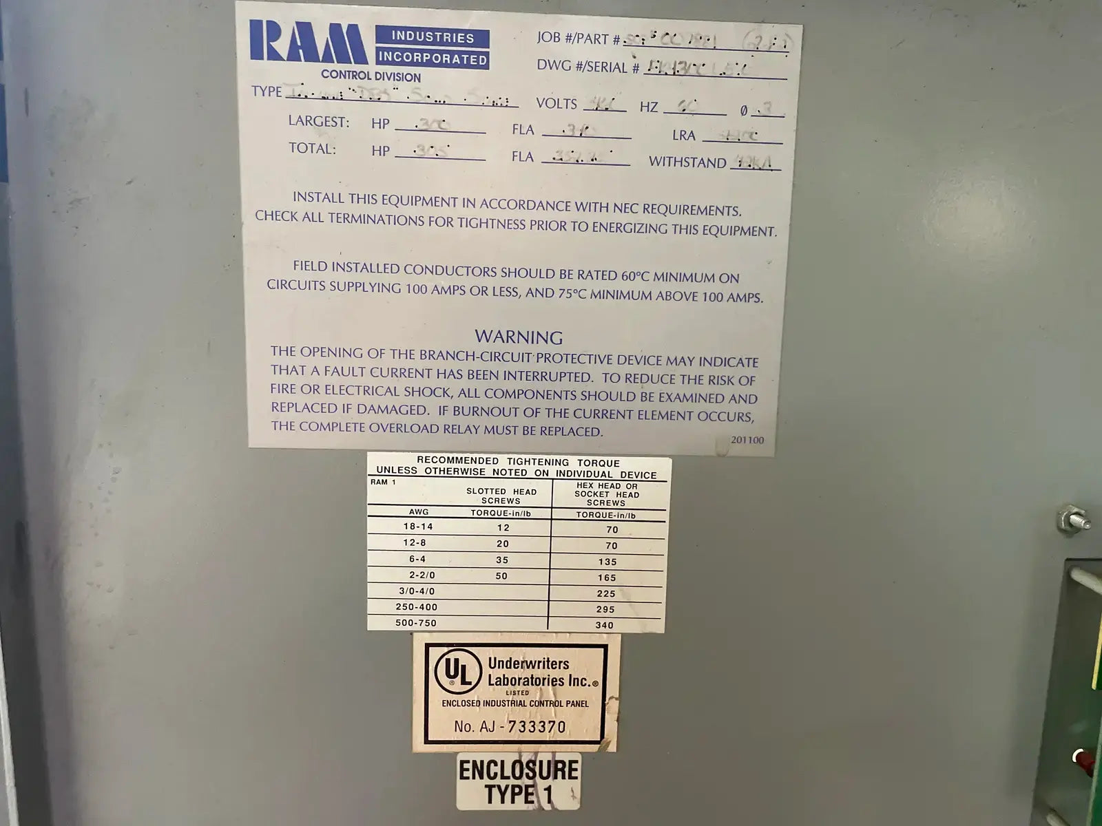 Arrancador de motor de compresor de tornillo Ram Industries. TRABAJO/Nº de pieza: SO0001881. Número de dibujo/serie: FK0430050. Fuente de alimentación: 460 voltios, Hz: 60, Ph: 3. Fuente de alimentación del motor más grande: 300 HP, FLA: 340, LRA: 2200. Fuente de alimentación máxima total: 305 HP, FLA: 35225, Resistencia: 42 KA.