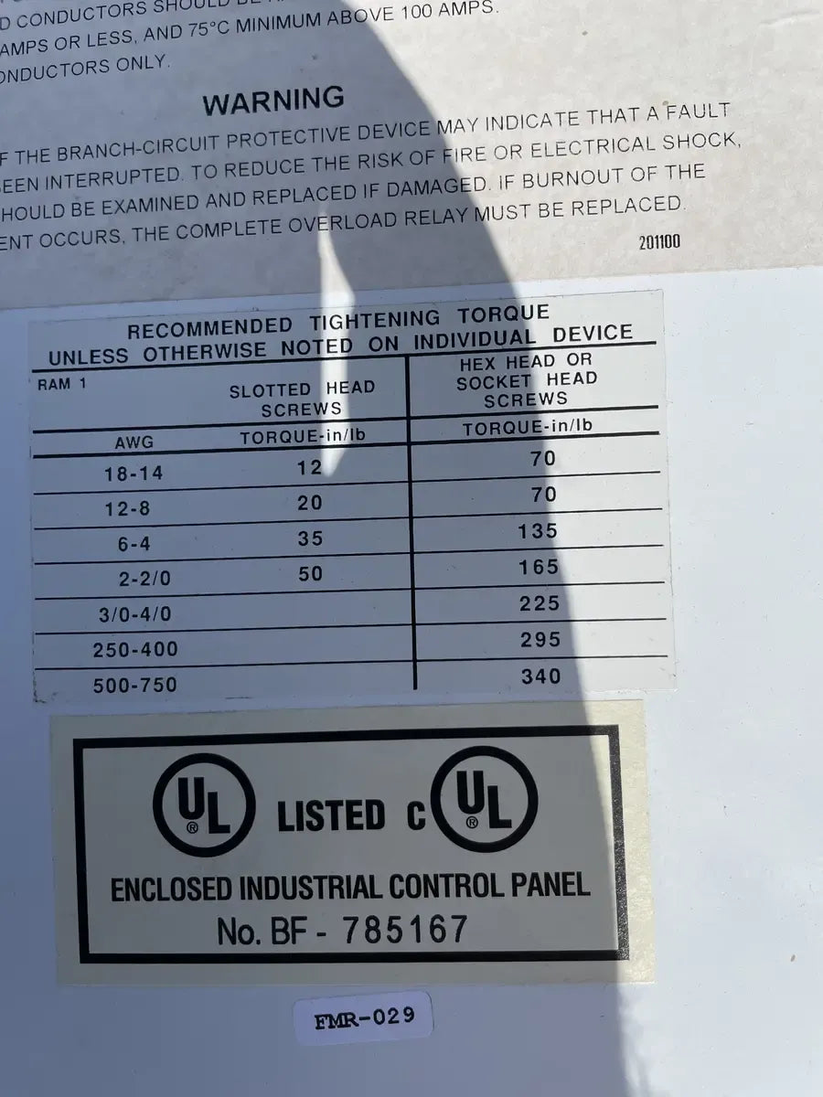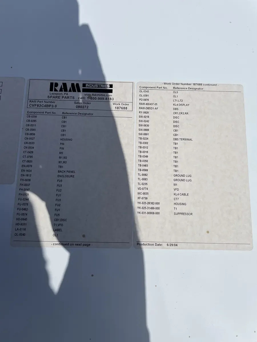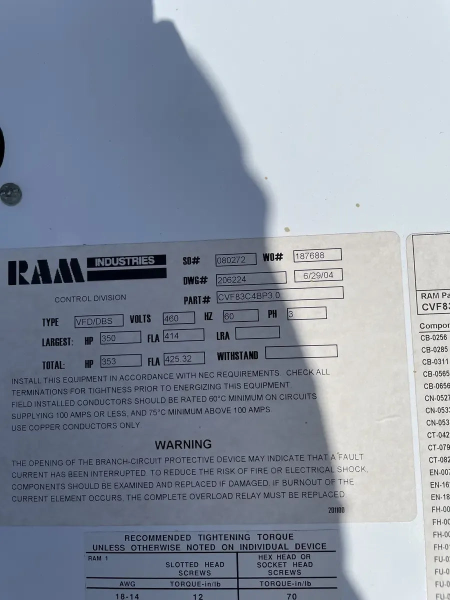 Arrancador de motor de compresor de tornillo Ram Industries. SO#: 080272, WO#: 187688, Dwg#: 206224, Número de pieza: CVF83C4BP3.0. Fecha de fabricación: 29/06/2004. Tipo: VFD/DBS. Voltios: 460, Hz: 60, Ph: 3. Fuente de alimentación máxima del motor: 350 HP, FLA: 414.
