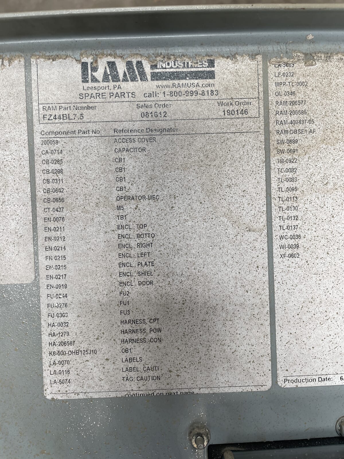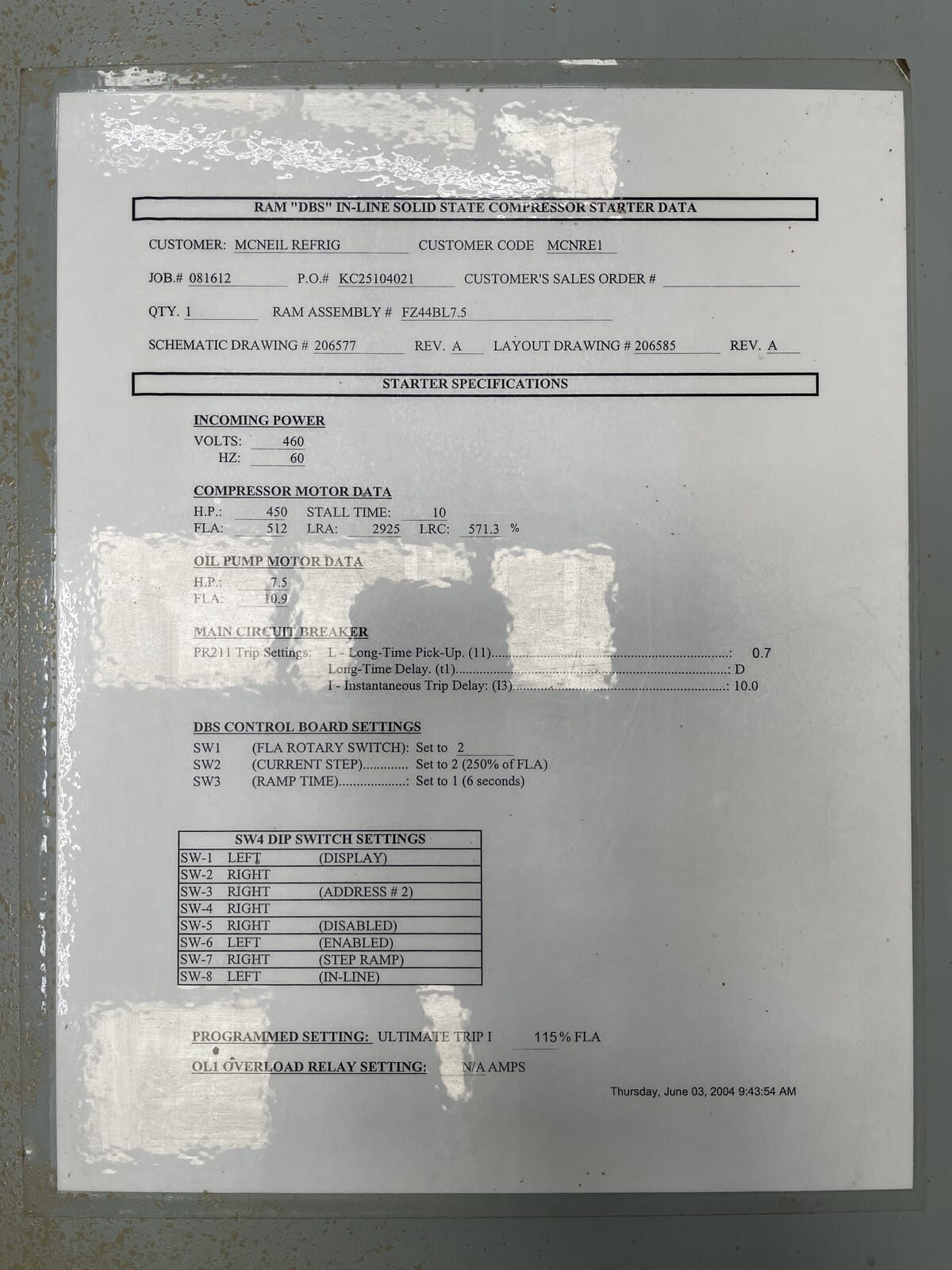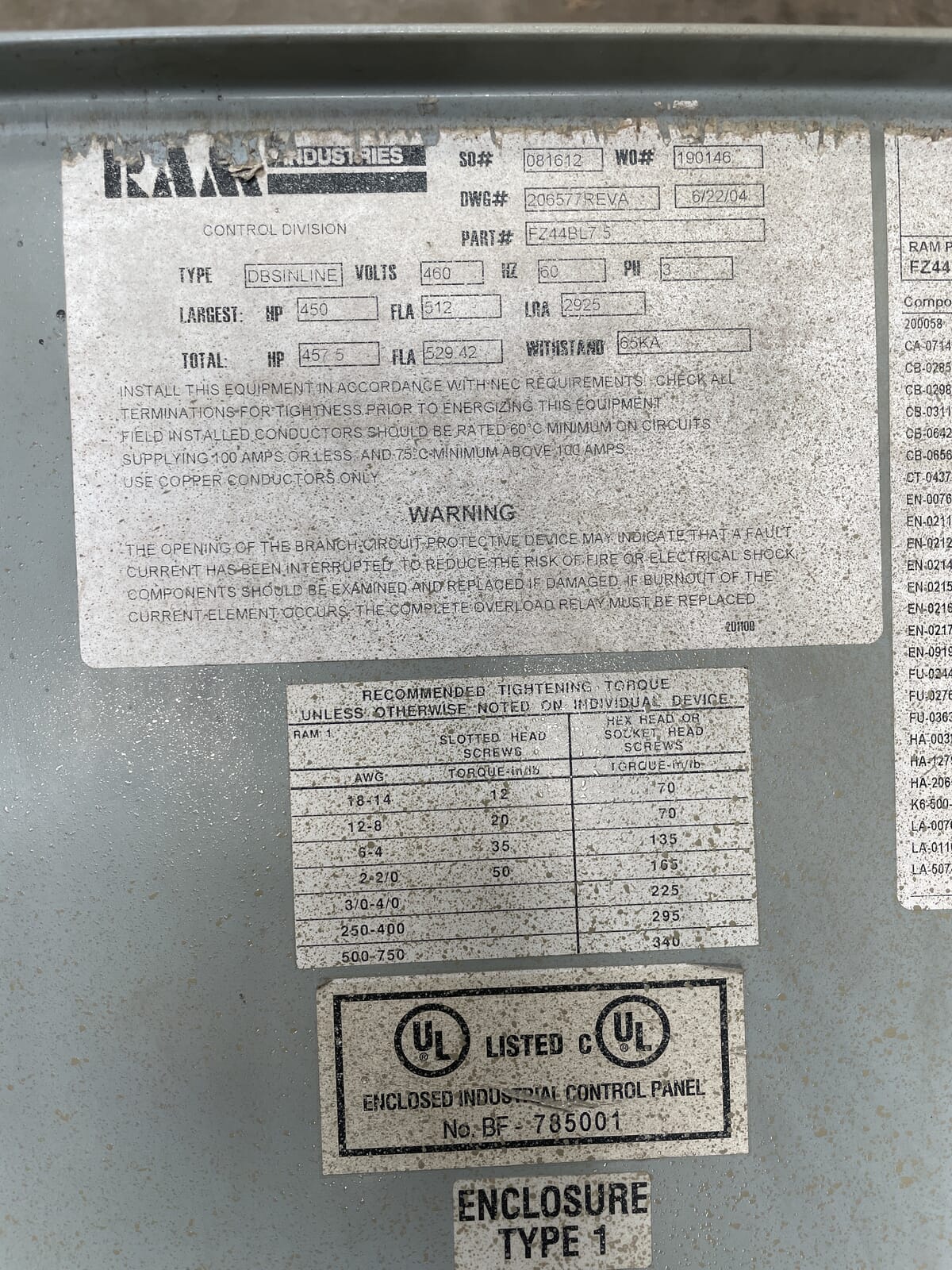 Arrancador de motor de compresor de tornillo Ram Industries. SO #: 081612, WO#: 190146, Dibujo #: 206577REVA, Parte No: FZ44BL7.5. Tipo: DBSLINE, Voltios: 460, Hz: 60, Ph: 3. Motor máximo: 450 HP, FLA: 512, LRA: 2925.