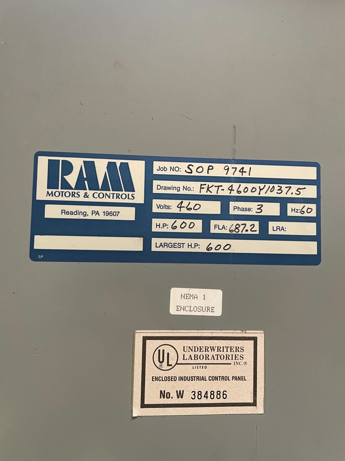 Ram Industries Motor & Controls Arrancador de motor de compresor de tornillo. Número de trabajo: SOP9741, Número de dibujo: FKT-4600Y1037.5. Fuente de alimentación: Voltios: 460, Ph: 3, Hz: 60, FLA: 687,2. Motor más grande: 600 HP.