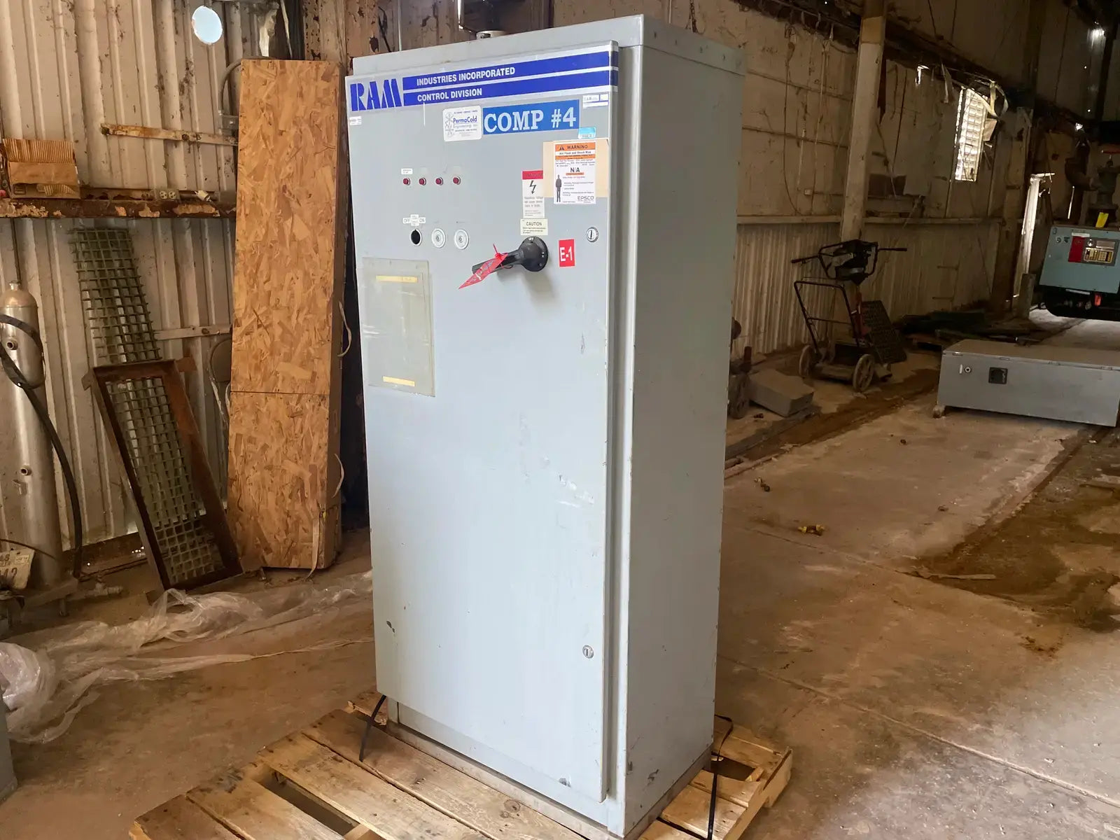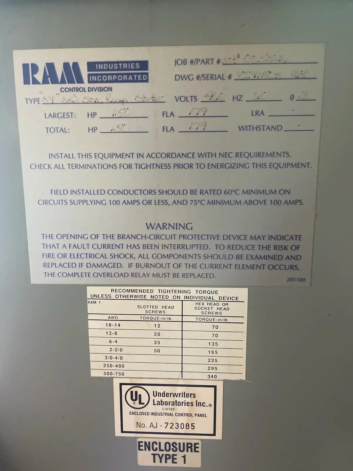 Arrancador de motor de Ram Industries. DWG/Serie: VI4150S REC. Fuente de alimentación: 460 voltios, Hz: 60, Ph: 3. Fuente de alimentación del motor más grande: Hp: 150, FLA: 179. Fuente de alimentación total: 150 HP, FLA: 179.