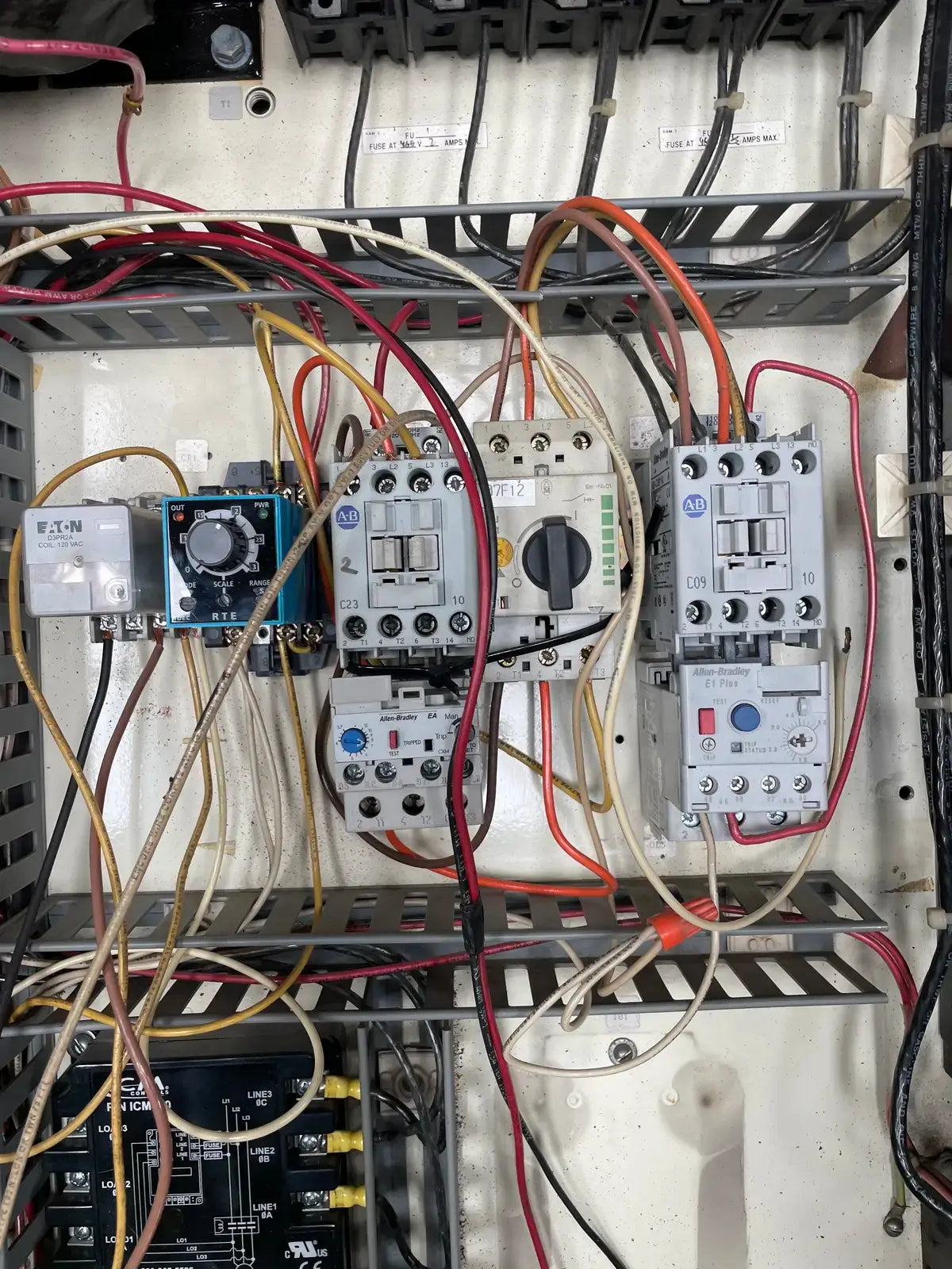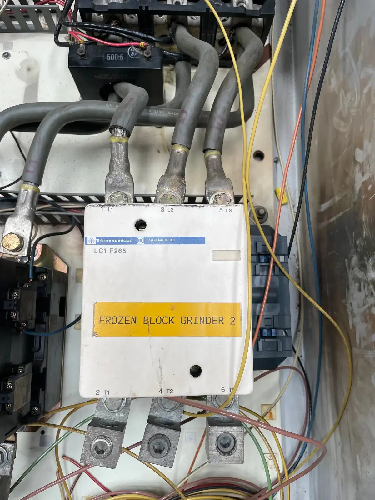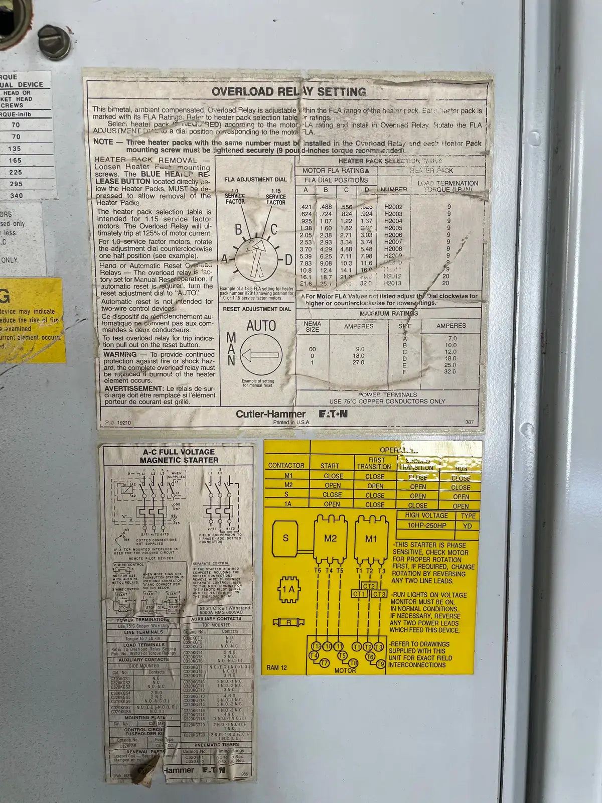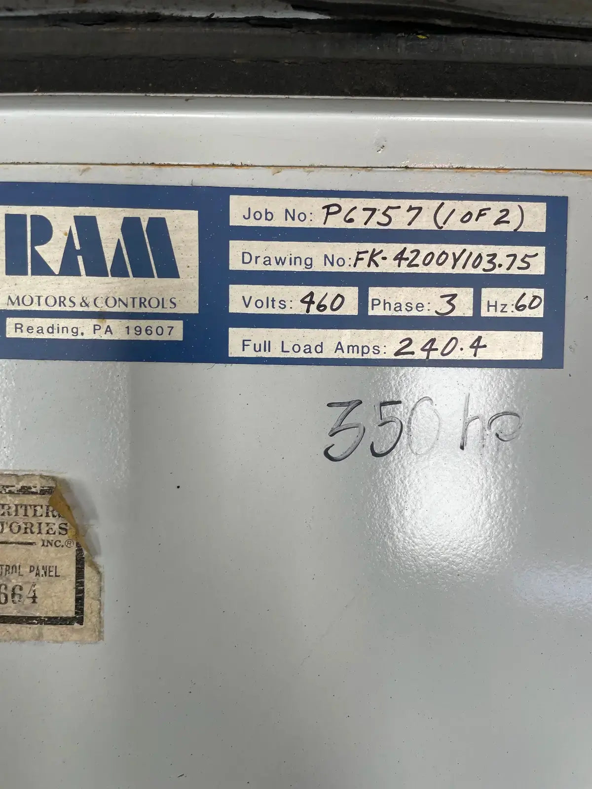 Arrancador de motor de tipo rígido de Ram Industries. Número de trabajo: P6757. Número de plano: FK-4200Y103.75. Fuente de alimentación: 460 voltios, fase: 3, Hz: 60, amperios a plena carga: 240,4. Potencia máxima: 350 HP.