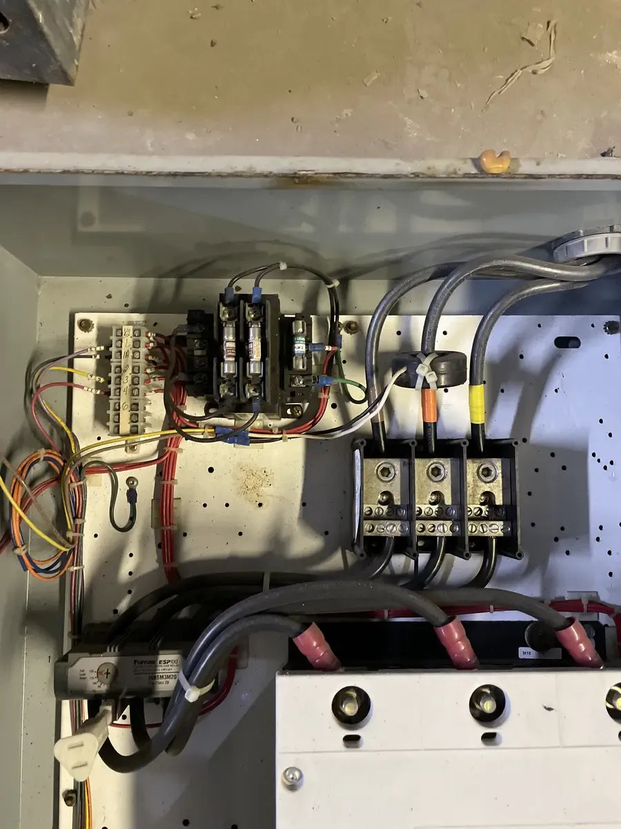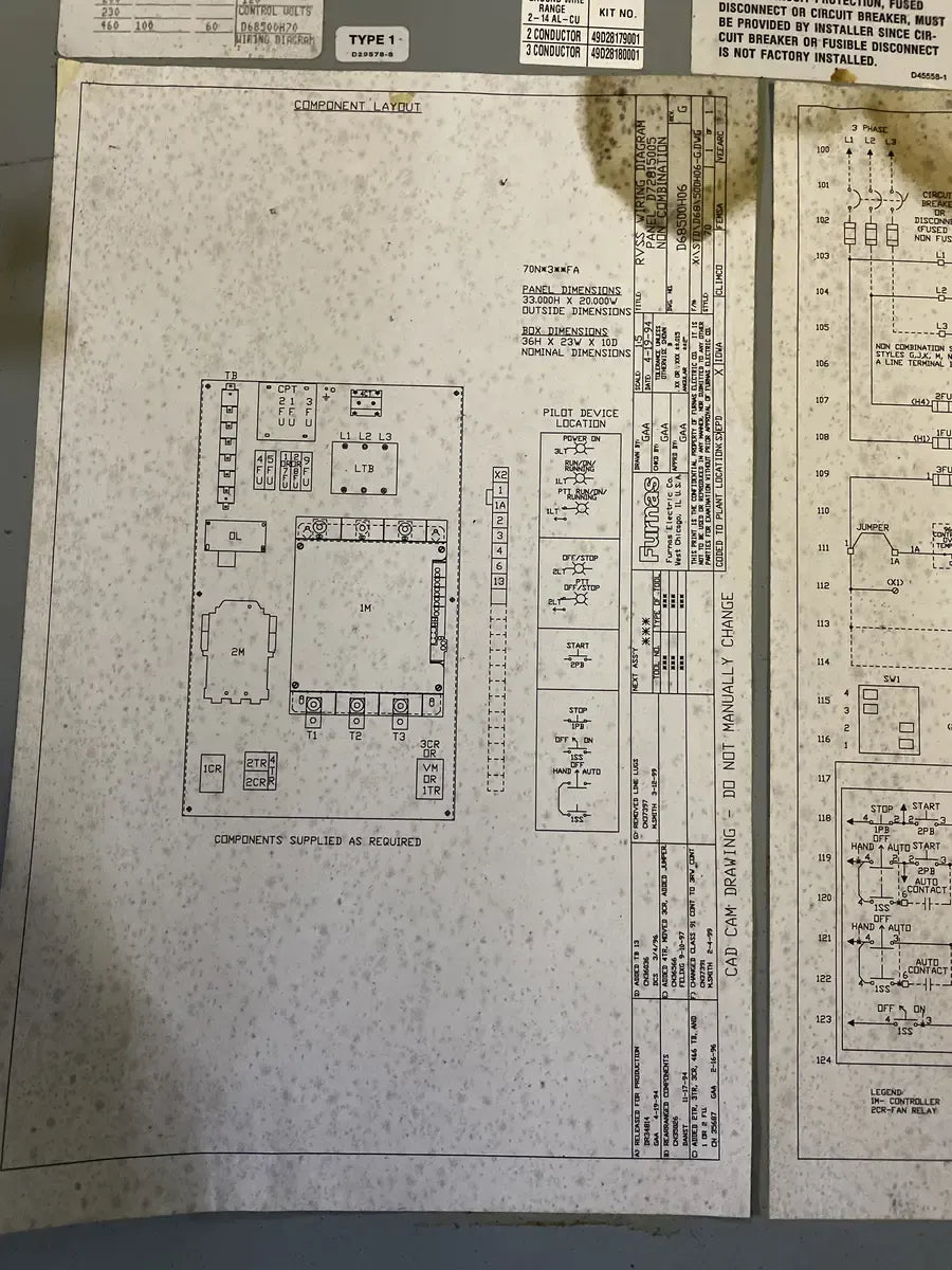 Arrancador de control Siemens: Clasificación del controlador: N.° de catálogo: 70NL34BFA, voltios: 230/460, fase: 3, hercios: 60, 124 amperios totales, voltios de control: 120, diagrama de cableado de industrias: D68500H70, panel de control industrial cerrado número: 420916.