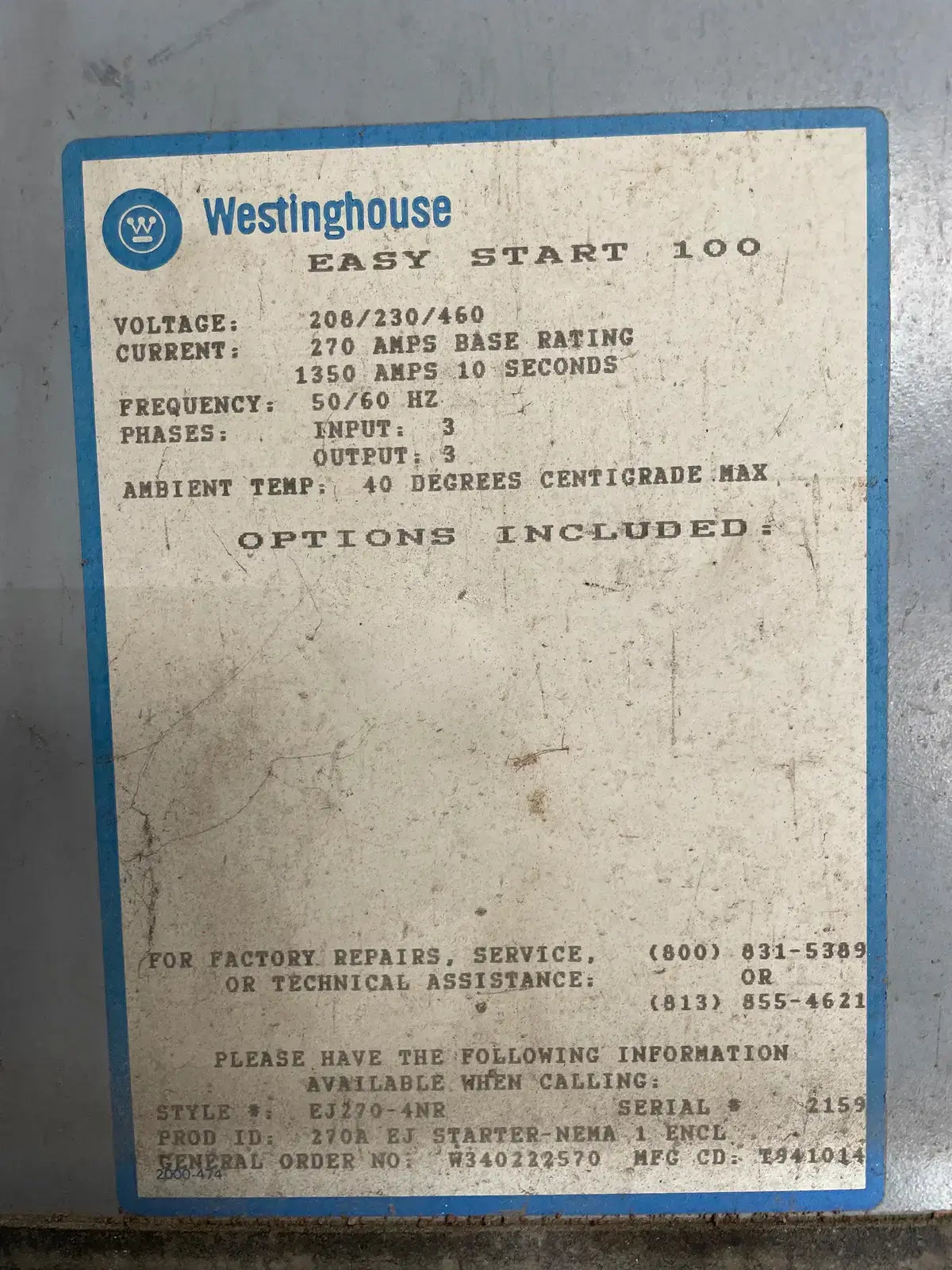 Arrancador suave de motor Westinghouse. Modelo: EJ270-4NR. Número de serie: 2159. Voltaje: 208/230/460. Corriente: Clasificación base de 270 amperios/1350 amperios en 10 segundos. Frecuencia: 50/60 Hz. Fases: Entrada: 3/Salida: 3. Temperatura ambiente: 40 grados centígrados máx.