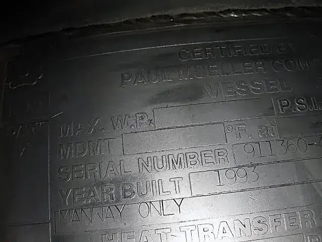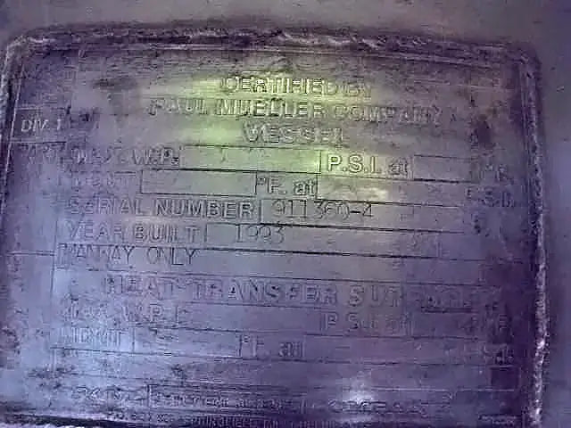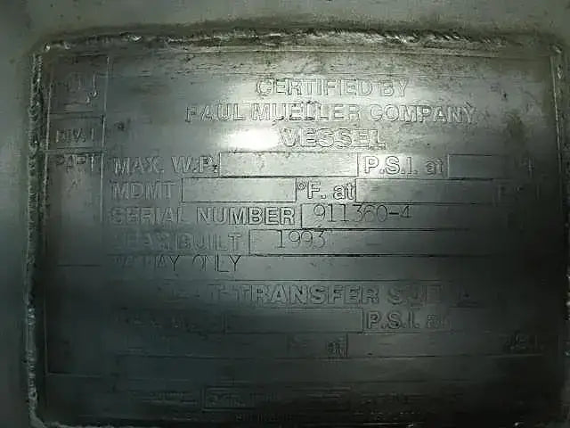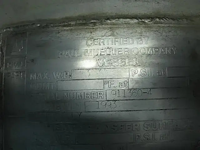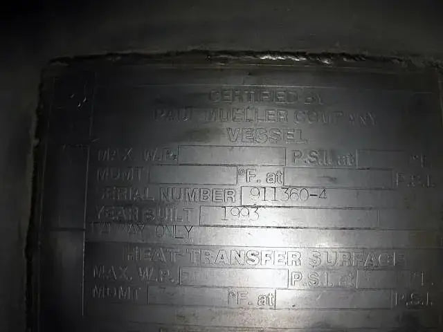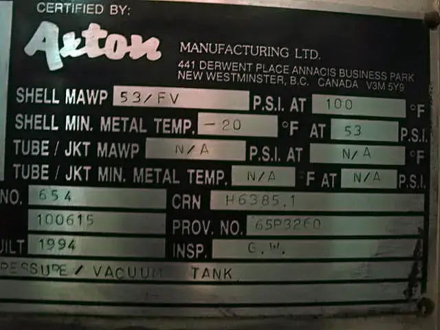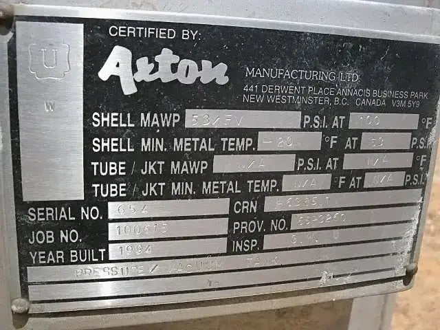 1994 Axton Manufacturing, Ltd. Tanque de presión/vacío de acero inoxidable. Capacidad aproximada: 47 galones. Dimensiones internas del tanque: 18 pulg. de diámetro. x 43 pulg. de pared recta. Material de construcción: acero inoxidable 316. Shell MAWP 53/FV psi a 100°F. Temperatura mínima del metal de la carcasa: -20 °F a 53 psi. Las características incluyen una entrada de Paul Mueller Co. de 1993, una bola rociadora y un sistema de filtro segmentado Micropure Filtration, modelo: PSF-20. Entrada/salida(s): (3) triple abrazadera de 1 pulgada, (2) sanitaria de 2 pulgadas. Dimensiones totales: 2 pies 6 pulgadas de largo x 2 pies 4 pulgadas de ancho x 6 pies 3 pulgadas de alto (ACN247).