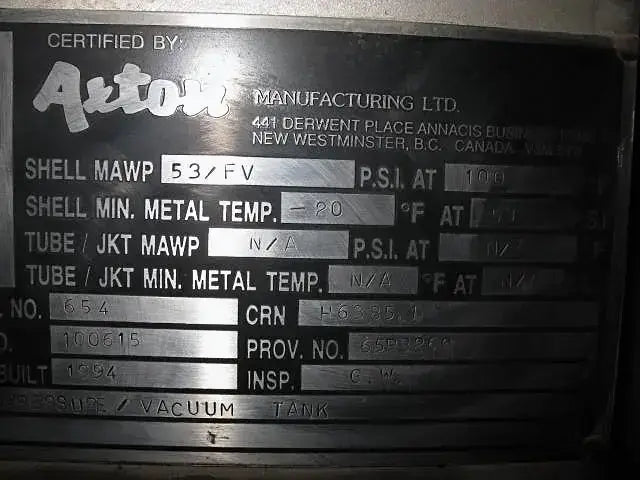 - Tanque MAWP (PSI a temperatura): 53/FV psi @ 100°F