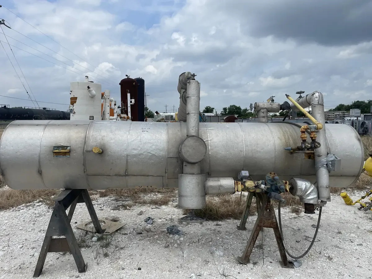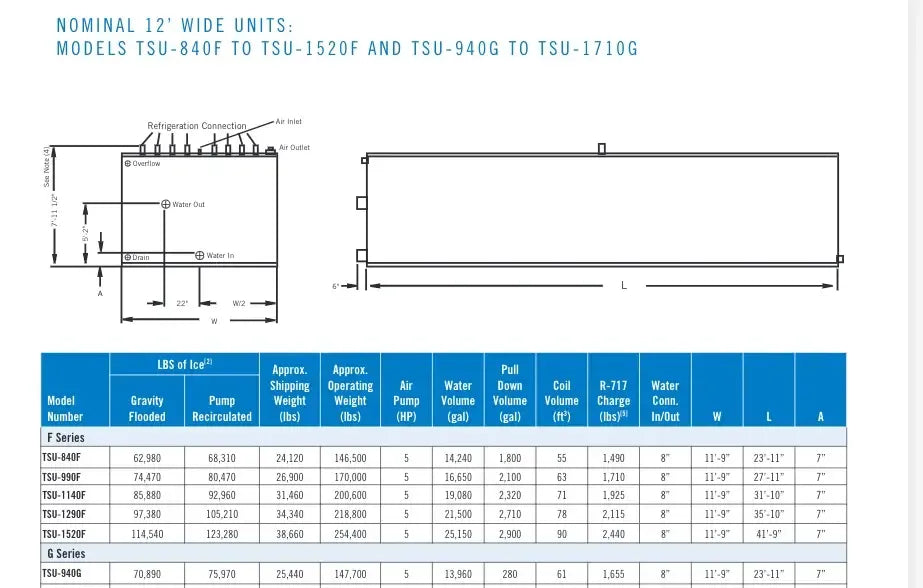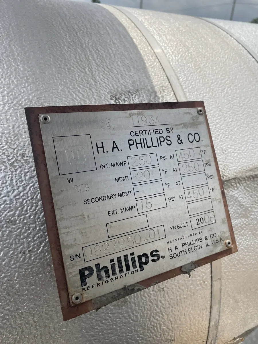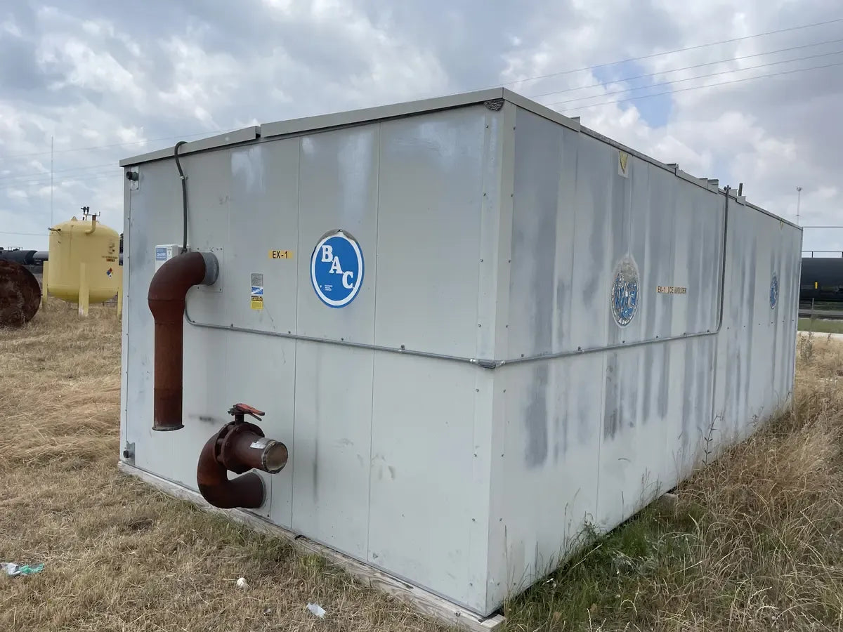 Almacenamiento Térmico Serie BAC G. Modelo: TSU-940G, Serie: U084557701. LBS de hielo: Inundado por gravedad: 70890 LBS. Bomba recirculada: 75,970 LBS. Aprox. Peso operativo (LBS): 147700, Bomba de aire (HP): 5 HP, Volumen de agua (Gal): 280, Volumen del serpentín: 1655, Conexión de agua (entrada/salida): 8 pulgadas. La carga de refrigerante indicada es la carga operativa para inundación por gravedad. sistema a 15 F. Dimensiones totales (pulg.): 312 L x 142 W x 96 H. Unidad de almacenamiento del enfriador de hielo BAC Mantiene una temperatura del agua constantemente baja. Ideal para enfriamiento por lotes en aplicaciones industriales y de enfriamiento de procesos, como lecherías, cervecerías, fabricantes de productos químicos, enfriamiento de productos alimenticios, procesos de embotellado, enfriamiento de productos agrícolas y más. En el modo de funcionamiento de producción de hielo, el hielo se forma haciendo circular glicol o refrigerante a través de los serpentines de la unidad. En el modo de funcionamiento Enfriamiento solo con hielo, la unidad del compresor está apagada y el agua circula a través de los tubos helados. Buque inundado de refrigeración Phillips: Junta Nacional: 11934, Número de serie: 0827250-01. Año de construcción: 2008. MAWP 250 PSI a 450 F. MDMT: -20 °F a 250 PSI. ext. MAWP: 15 PSI a 450 F. Dimensiones (pulg.): 151 largo x 64 ancho x 64 alto.