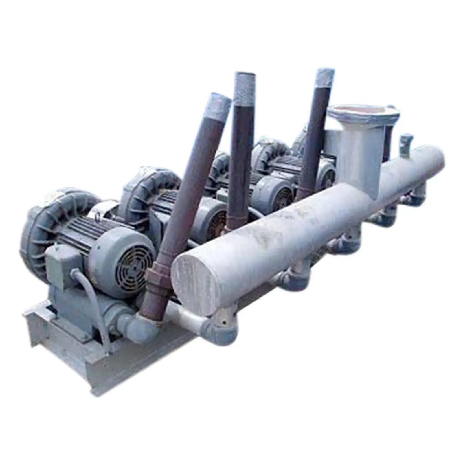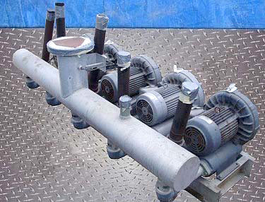 Banco de sopladores de aire Morris and Associates. Modelo: Ice Master VFC804A-7W. Compresor de anillo eléctrico Fuji, 200-230/460 V, 8,7-10/10 hp de potencia, 24-25/12,5 amperios, 135/135 máx. de H2O, 388/388 cfm (máx.), 50/60 Hz. El banco de sopladores cuenta con un cabezal de 8 pulgadas de diámetro x 91 pulgadas. Entradas: (5) 3 pulg. de diámetro. tuberías de succión. Salidas: (1) 2-1/2 pulg. de diámetro. tubo de ventilación, (1) tubo de 8 pulgadas de diámetro con una brida de 13-1/2 pulgadas y (8) tubos de 3/4 pulgadas de diámetro. orificios de fijación a una distancia de centro a centro de 12 pulgadas. Dimensiones totales: 8 pies 4 pulgadas de largo x 44 pulgadas de ancho x 48 pulgadas de alto ([H]pumpshop).