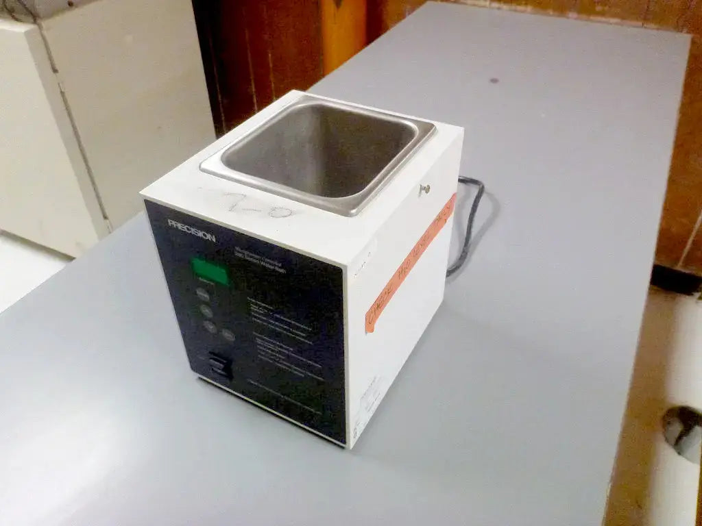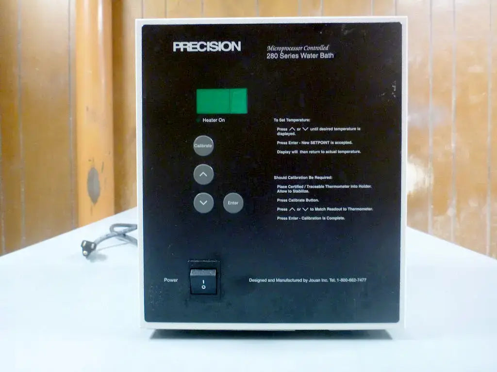 Baño de agua Precision Scientific serie 280. N.º de catálogo: 5120046. Temperatura de 5 ºC a 99,9 ºC. 115 V, 225 W, 2,0 A, 50/60 Hz. Dimensiones del baño: 6 pulgadas de largo x 5-1/4 pulgadas de ancho x 6 pulgadas de largo. Dimensiones totales: 9-1/2 pulgadas de largo x 8 pulgadas de ancho x 9-1/2 pulgadas de alto.