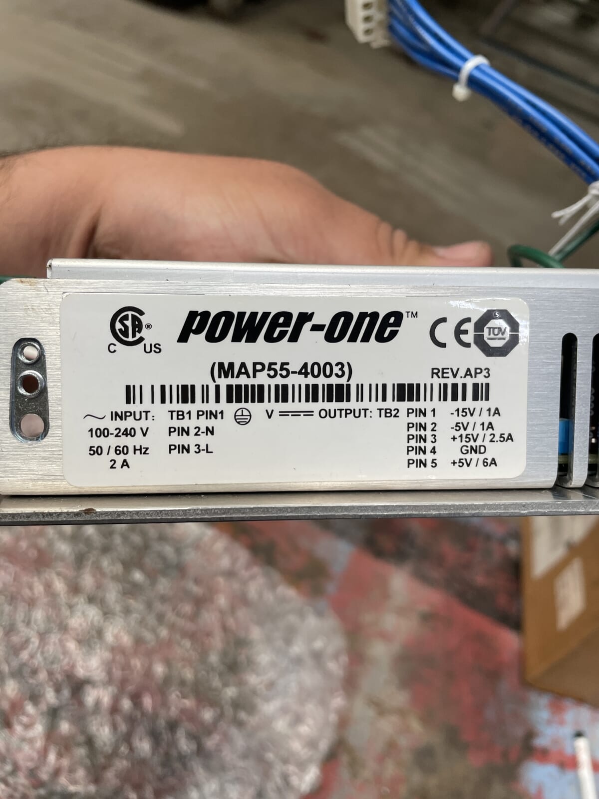Nueva serie Bel Power-One MAP55. Modelo: MAP55-4003. Entrada: 100-240 V, 50/60 Hz, 2 Amperios. Salida: -15 V/1 A, -5 V/1 A, +15 V/2,5 A, +5 V/6 A.