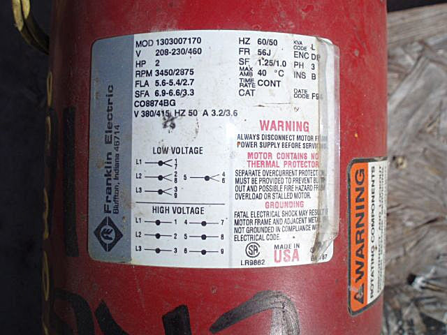 Bomba centrífuga Bell & Gossett - 2 HP. Modelo: 30-13T 1AM023. S/N: 3530. Máx. Presión de trabajo: 125 psi. Motor. Motor Century AC de 2 hp, 3450/2875 rpm, 208-230/460 V, SF-6.8-6.6/3.3 amperios, 60 Hz, trifásico. Entrada: succión de 2 pulgadas. Salida: Descarga de 1-1/2 pulg. Dimensiones totales: 1 pie 11 pulgadas de largo x 9 pulgadas de ancho x 1 pie 5 pulgadas de alto (H9).