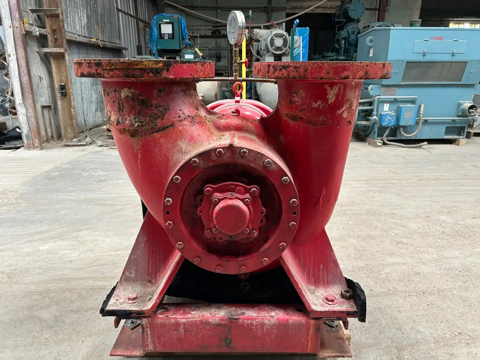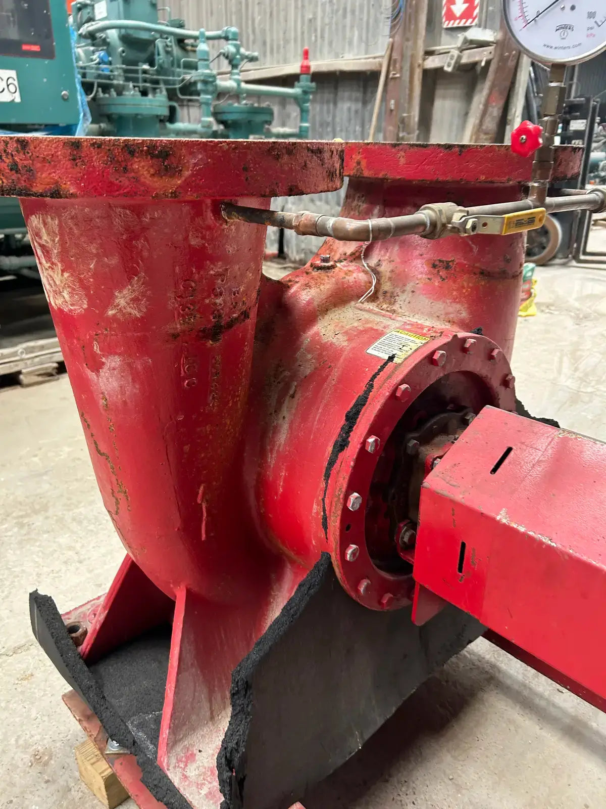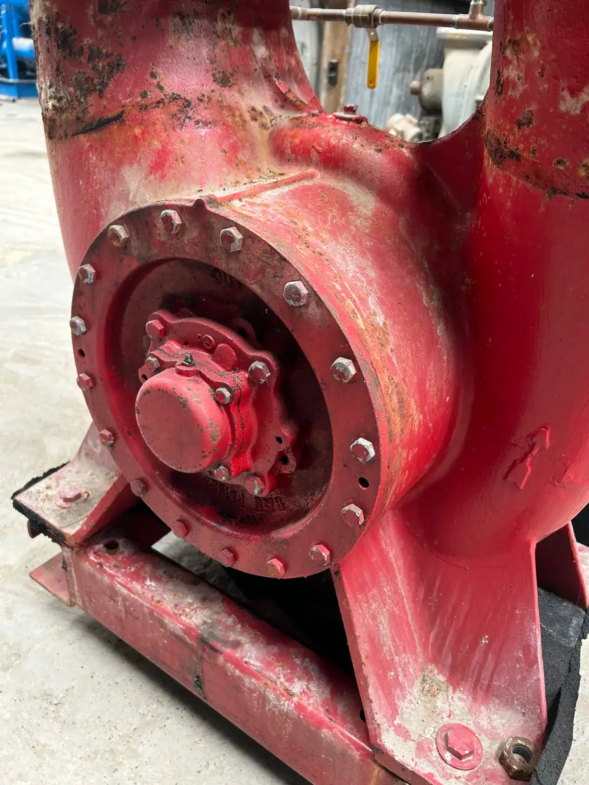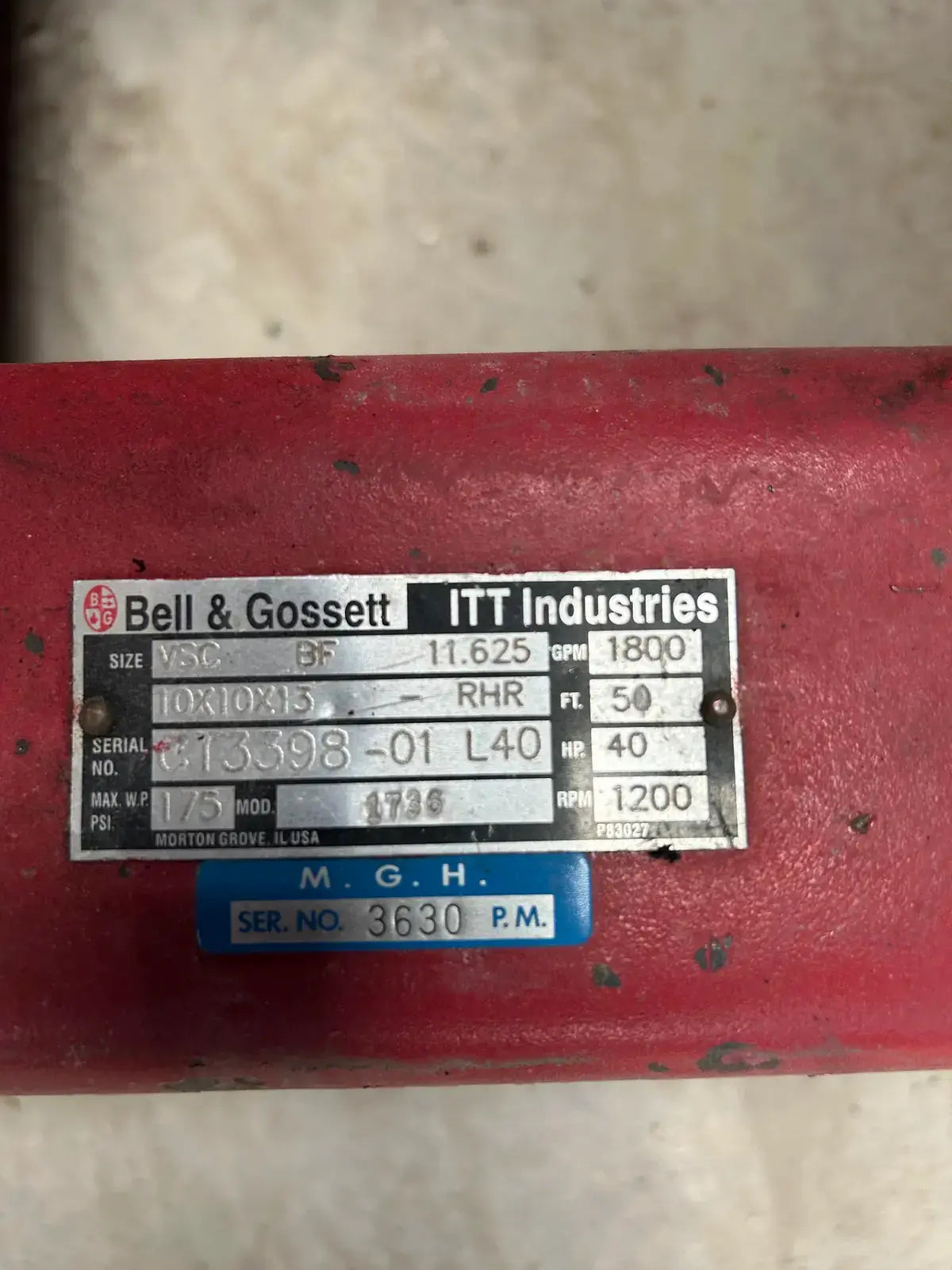 Bomba centrífuga vertical de carcasa partida Bell & Gossett serie VSC. Modelo: VSC. N.º de serie: C13398-01 L40. Dimensiones: 10 x 10 x 13. Impulsor (pulg.): 11,625 pulgadas. Succión (pulg.): 10 pulgadas. Descarga (pulg.): 10 pulgadas. Presión máxima de trabajo (PSI): 175. Caudal máximo (GPM): 1800. RPM máximas: 1200.