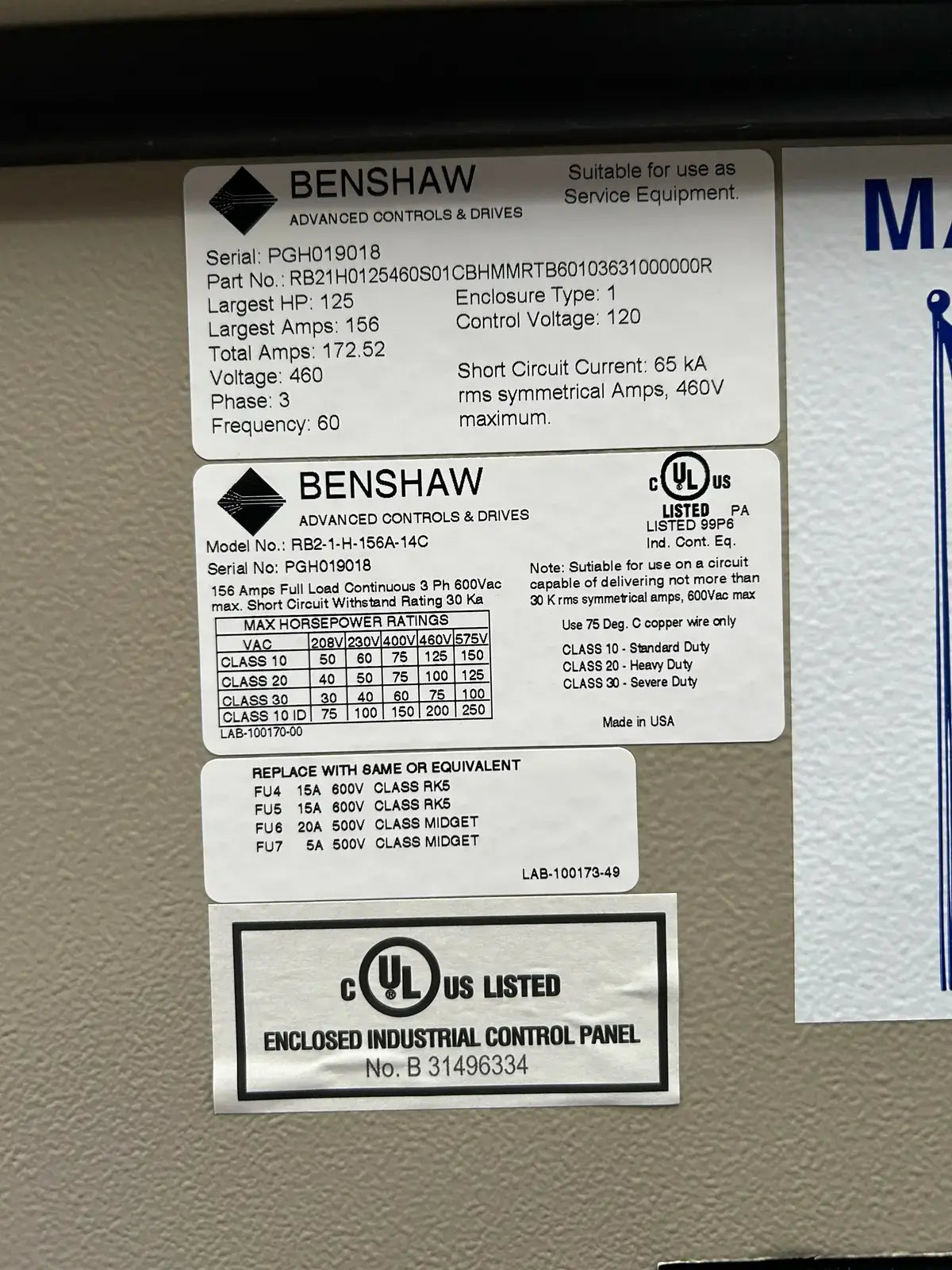 Arrancador de motor de compresor de tornillo Benshaw sin usar. Modelo: RB2-1-H-156A-14C. N.º de serie: PGH019018. N.º de pieza: RB21H0125460S01CBHMMRTB60103631000000R. Fuente de alimentación: Potencia máxima: 125 CV, Amperaje máximo: 156, Amperaje total: 172,52 V, Voltaje: 460 V, Trifásico: 3, Frecuencia: 60 Hz.