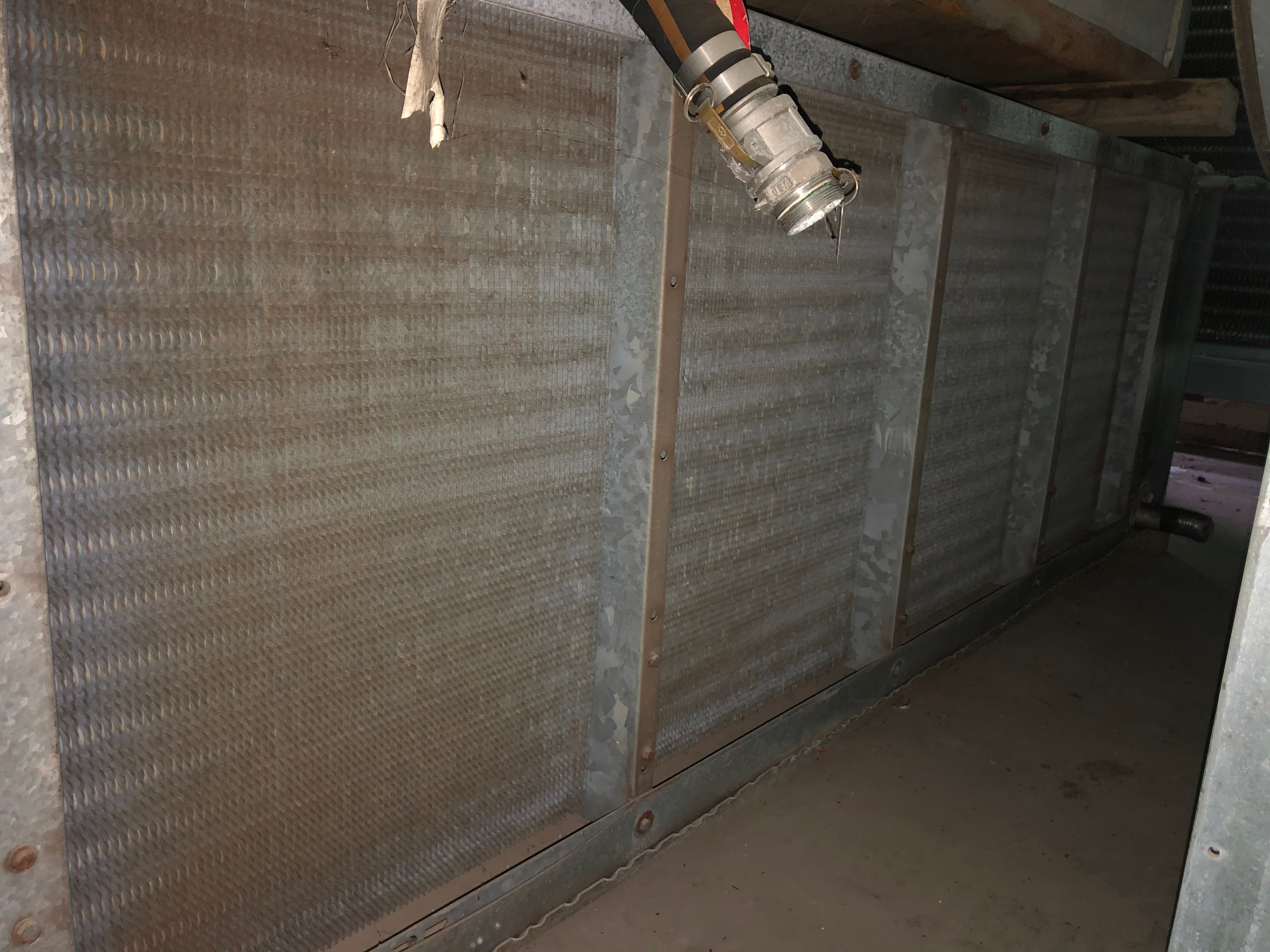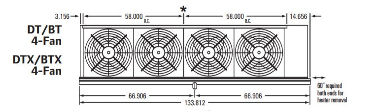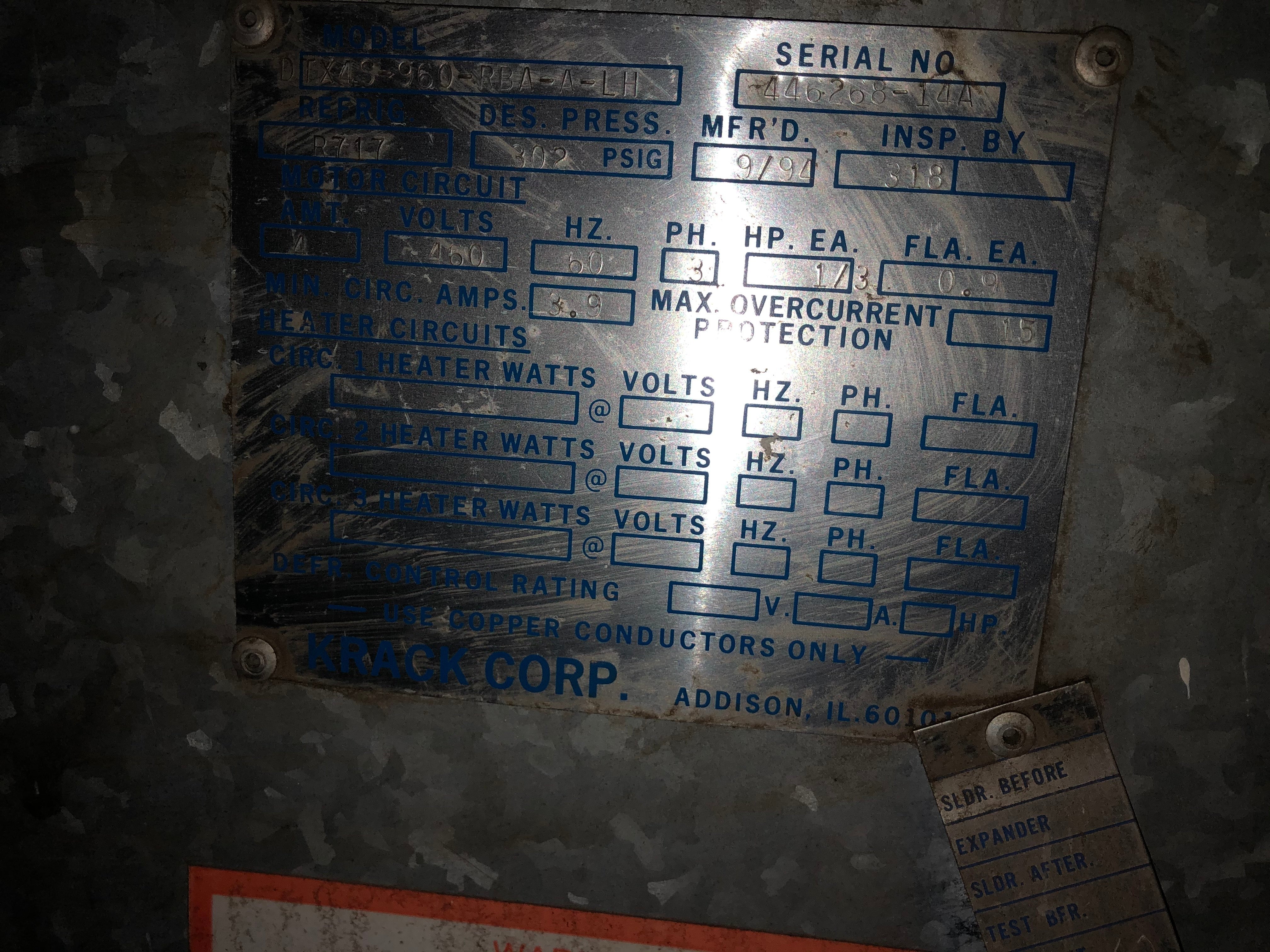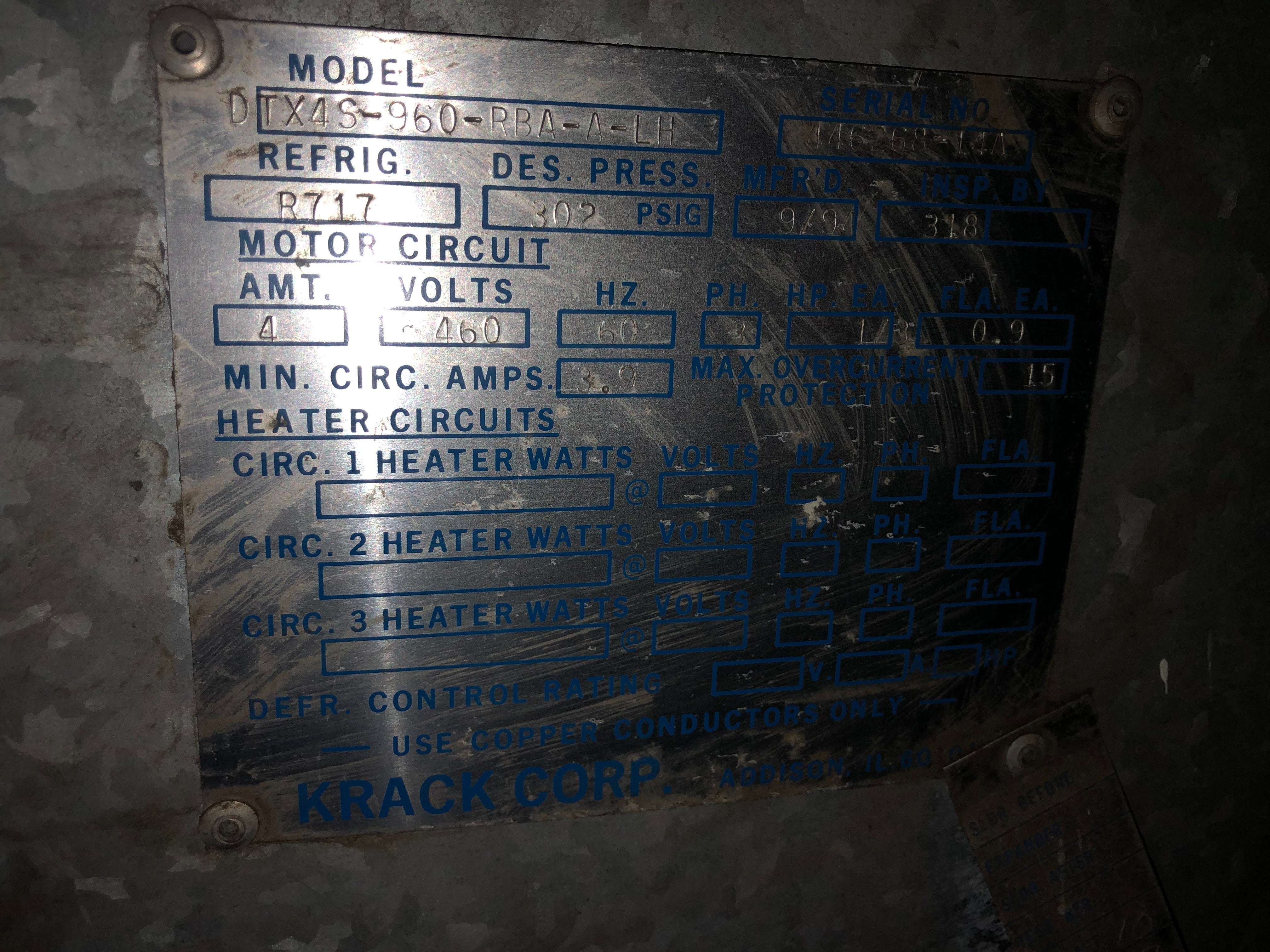 Evaporador de amoníaco de alimentación superior recirculado Krack de 4 ventiladores. Tubo/aleta de acero. 3 aletas/pulgada. Krack Modelo DTX-4S-960-RBA-A-LH, Mano izquierda. Draw-Thru de 4 ventiladores a baja temperatura. Evaporador de alimentación inferior recirculado. Flujo de aire 18,400, Capacidad @ 10ºF, TD:5.98TR, ID:AU12. Motores de ventilador: 1/3 HP 620 RPM 460 voltios 60 Hz.3 Ph. Dimensiones totales: 132" L x 35" W x 41" H.