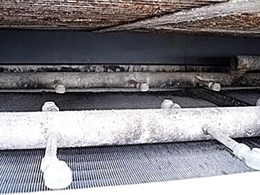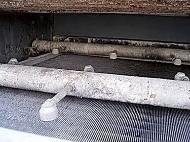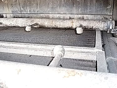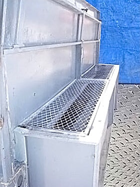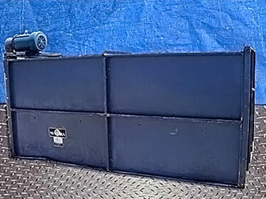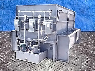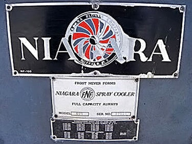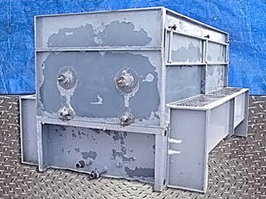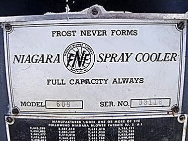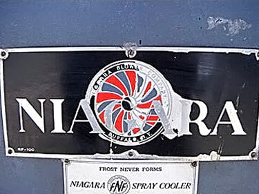 Niagara Frost Never Forms Spray Cooler/Condensador evaporativo. Modelo: 609. S/N: 33118. Los enfriadores por aspersión Niagara están diseñados para que "nunca se forme escarcha" y puedan funcionar a "capacidad máxima siempre". Ventiladores Centrífugos con Motor Eléctrico Reliance, 15 hp, 1750 rpm, 208-230/460 V, 39.8-36/18 amperios, 60 Hz, trifásicos. Diámetro de la polea motriz: 6-1/2 pulg. Diámetro de la polea conducida: 25-1/2 pulg. Relación de polea: 0,25. Rpm finales: 446. Bomba Sumergible con Motor General Electric, 1 hp, 3450 rpm, 230/460 V, 3.7/1.85 amperios, 60 Hz, trifásica. Bomba sumergible con motor eléctrico Reliance, 1 hp, 3450 rpm, 230/460 V, 3,2/1,6 amperios, 60 Hz, trifásica. (3) Interruptores de seguridad Westinghouse. Entradas: (1) puerto de entrada de solución sin escarcha de 3/4 pulg., (1) 1 pulg. de diámetro. Puerto auxiliar FNPT, (2) de 1-1/2 pulg. de diámetro. Puertos de entrada de refrigerante. Salidas: (2) 3 pulg. de diámetro. Puertos de descarga de refrigerante, (1) 2 pulg. de diámetro. puerto de drenaje, (1) 2 pulg. de diámetro. puerto de drenaje de desbordamiento, (2) respiraderos de 2 pies 7-1/2 pulgadas de largo x 2 pies 7 pulgadas de ancho. Dimensiones totales: 12 pies 6 pulgadas de largo x 8 pies de ancho x 13 pies de alto.