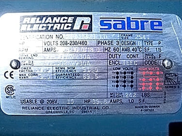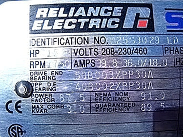 - Si hay varios motores, descripciones de motores frente a especificaciones: (1) 15 hp Centrifugal Fans with Reliance Electric Motor, (1) 1 hp Submersible Pump with General Electric Motor, (1) 1 hp Submersible Pump with Reliance Electric Motor