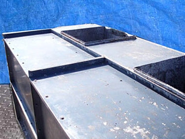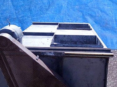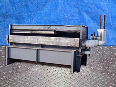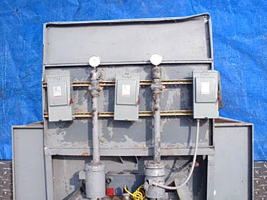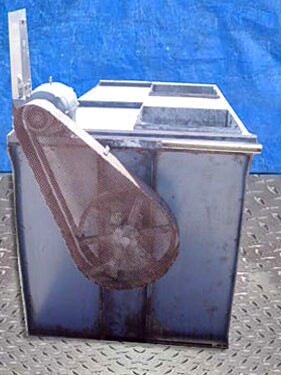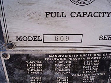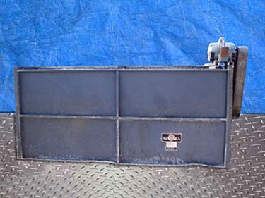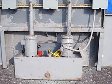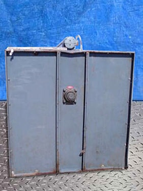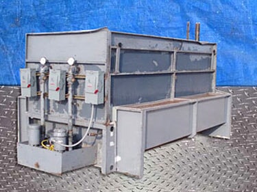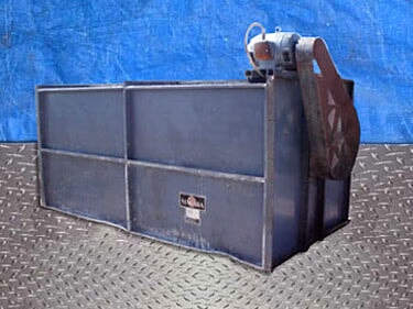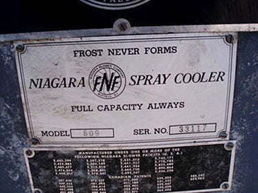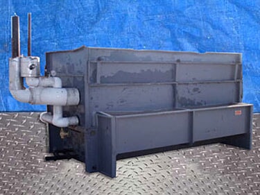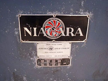 Niagara Frost Never Forms Spray Cooler/Condensador evaporativo. Modelo: 609. S/N: 33117. Los enfriadores por aspersión Niagara están diseñados para que "nunca se forme escarcha" y puedan funcionar a "capacidad máxima siempre". Ventiladores Centrífugos con Motor Eléctrico Marcapasos, 15 hp, 1750 rpm, 208-220/440 V, 42-40/20 amperios, 60 Hz, Trifásicos. Diámetro de la polea motriz: 6-1/2 pulg. Diámetro de la polea conducida: 25-1/2 pulg. Relación de polea: 0,25. Rpm finales: 446. Bomba Sumergible con Motor Baldor, 1 hp, 3450 rpm, 208-230/460 V, 4-3.2/1.6 amperios, 60 Hz, trifásica. Bomba Sumergible con Motor Eléctrico US, 1 hp, 3600 rpm, 220/440 V, 3.6/1.8 amperios, 60 Hz, trifásica. (3) Interruptores de seguridad Westinghouse. Entradas: (1) puerto de entrada de solución sin escarcha de 3/4 pulg., (1) 1 pulg. de diámetro. Puerto auxiliar FNPT, (2) de 1-1/2 pulg. de diámetro. Puertos de entrada de refrigerante. Salidas: (2) 3-1/2 pulg. de diámetro. Puertos de descarga de refrigerante, (1) 2 pulg. de diámetro. puerto de drenaje, (1) 2 pulg. de diámetro. puerto de drenaje de desbordamiento, (2) respiraderos de 2 pies 7-1/2 pulgadas de largo x 2 pies 7 pulgadas de ancho. Dimensiones totales: 16 pies 4 pulgadas de largo x 8 pies de ancho x 14 pies 8 pulgadas de alto.