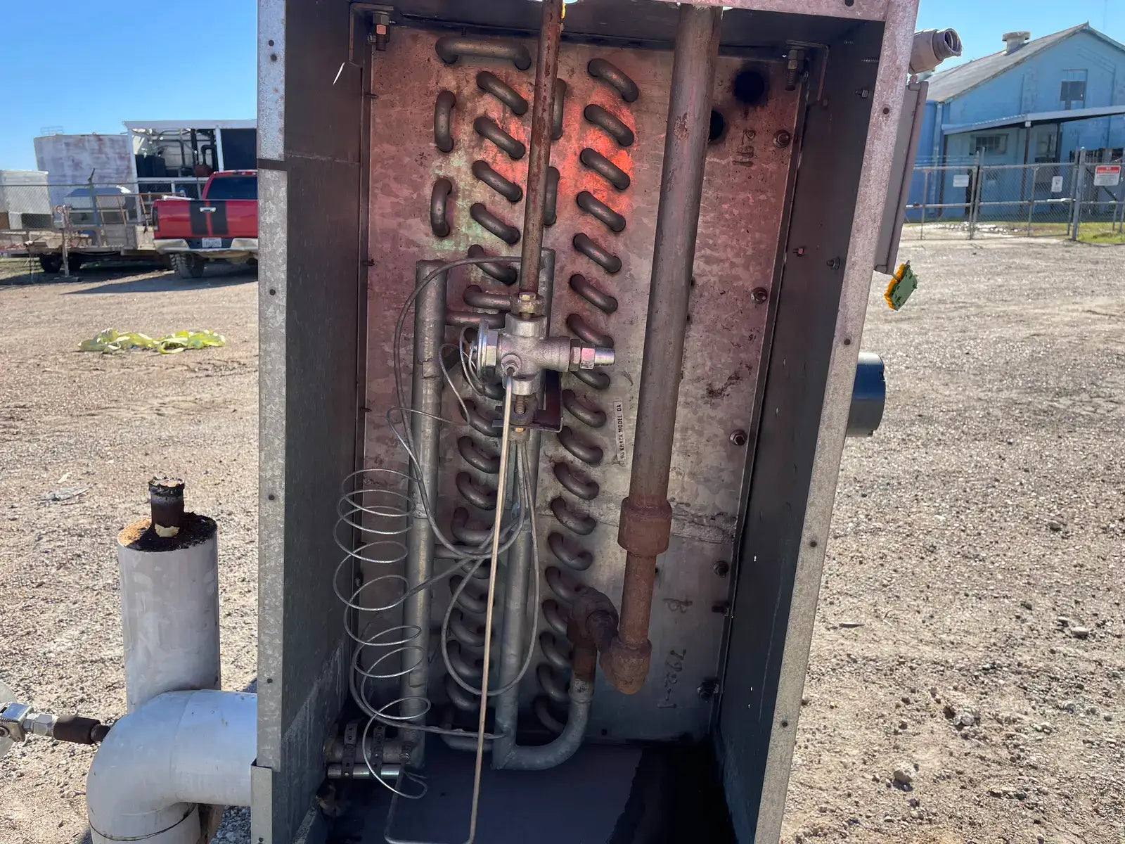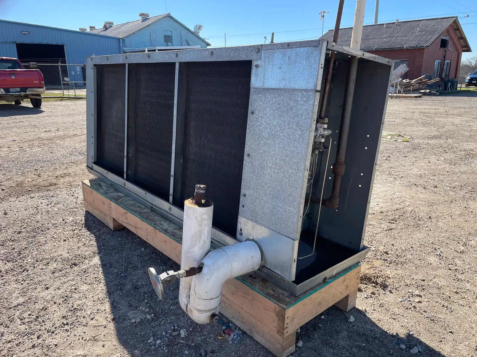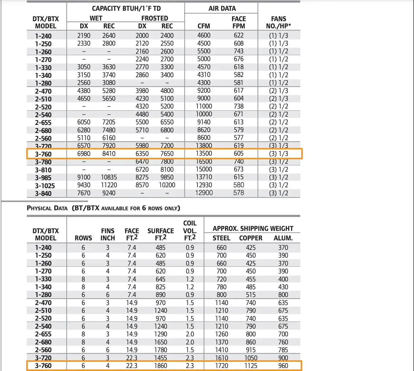 Serpentín evaporador serie DTX. Modelo: DTX3S-760-DXA-HGC-LH. Número de serie: 478792-01B. Capacidad BTUH/1F TD húmedo (DX): 6980. Capacidad BTUH/1F TD esmerilado (DX): 6350. CFM: 13500. FPM frontal: 605. Ventiladores (3): 1/3 HP. Filas: 6. Aletas por pulgada: 4. Cara Ft2: 1860. Volumen de la bobina: 2,3. Peso aproximado de envío: 1720 LBS.