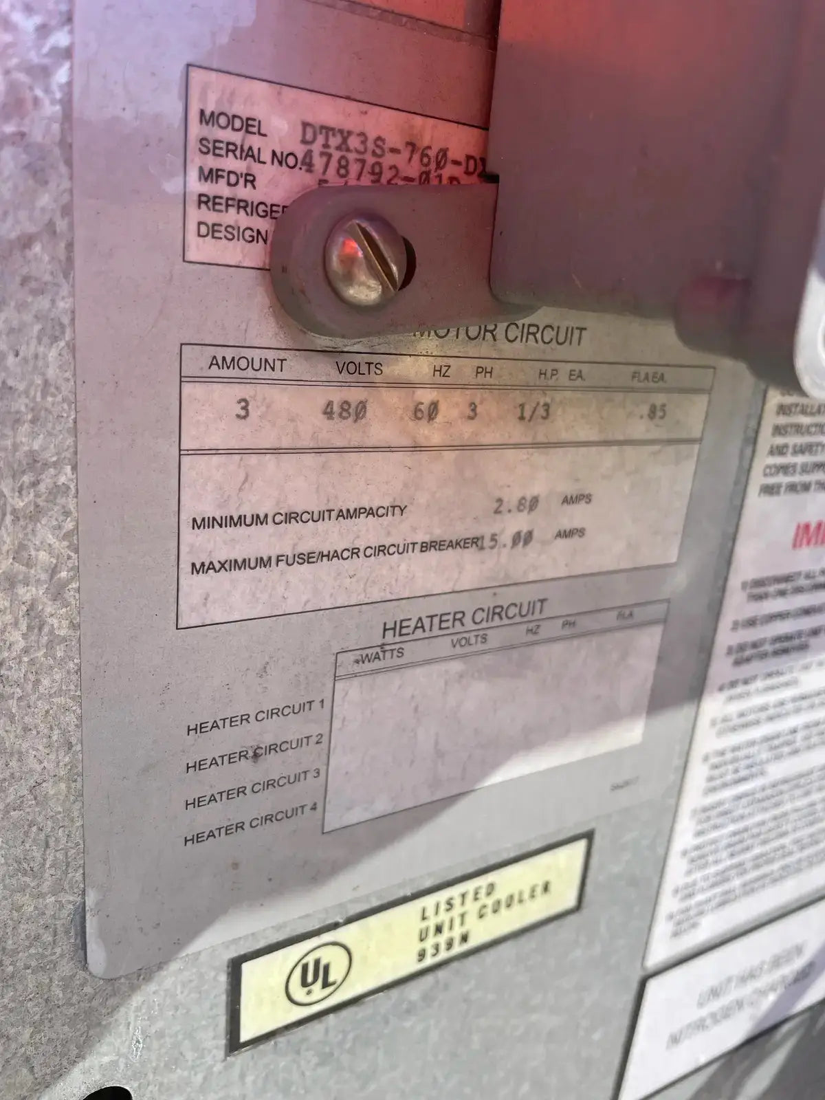 - Si hay varios motores, descripciones de motores frente a especificaciones: Fan Motor: Qty: 3, HP: 0.75, Volts: 480, Ph: 3, Amps: 0.85.