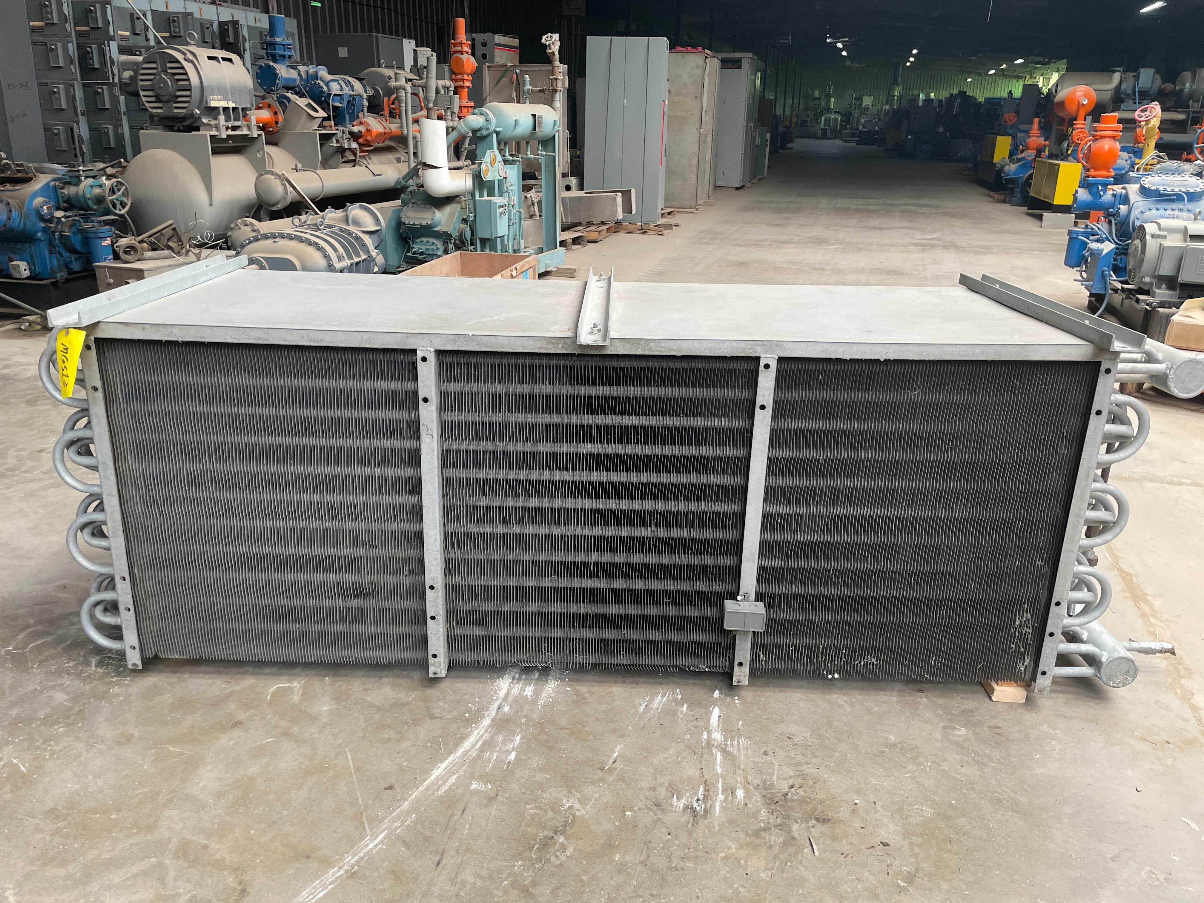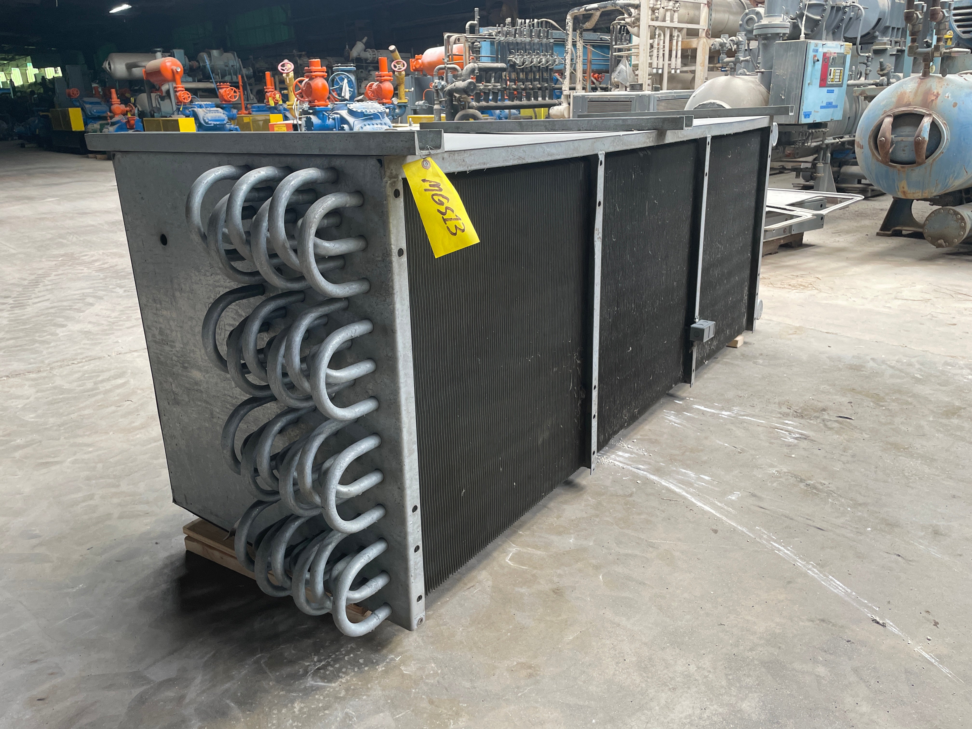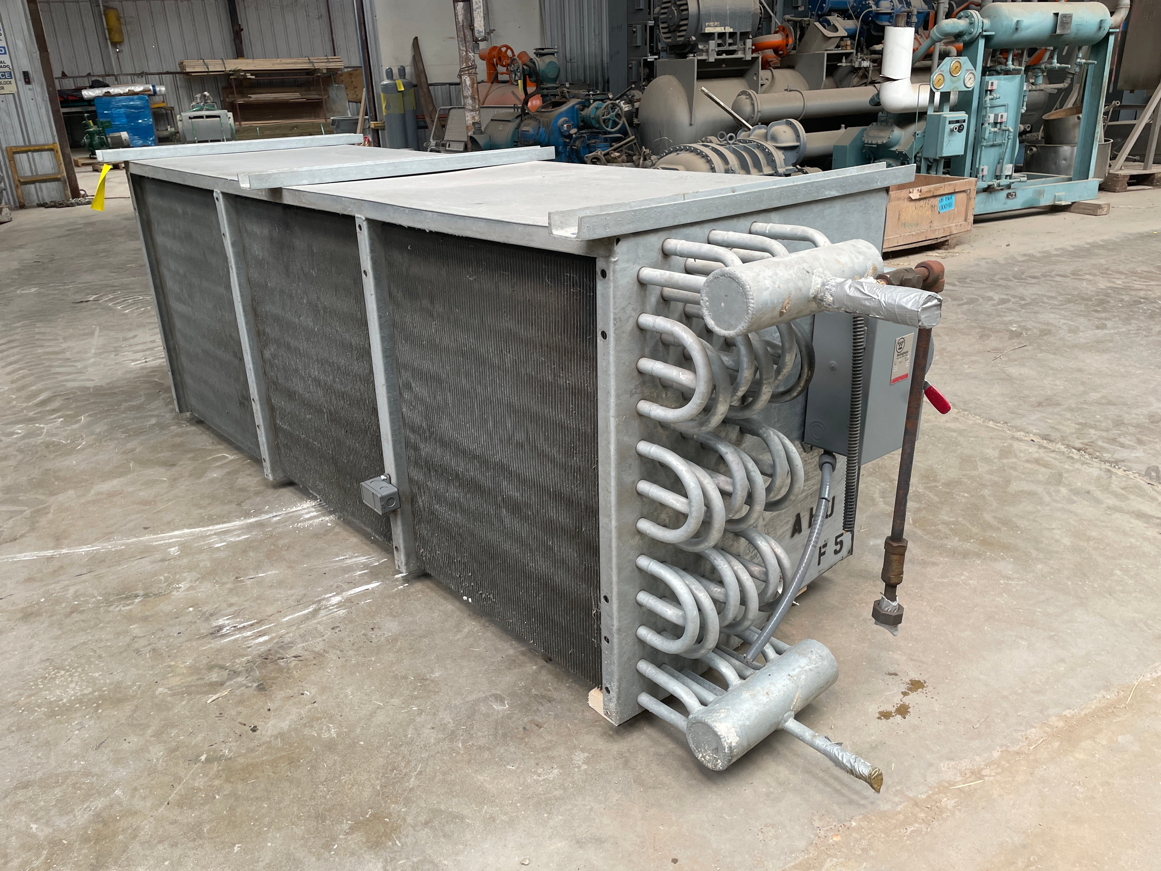 Serpentín evaporador de amoníaco Vilter SC 24-64-1/2-RA-HGC - 11TR 3 ventiladores (baja temperatura) Este serpentín evaporador utiliza serpentines esmerilados de baja temperatura. Una capacidad de 9060 (BTUH / °F TD) y un tonelaje estimado de 11(TR) @15TD. Un flujo de aire de 15000 CFM y una velocidad frontal de 625 FPM. Baterías de expansión directa alimentadas por la parte superior con sistema de descongelación por gas. Esta unidad anteriormente funcionaba con amoníaco. El paquete incluye 3 motores para los ventiladores.