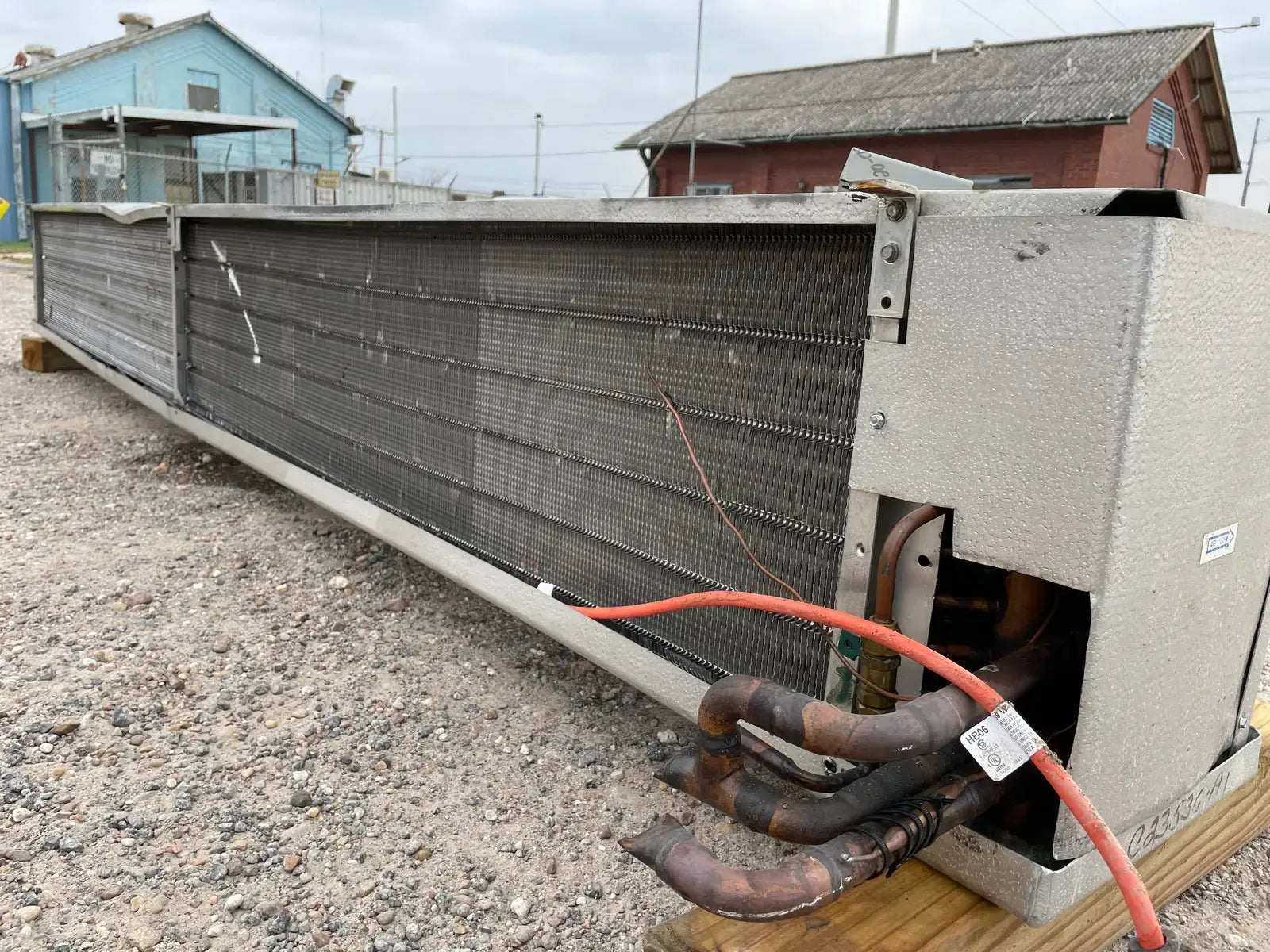 Bobina del evaporador Bohn. Modelo: HGT2040F. Número de serie: DOC 4530. Número de circuito/Motores de ventilador: voltios: 115, fase: 1, Hz: 60, amperios totales: 12,6. Ampacidad mínima del circuito: 13.13. Tamaño máximo de fusible: 20, HP: 1/20, Ph: 1. No. de ventiladores: 6. Conexiones - Entrada de bobina ODF: 1-1/8, ID de succión: 1-1/8, Ecualizador externo: 1/4, Drenaje MPT: 3/4, puerto lateral OD: 3/8. Conexión Gas Caliente: 5/8.