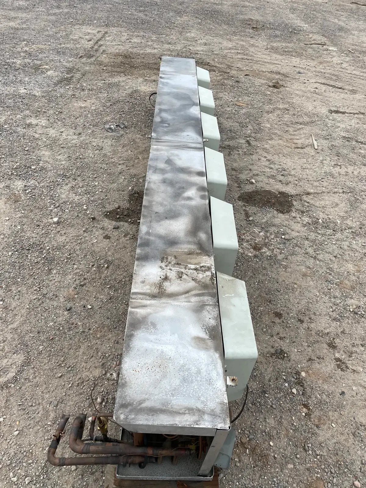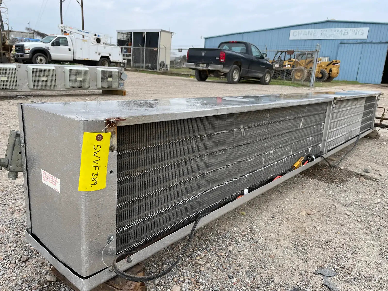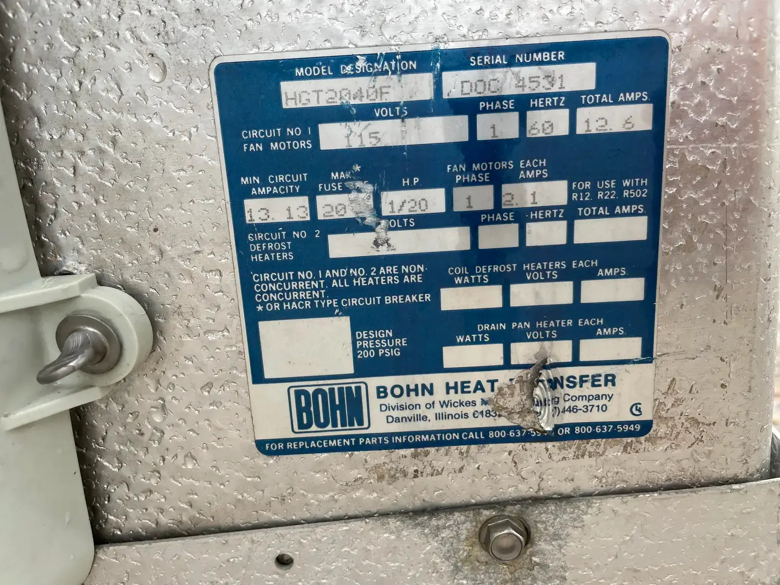 Bobina del evaporador Bohn. Modelo: HGT2040F. Número de serie: DOC 4531. Número de circuito/Motores de ventilador: voltios: 115, fase: 1, Hz: 60, amperios totales: 12,6. Ampacidad mínima del circuito: 13.13. Tamaño máximo de fusible: 20, HP: 1/20, Ph: 1. No. de ventiladores: 6. Conexiones - Entrada de bobina ODF: 1-1/8, ID de succión: 1-1/8, Ecualizador externo: 1/4, Drenaje MPT: 3/4, puerto lateral OD: 3/8. Conexión Gas Caliente: 5/8.
