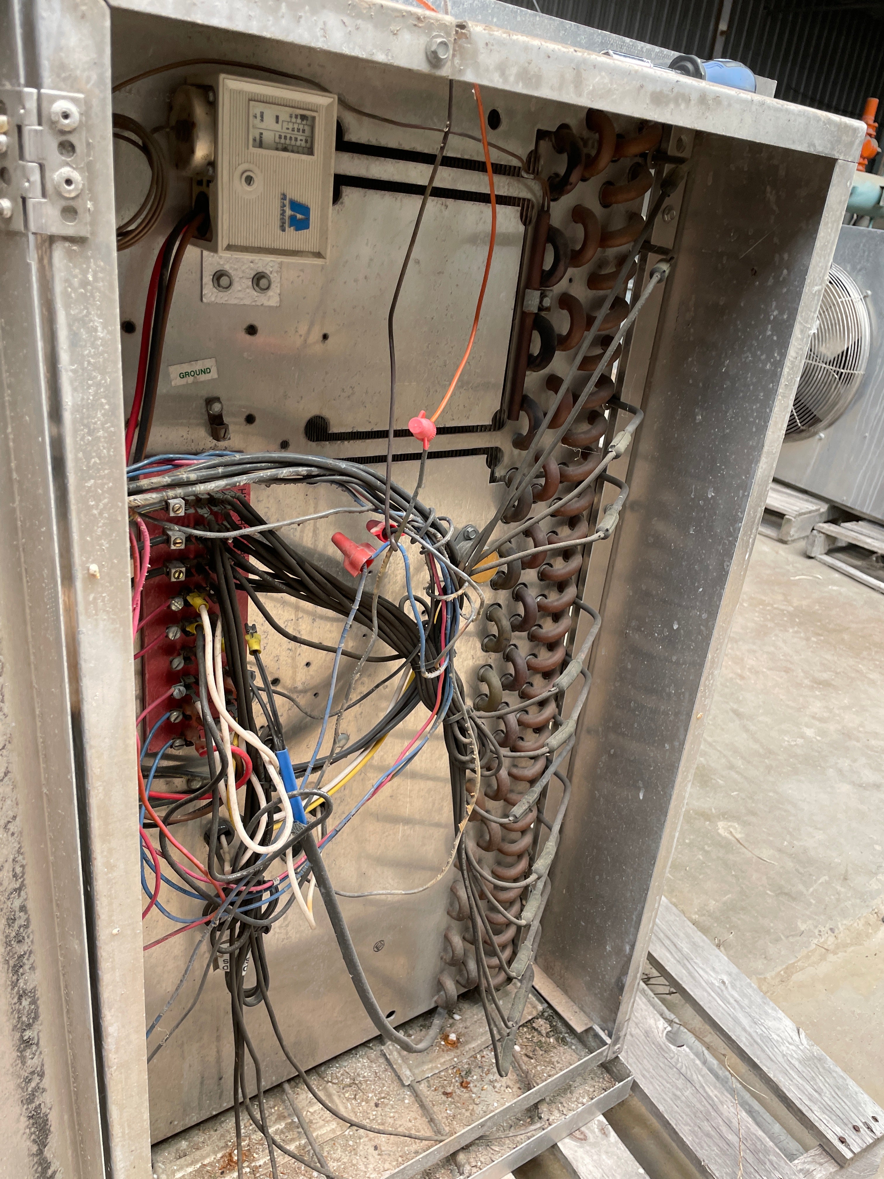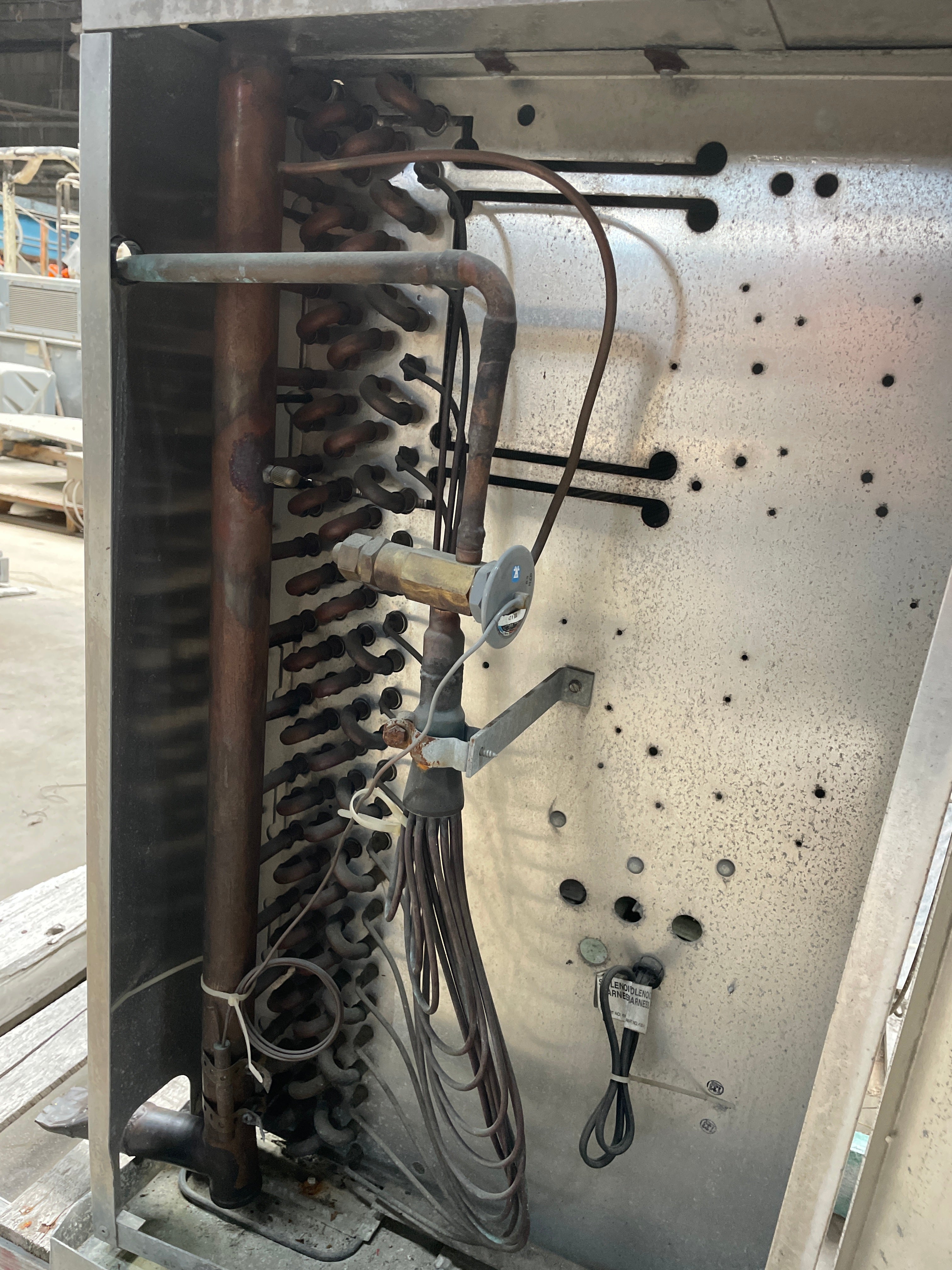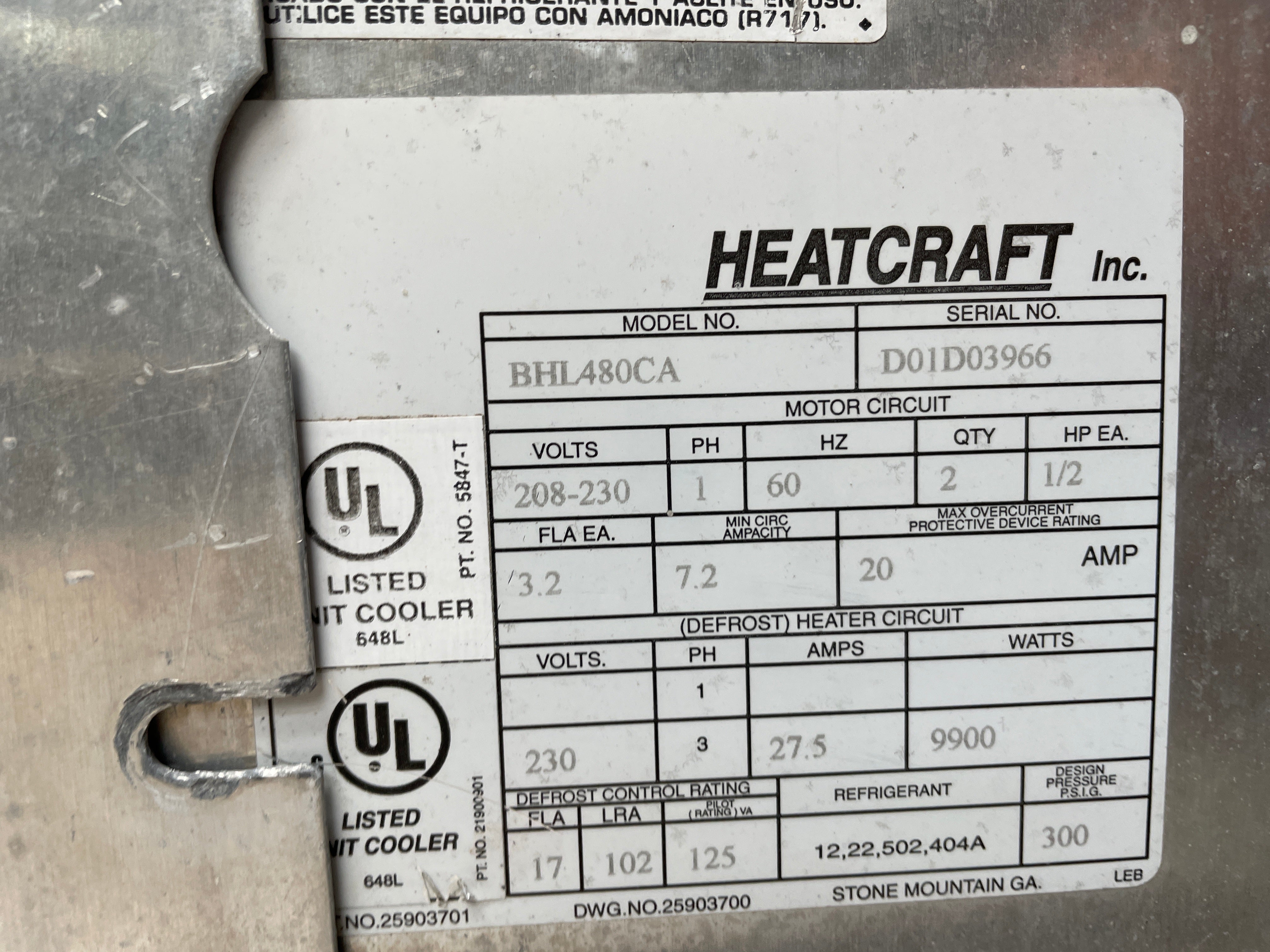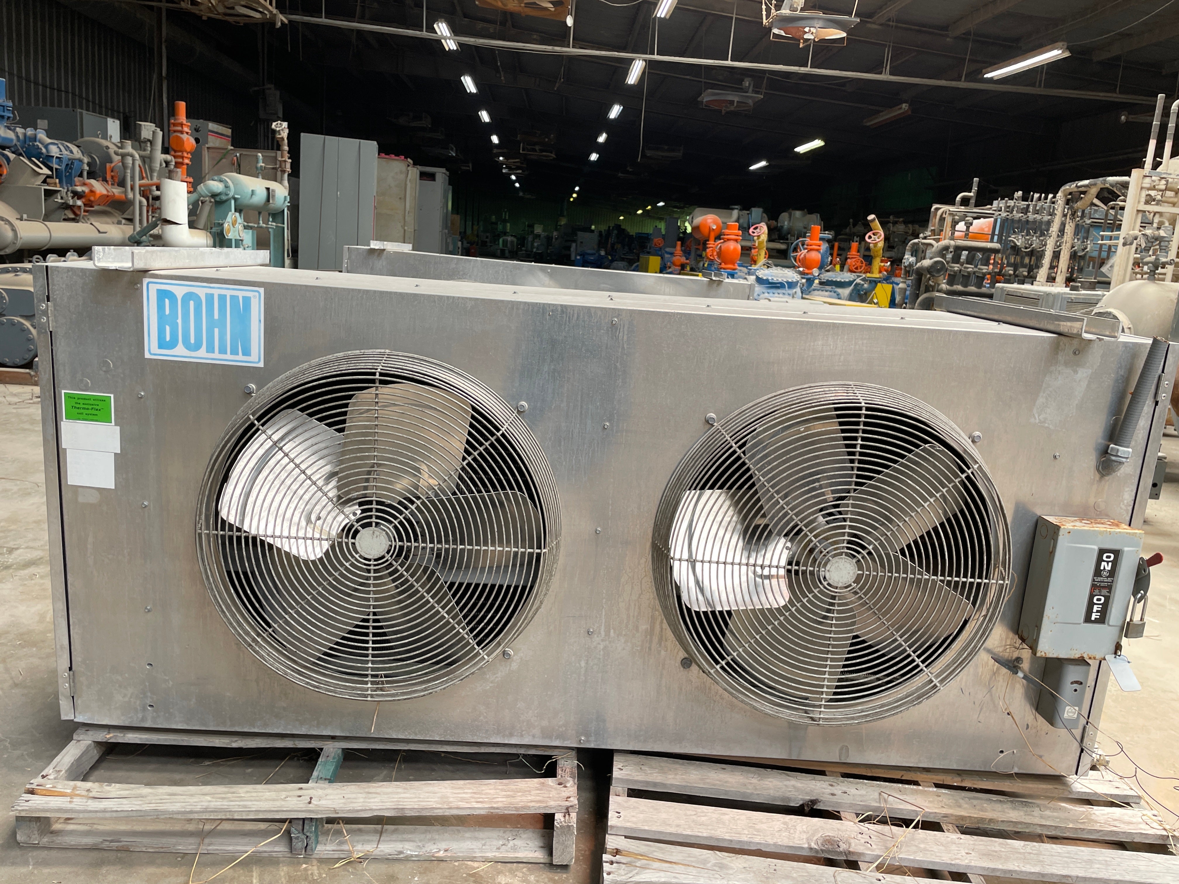 Bobina de evaporador de freón Bohn (Heatcraft) BHL480CA: 4 toneladas, 2 ventiladores (baja temperatura) Número de serie: D01D03967. Bobinas esmeriladas con una capacidad de 4800 (BTUH / °F TD) y un tonelaje de 6(TR) @15TD. Flujo de aire de 9400 CRM. Baterías inundadas con alimentación superior y desescarche eléctrico. 4 aletas por pulgada y 2 ventiladores. Utilizado anteriormente con freón.