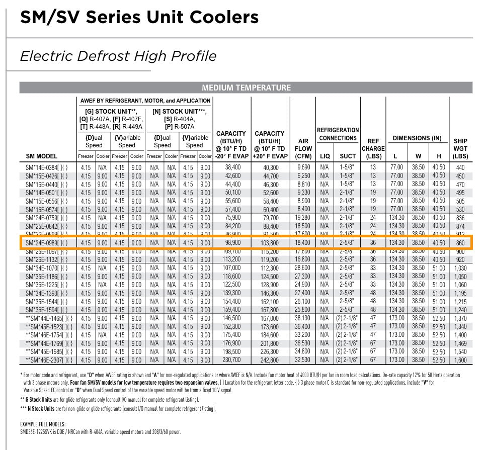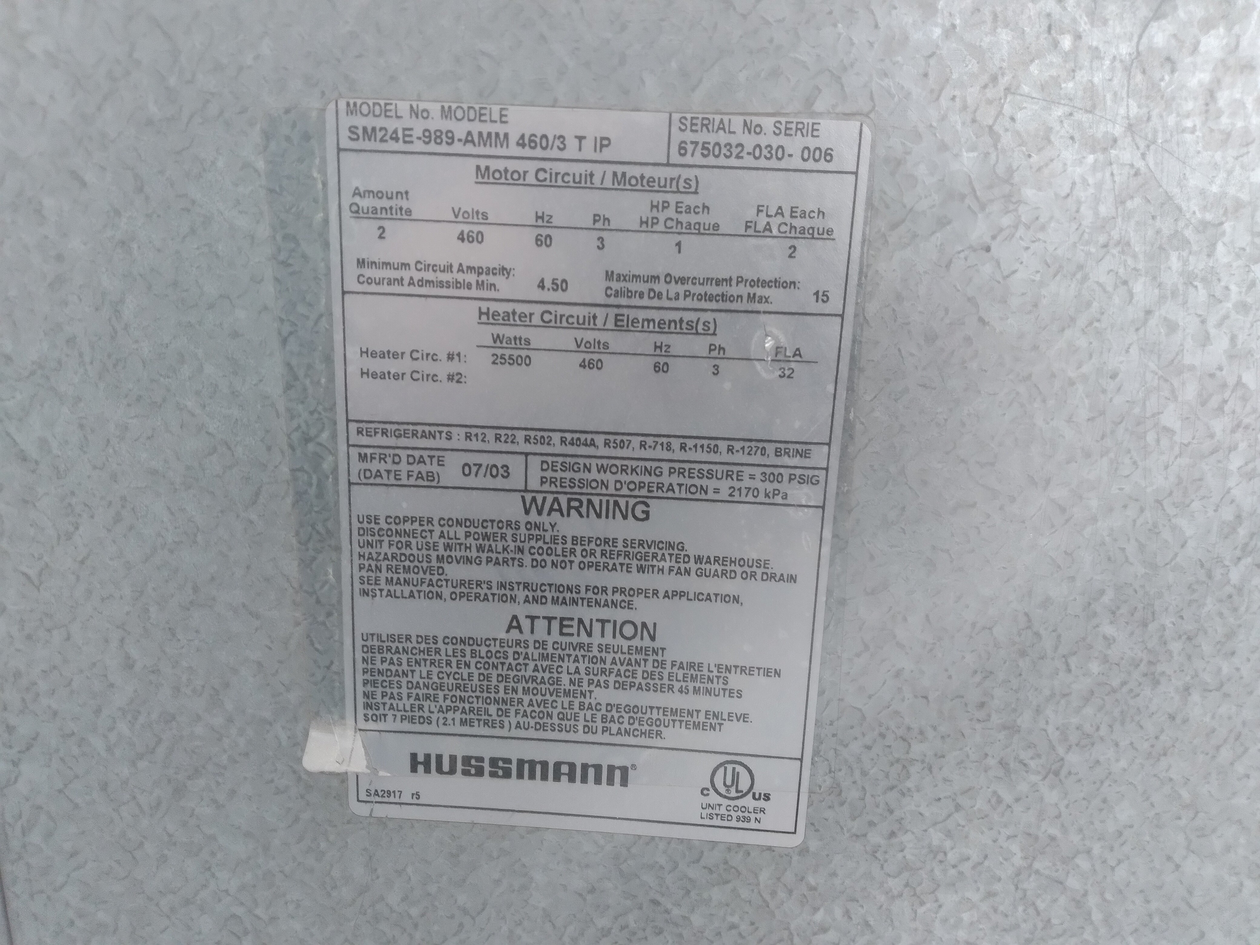 Serpentín evaporador Hussmann SM24E-989-AMM 460/3 T IP - 12.975 TR, 2 ventiladores (temperatura baja/media) Este serpentín evaporador se puede utilizar con serpentines húmedos o esmerilados. Un Frosted con una capacidad de 9890 (BTUH / °F TD) con un tonelaje estimado de 12(TR) @15TD(TR) @15TD. Una capacidad húmeda de 10380 (BTUH / °F TD) con un tonelaje estimado de 12,975(TR) @15TD. Un flujo de aire de 18400 CFM. Baterías de alimentación superior recirculadas con descongelación eléctrica. 4 aletas por pulgada y 2 ventiladores. Utilizado anteriormente con freón.