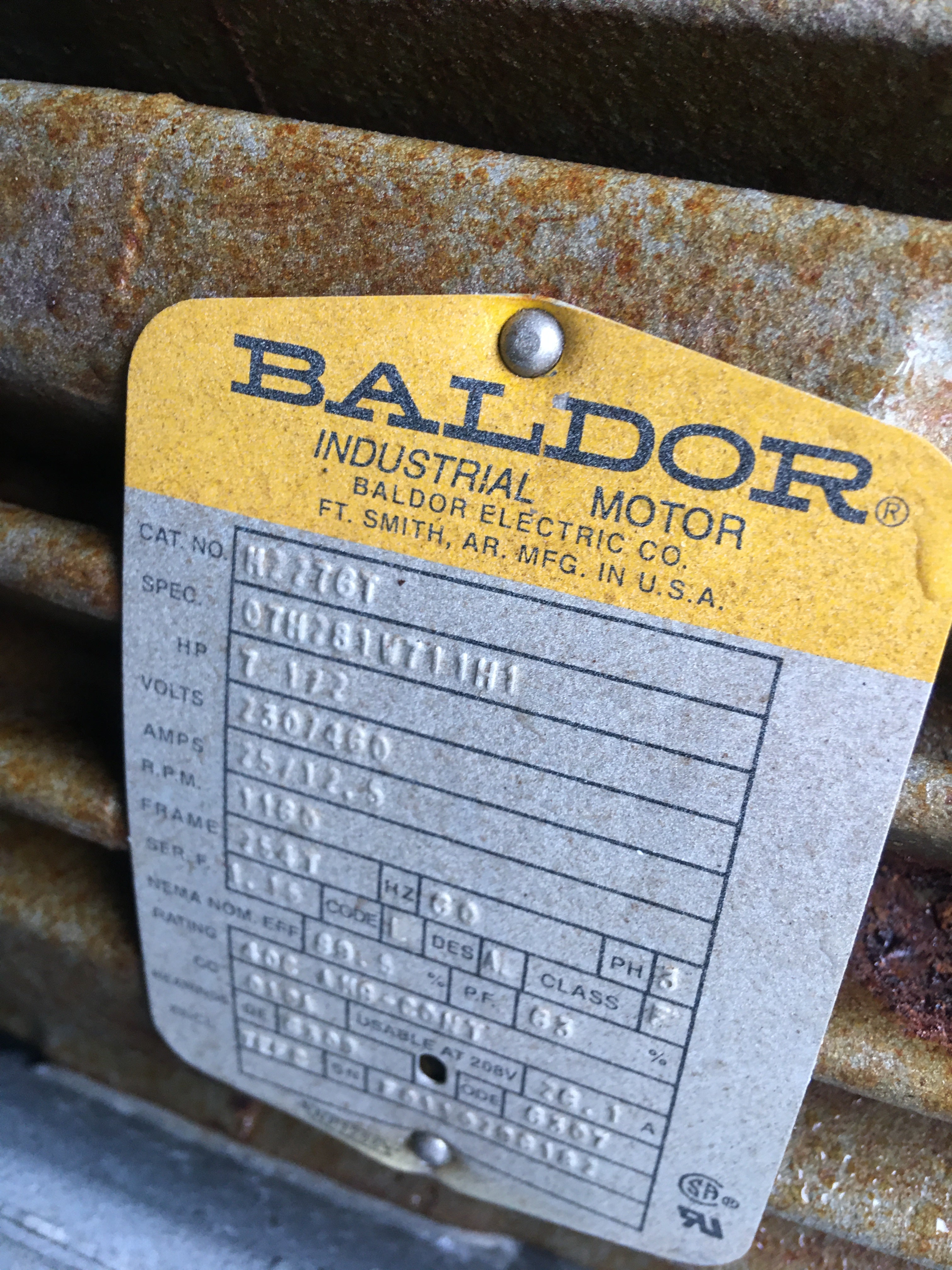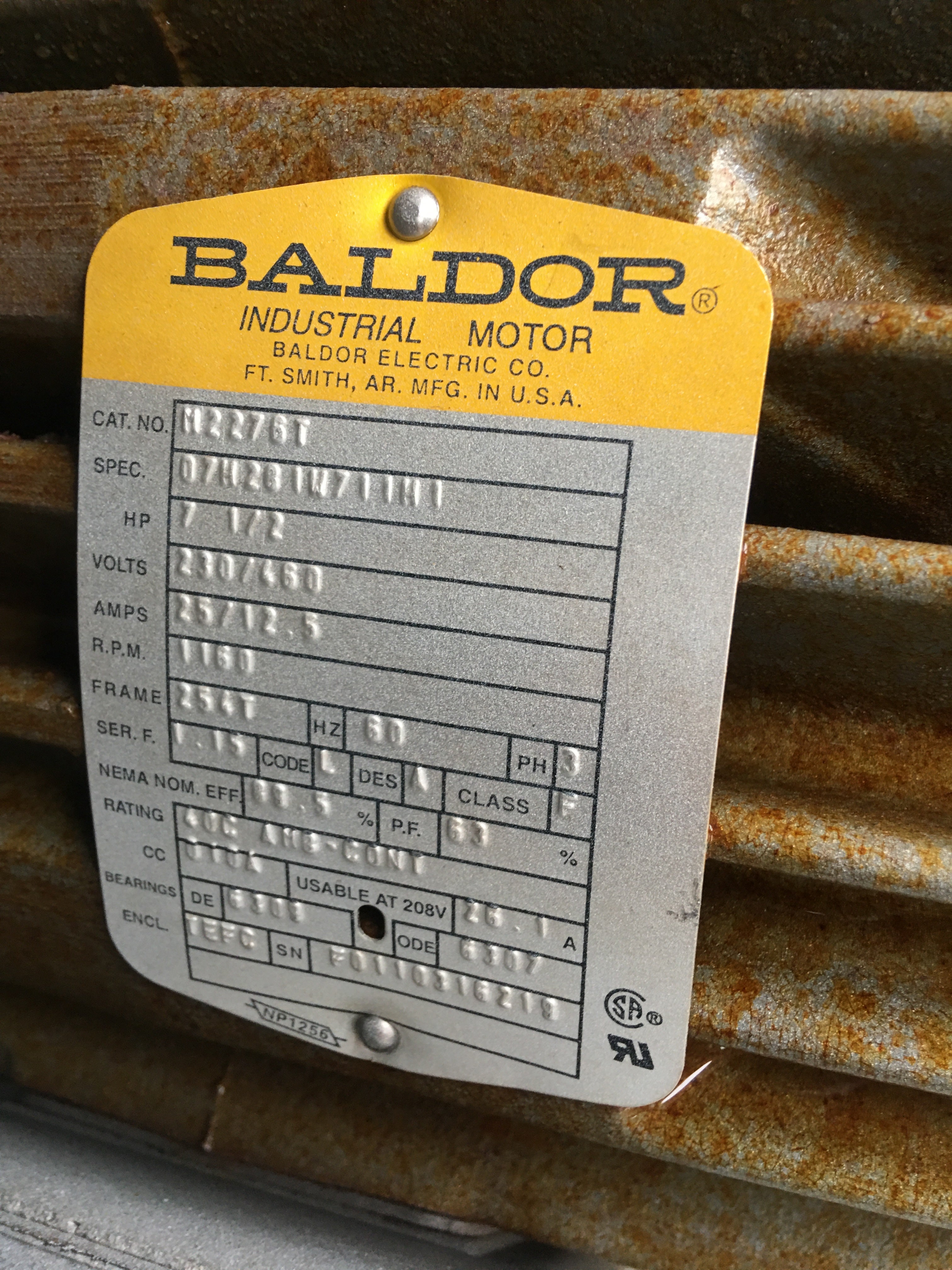 Evaporador de amoníaco Krack: Número de modelo: PCS2L-5310-1.5/3-7.5RBA-HGURH, Número de serie: 541165-10A, Fabricante: 1/00, Refrigerante: R-717, Presión de diseño. Circuito Motor: Cantidad: 2, Voltios: 460, Hz: 60, Ph: 3, Hp: 7.5, Fla Ea: 12.50. Ampacidad mínima del circuito: 15,62 amperios, fusible máximo/disyuntor Hacr: 25,00 amperios. Motor Baldor: Cat No: H2276T, Especificaciones: 07H291W711H1, Hp: 7 1/2, Voltios: 230/460, Amperios: 25/12.5, Rpm: 1160, Marco: 254T, Hz: 60, Ph: 3, Clasificación: 400 AKB-Cont, utilizable a 208v.