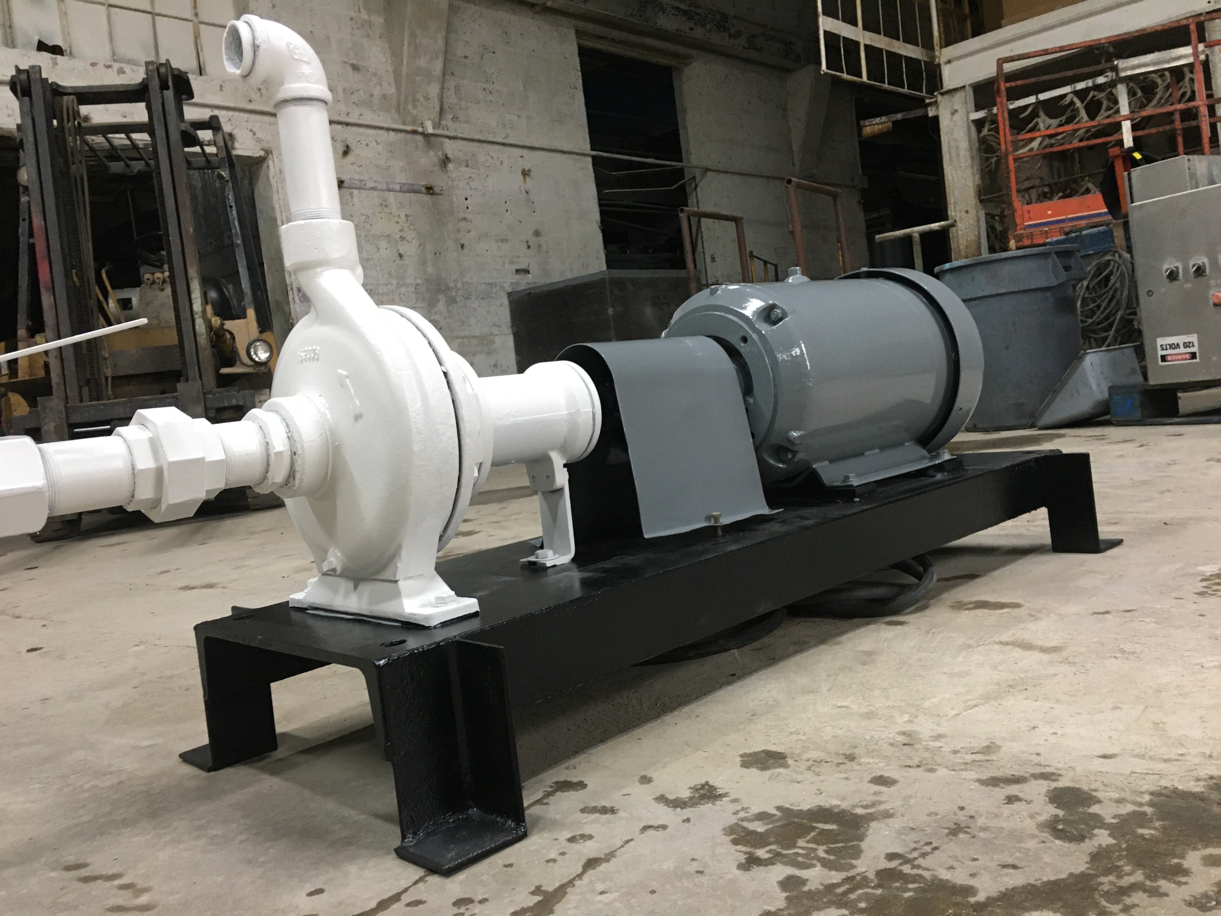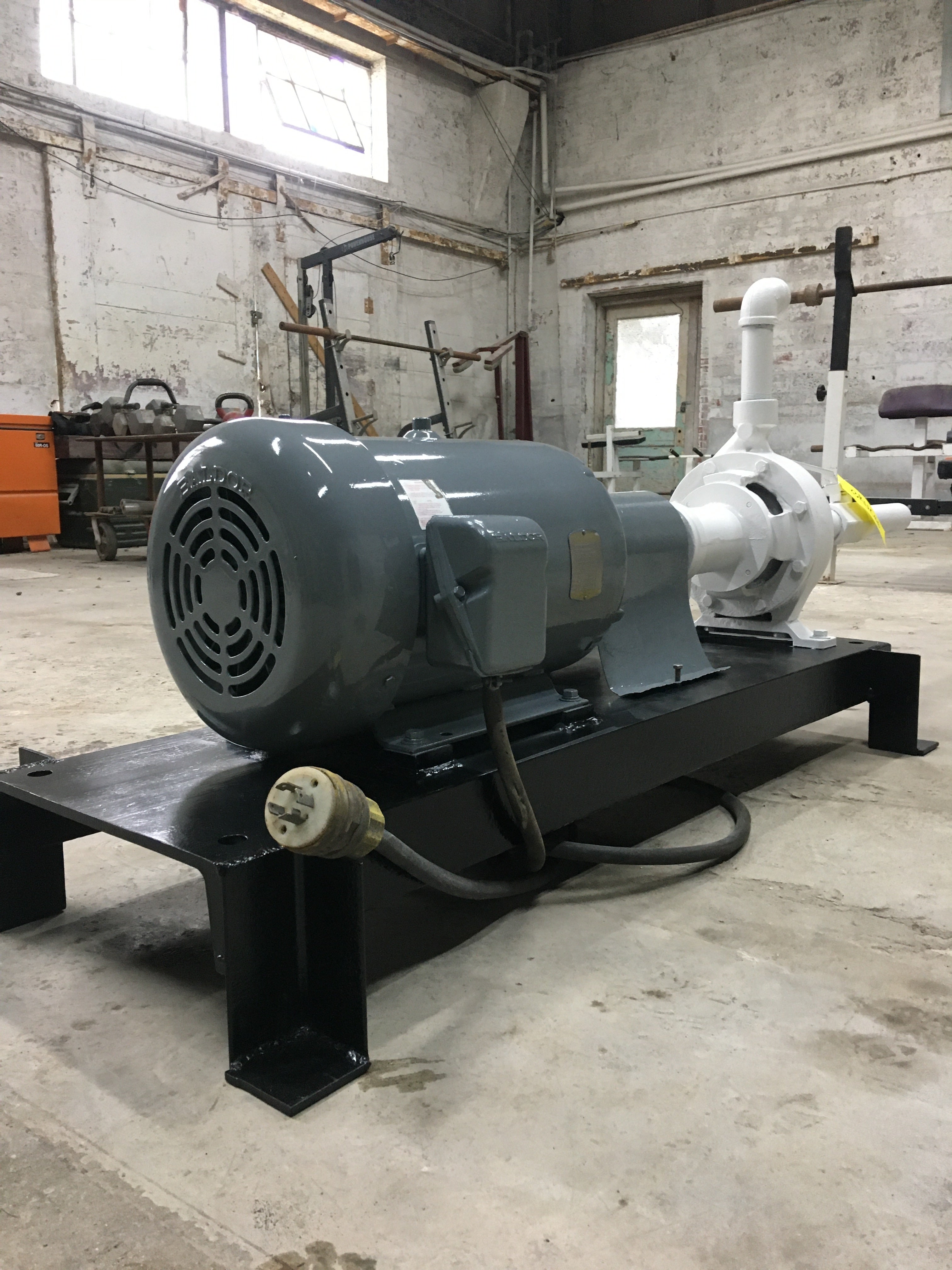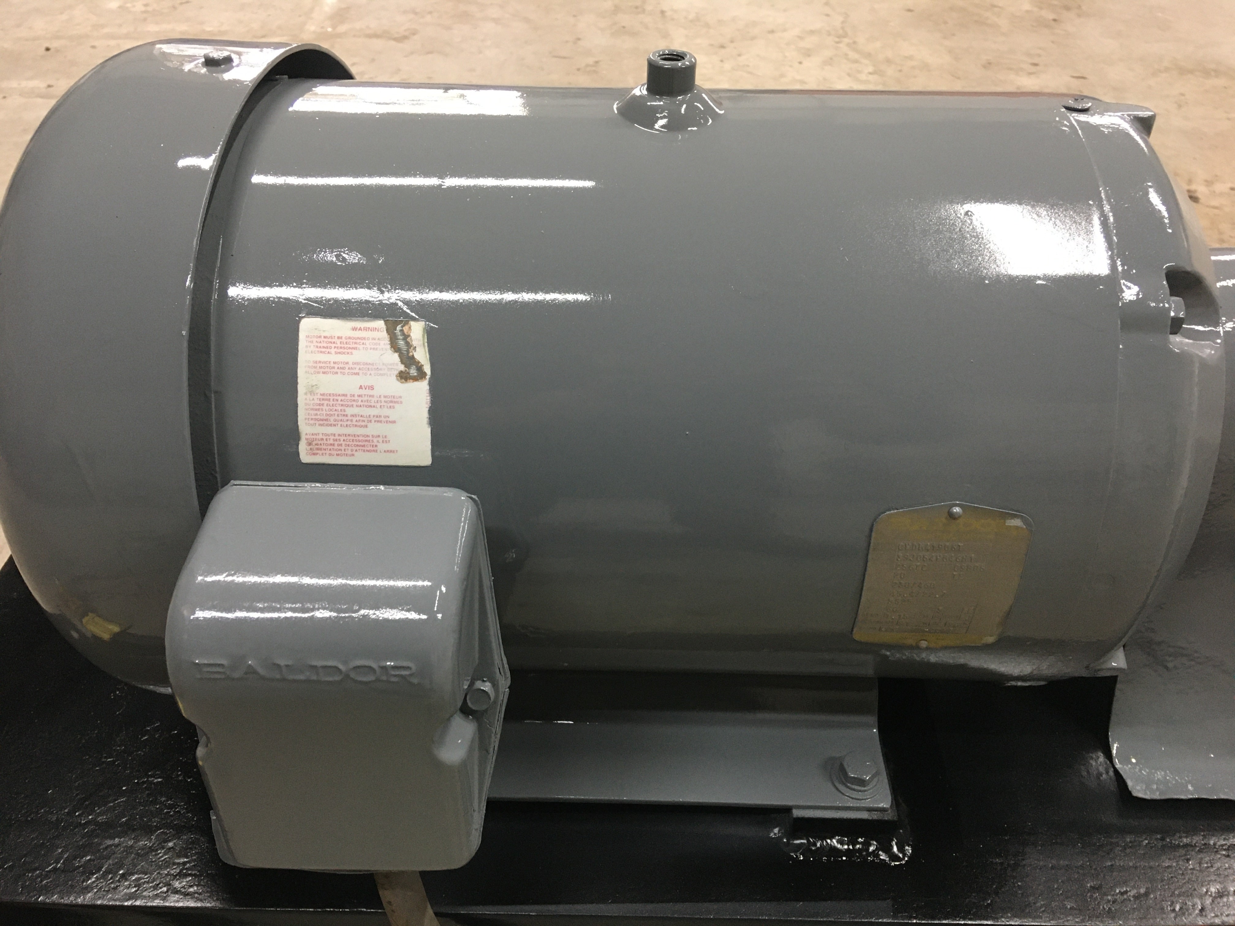Bomba centrífuga - Montada sobre base de acero dulce. 1-5/8 pulg. NPT x 1-5/8 pulg. NPT. A la bomba le falta la placa de datos de la bomba. Anteriormente, la bomba centrífuga se combinaba con un intercambiador de calor de carcasa y tubos. Motor Baldor - Cat No: CWDDN41906T, Especificaciones: 39J054W846H1, Marco: 256TC, Ser: 09805, Hp: 20, Voltios: 230/460, Amperios 45.4/22.7, Rpm: 3525, Hz: 60, Ph: 3, Clase: F , Código: J, Clasificación: 40C AMB-CONT, Nema Mom. Ef: 91%. Anteriormente funcionaba en una unidad intercambiadora de tubos y calor.