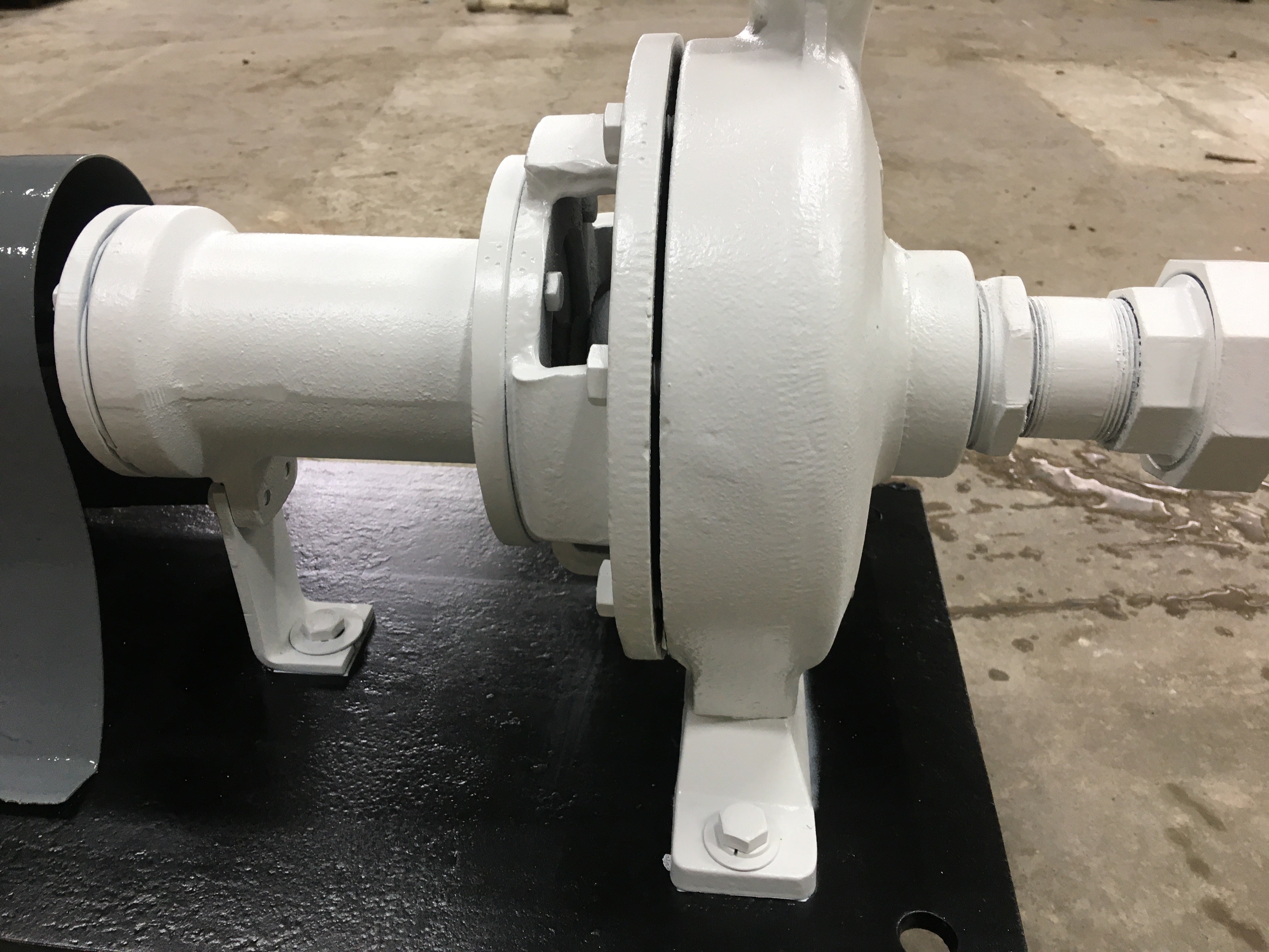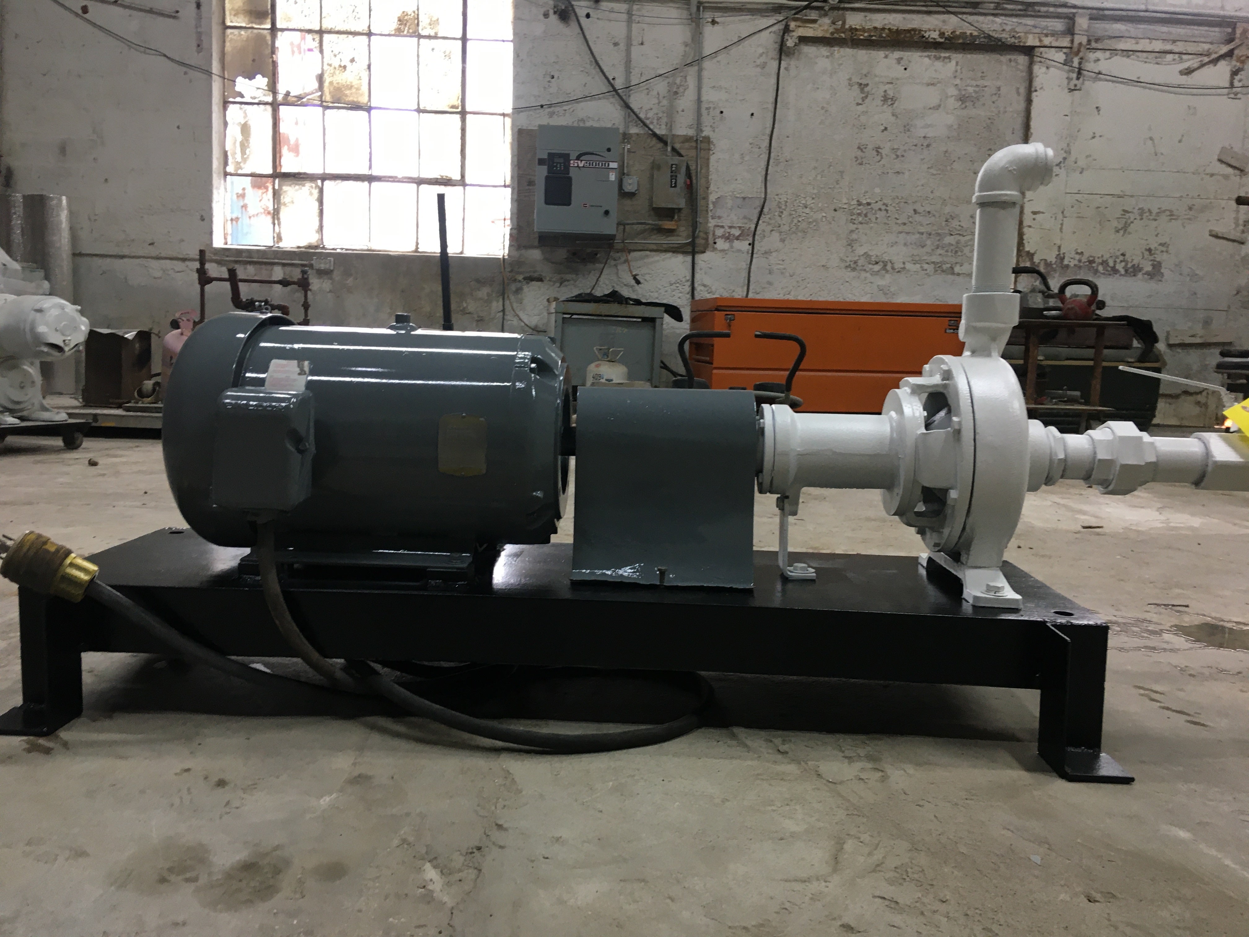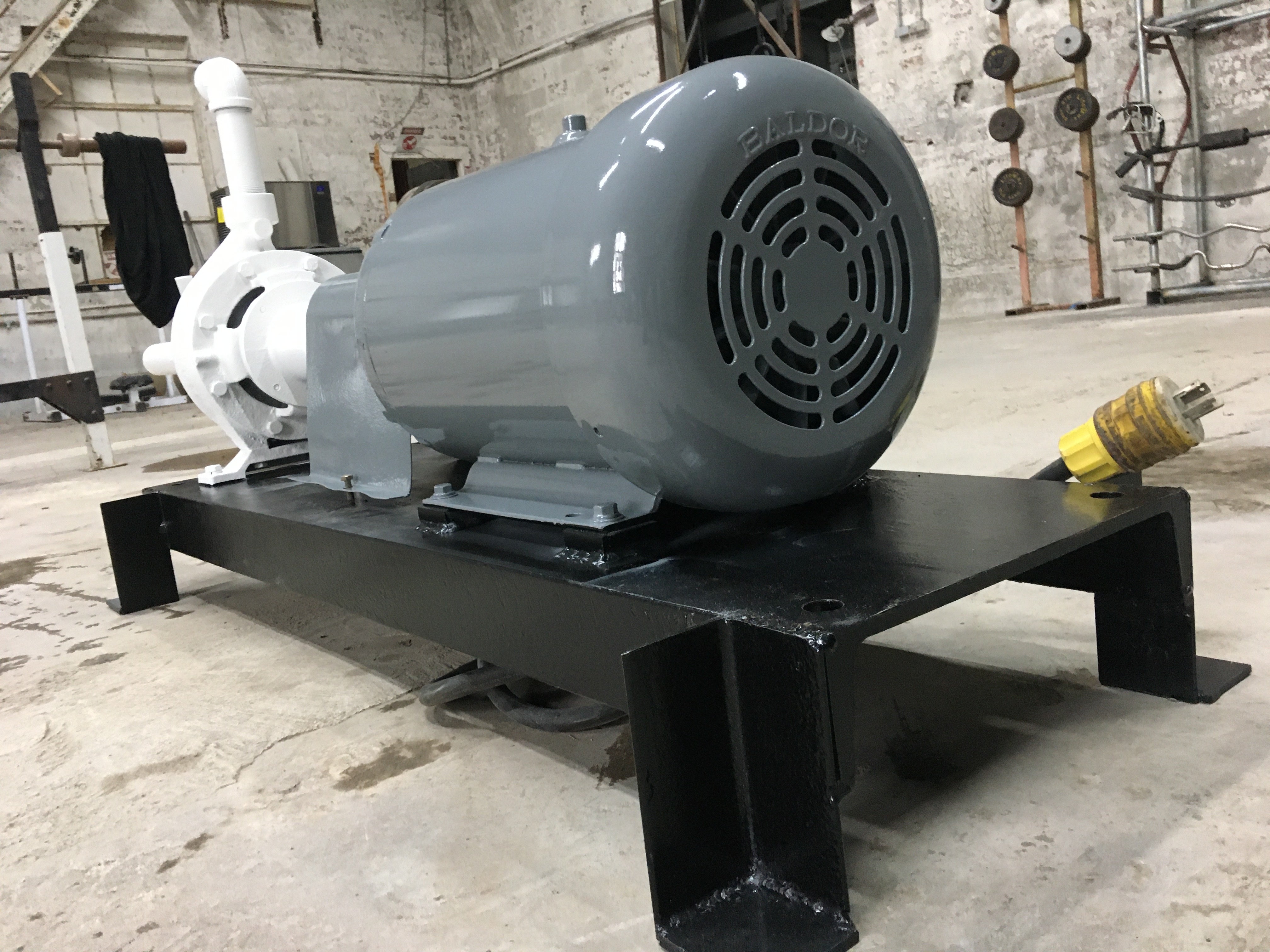 Bomba centrífuga - Montada sobre base de acero dulce. 1-5/8 pulg. NPT x 1-5/8 pulg. NPT. A la bomba le falta la placa de datos de la bomba. Anteriormente, la bomba centrífuga se combinaba con un intercambiador de calor de carcasa y tubos. Motor Baldor - Cat No: CWDDN41906T, Especificaciones: 39J054W846H1, Marco: 256TC, Ser: 09805, Hp: 20, Voltios: 230/460, Amperios 45.4/22.7, Rpm: 3525, Hz: 60, Ph: 3, Clase: F , Código: J, Clasificación: 40C AMB-CONT, Nema Mom. Ef: 91%. Anteriormente funcionaba en una unidad intercambiadora de tubos y calor.