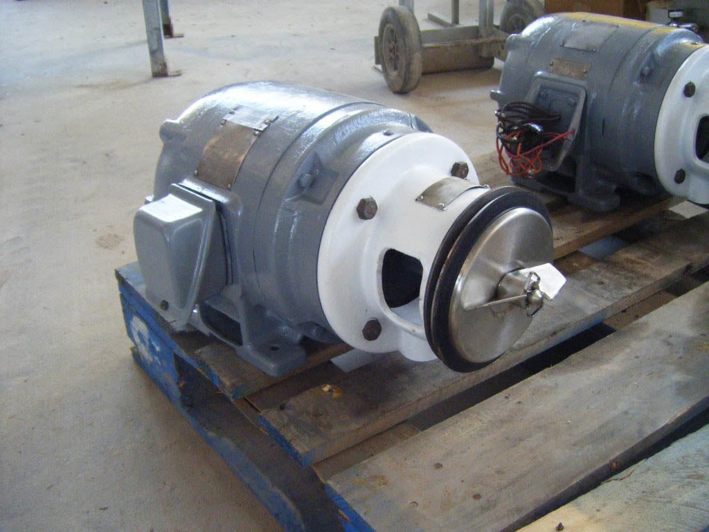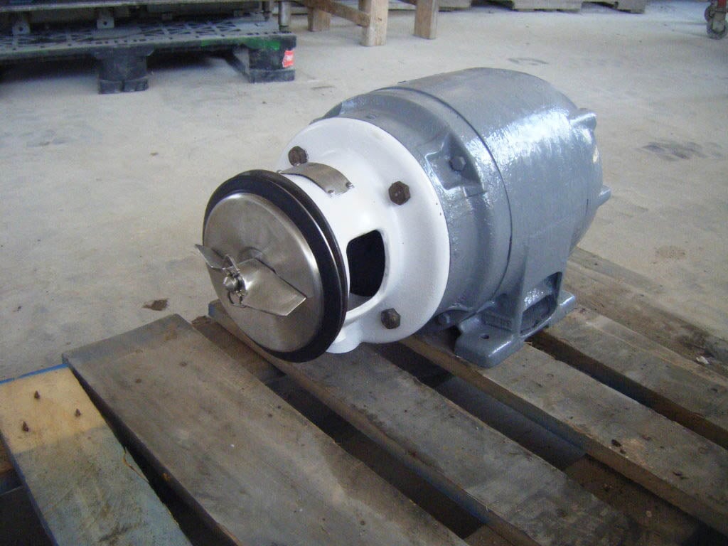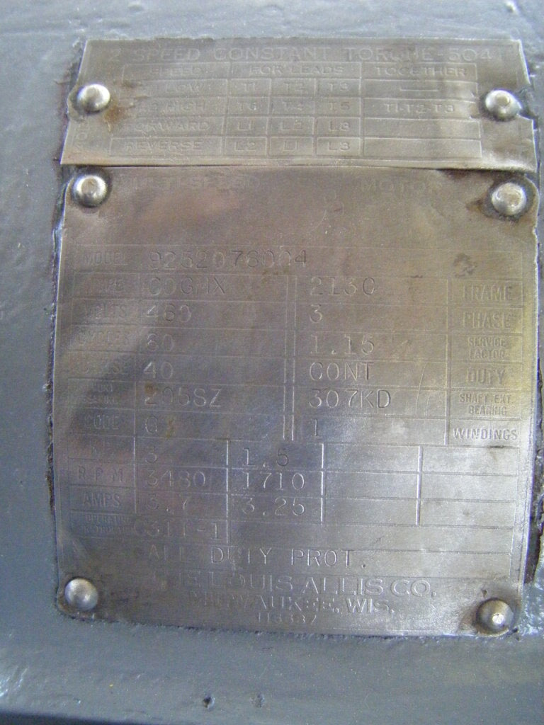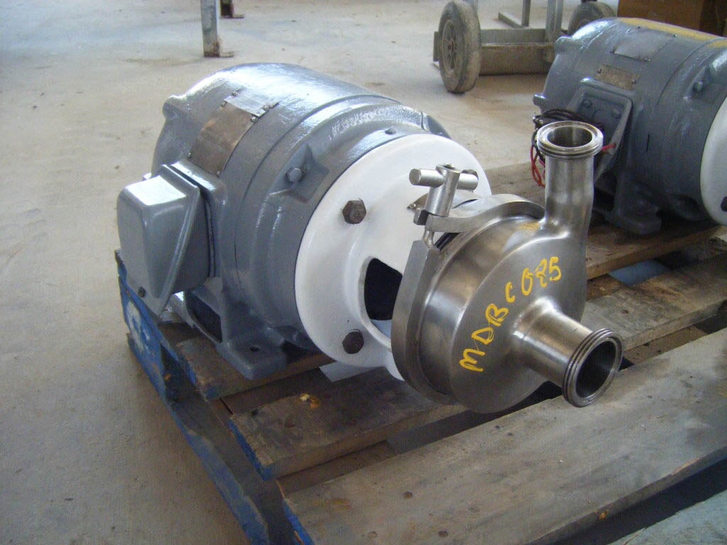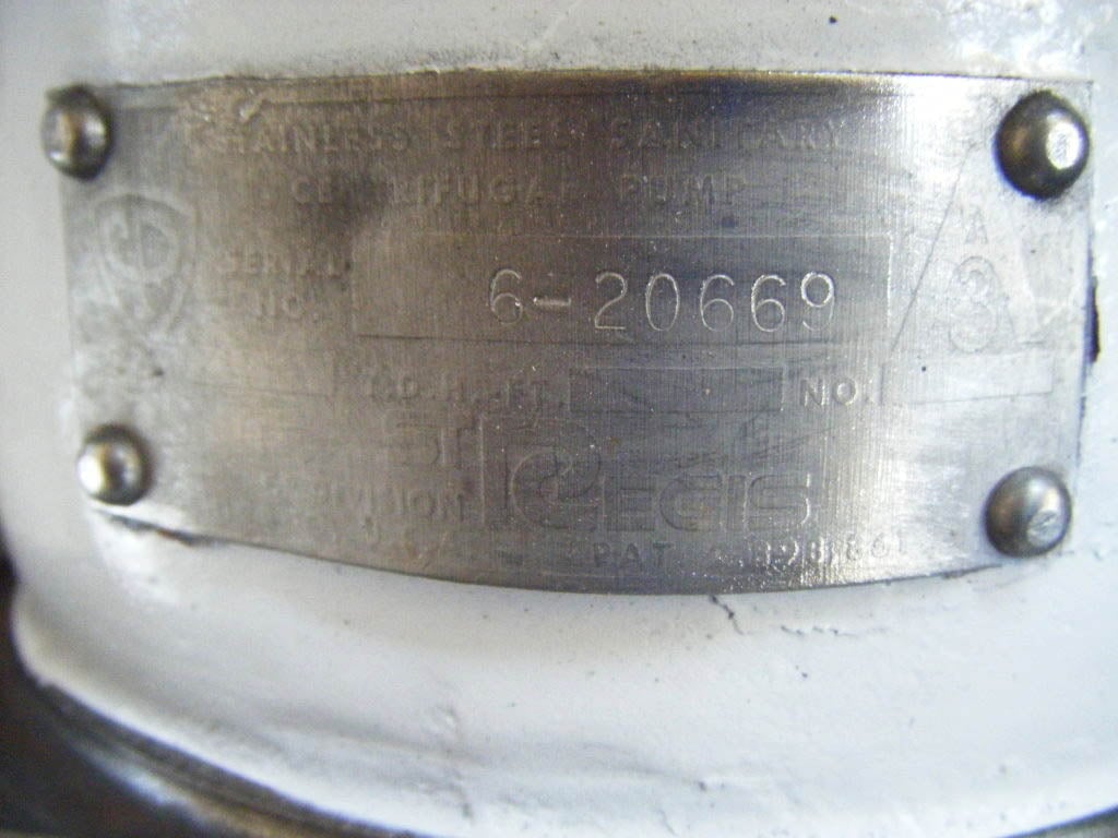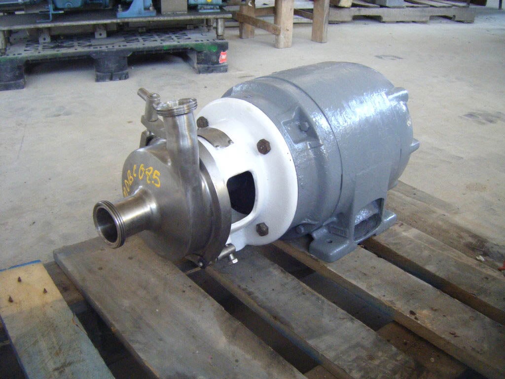 Bomba Centrífuga APV/Crepaco. Modelo: 6. S/N: 6-20669. El caudal de la bomba nueva es de 90 gpm con los caballos de fuerza y la presión requeridos. Discuta con el vendedor su proceso y producto para determinar si esta bomba debe cumplir con su tarea específica. Diámetro del impulsor: motor Louis Allis de 5 pulgadas, 3/1,5 hp, 3480/1710 rpm, 460 V, 3,7/3,25 amperios, 60 Hz, trifásico. Entrada: (1) conector ACME de 2 pulg. Salida: (1) conector ACME de 1-1/2 pulg. Dimensiones totales: 1 pie 9-1/2 pulg. de largo x 1 pie 1 pulg. de ancho x 11 pulg. de alto (ACN26)