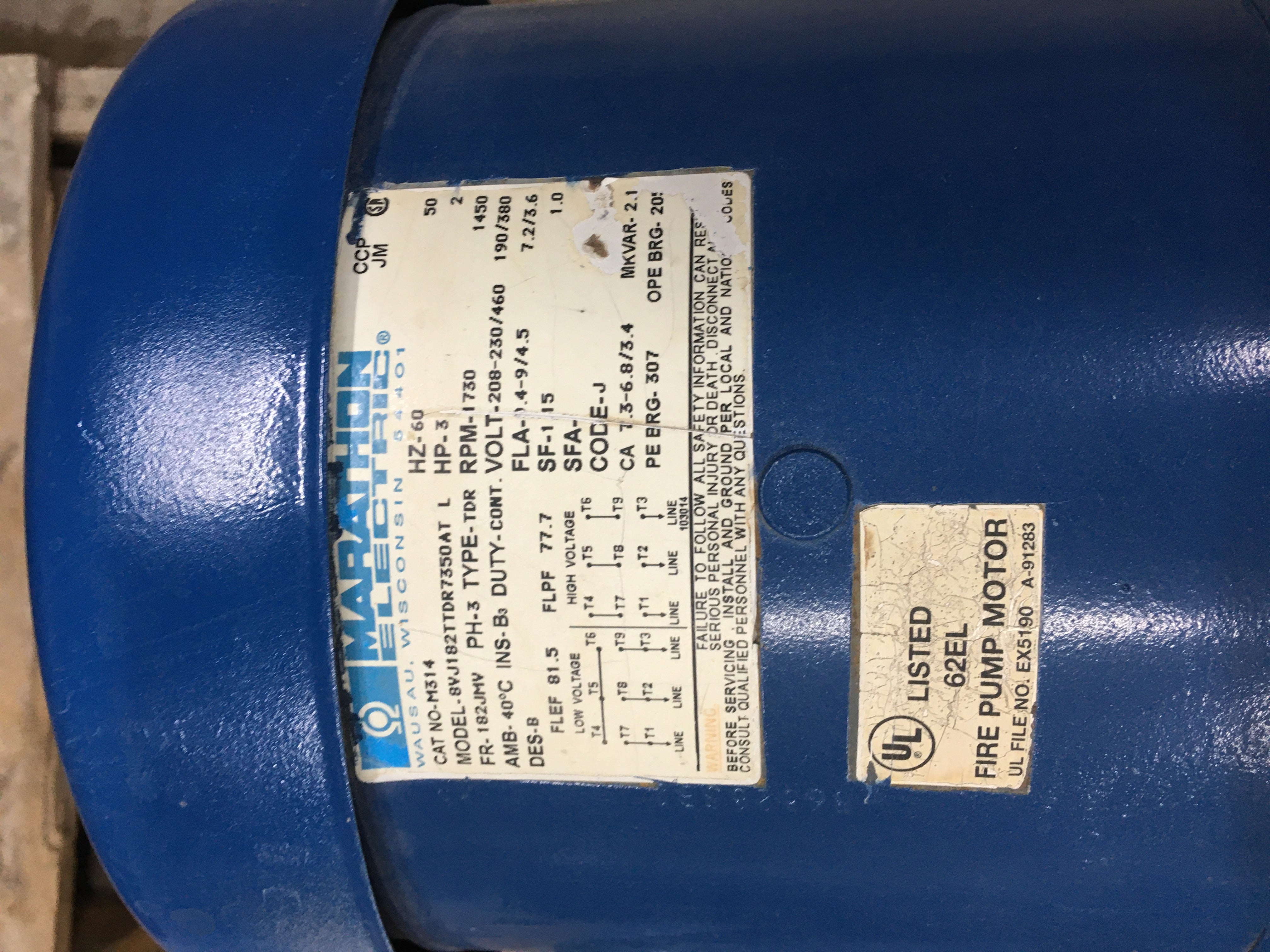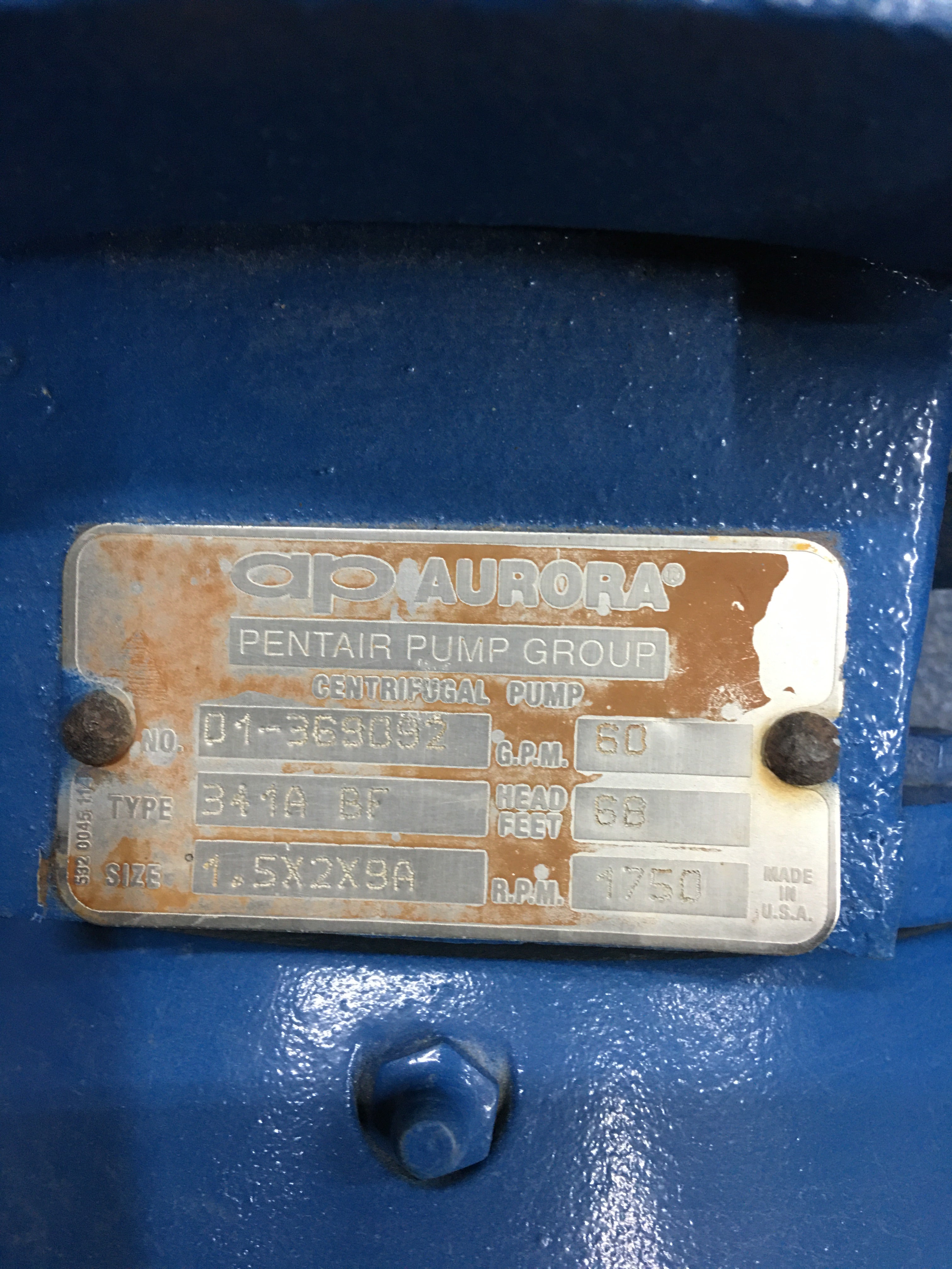 Bomba centrífuga Aurora: Número de serie: 93-6067, Tipo: 344A BF, Tamaño: 1,5 x 2 x 9 A, GPM: 60, Pies de cabeza: 68, Rpm: 1750. Equipado con bronce de hierro fundido. Motor eléctrico Marathon: CatNo: M314, Modelo 8VJ182TTDR7350AT L, Fr: 182JMV, Ph: 3, Tipo: TDR, Amperaje: 40 C, Ins: B, Servicio: Cont, Hz: 60, Hp: 3, Rpm: 1730, Voltios : 208-230/460, Fla: 0.4-9/4.5, SF: 1.15, Código: J.